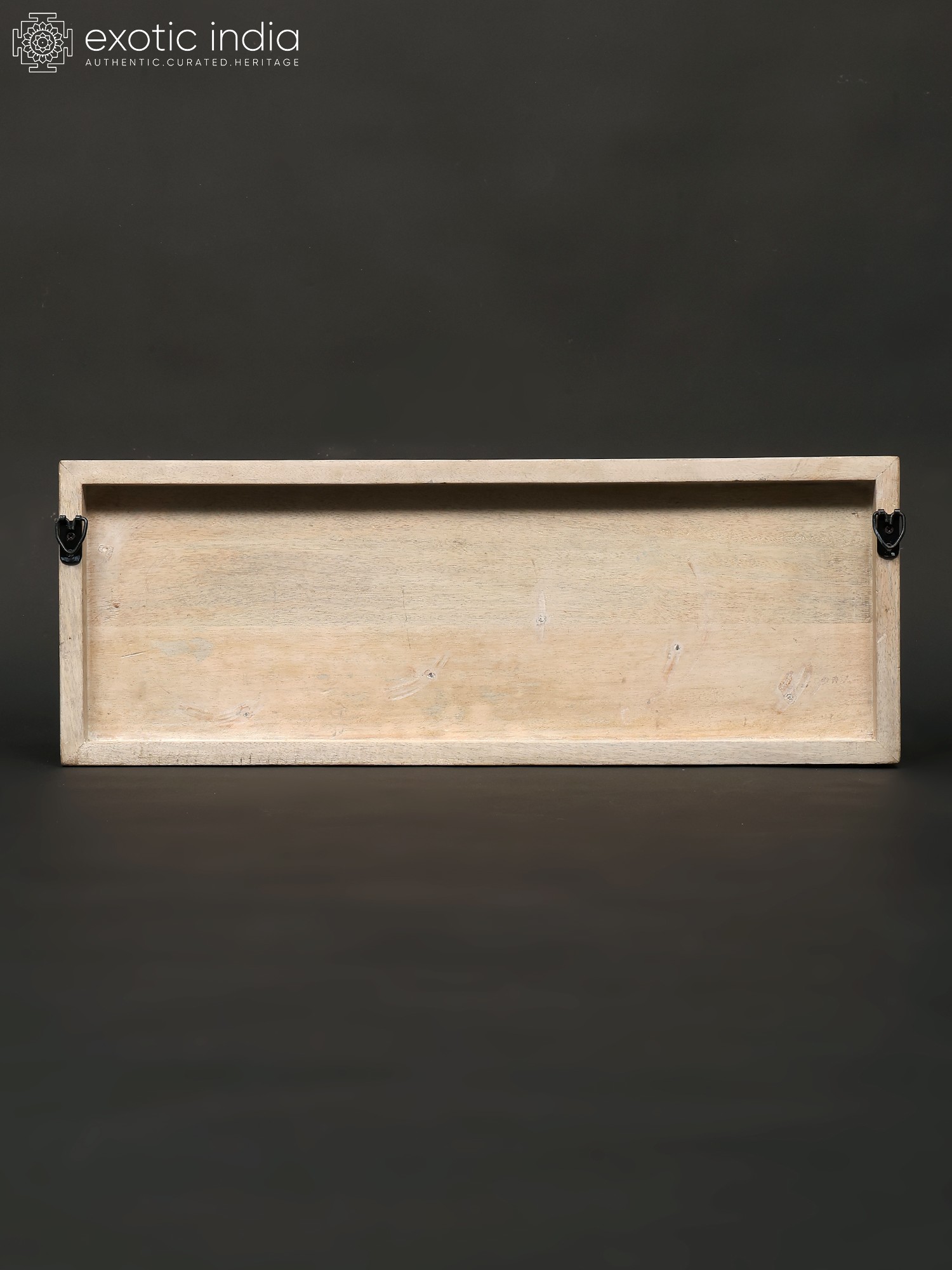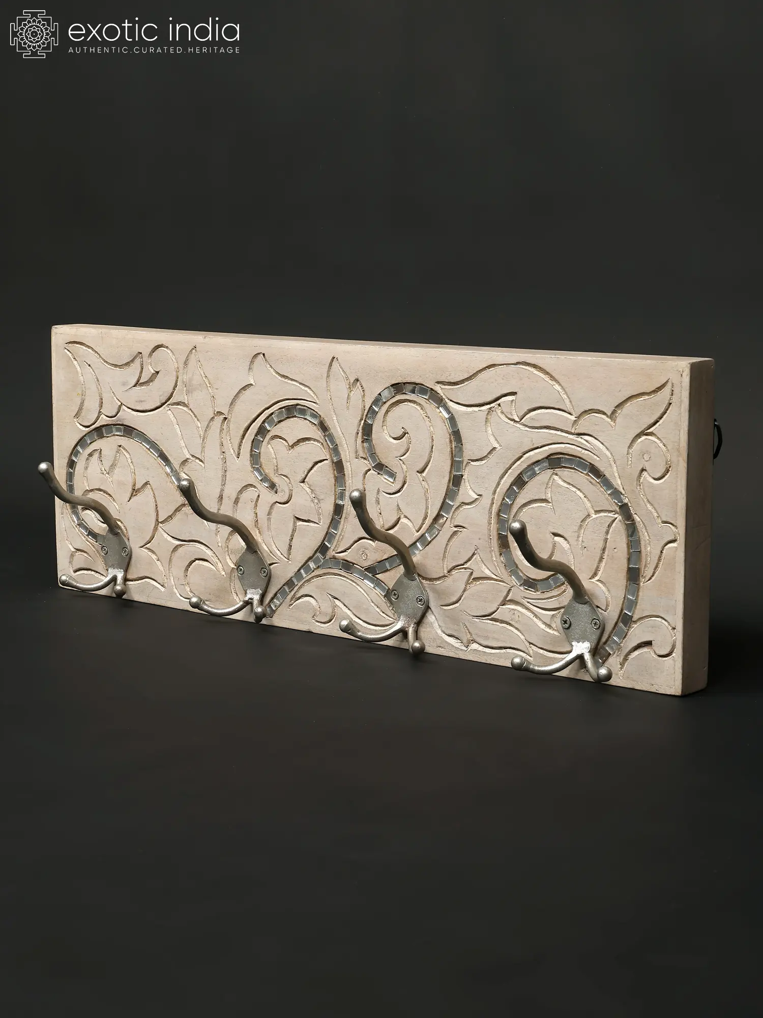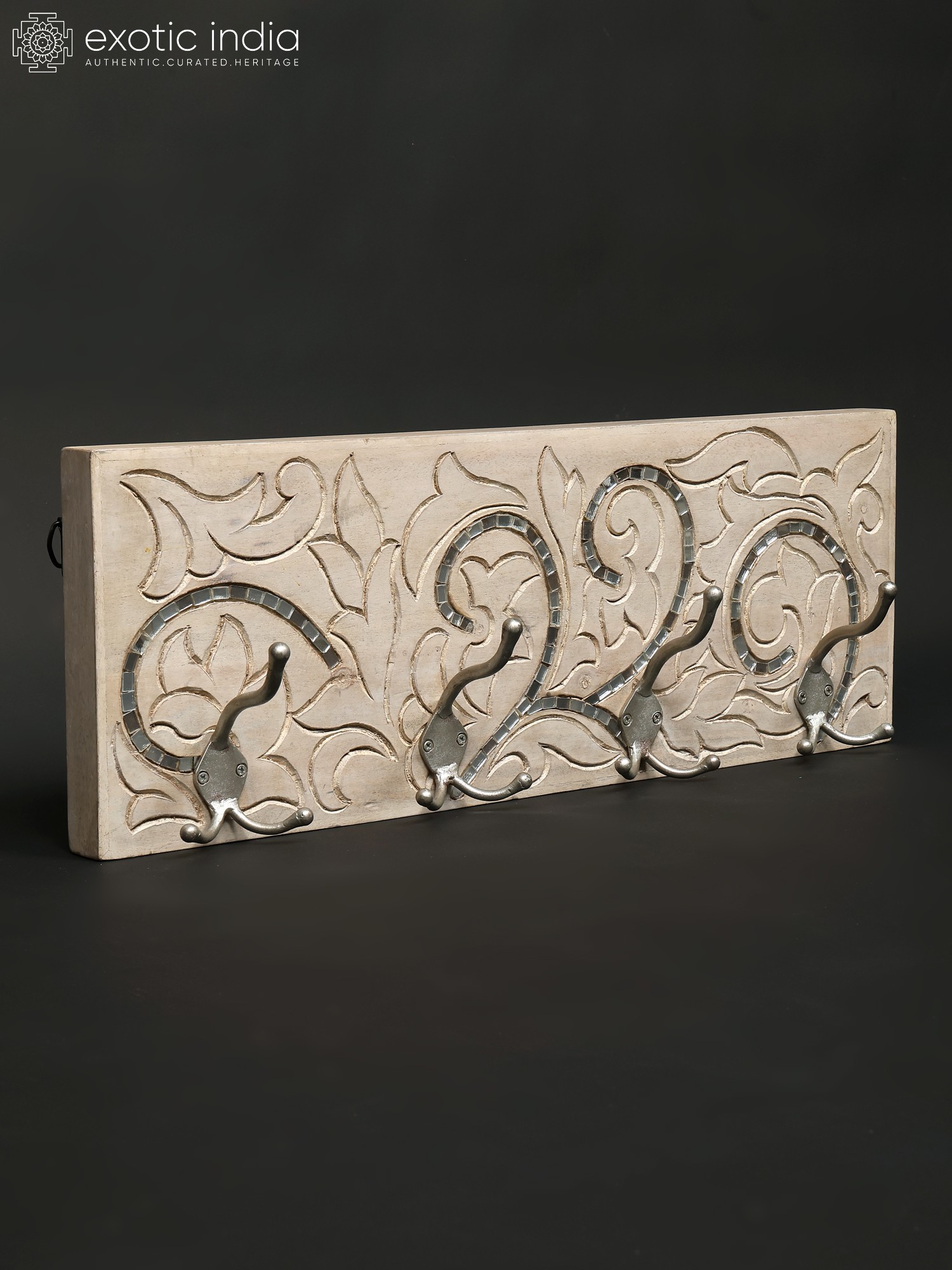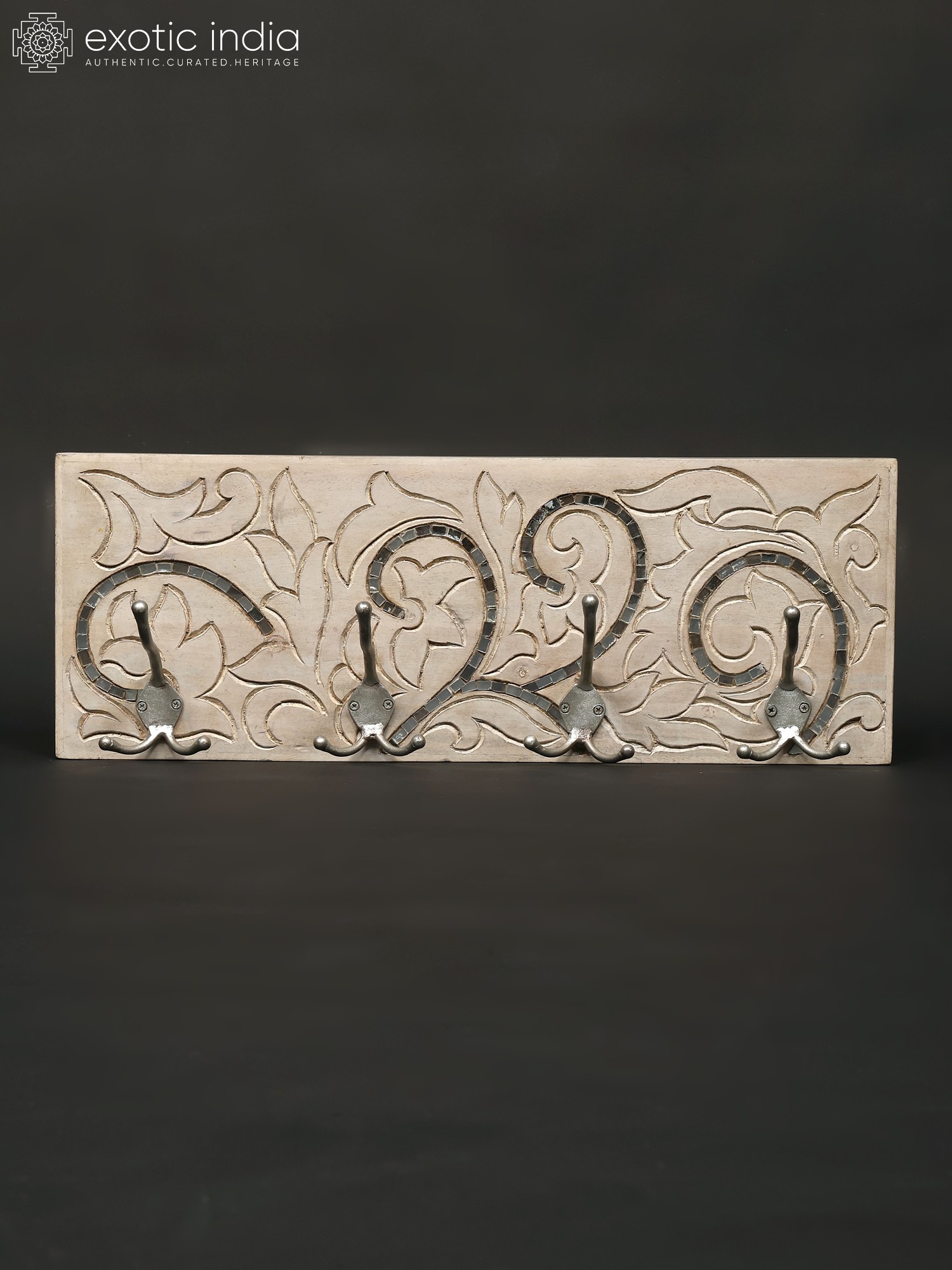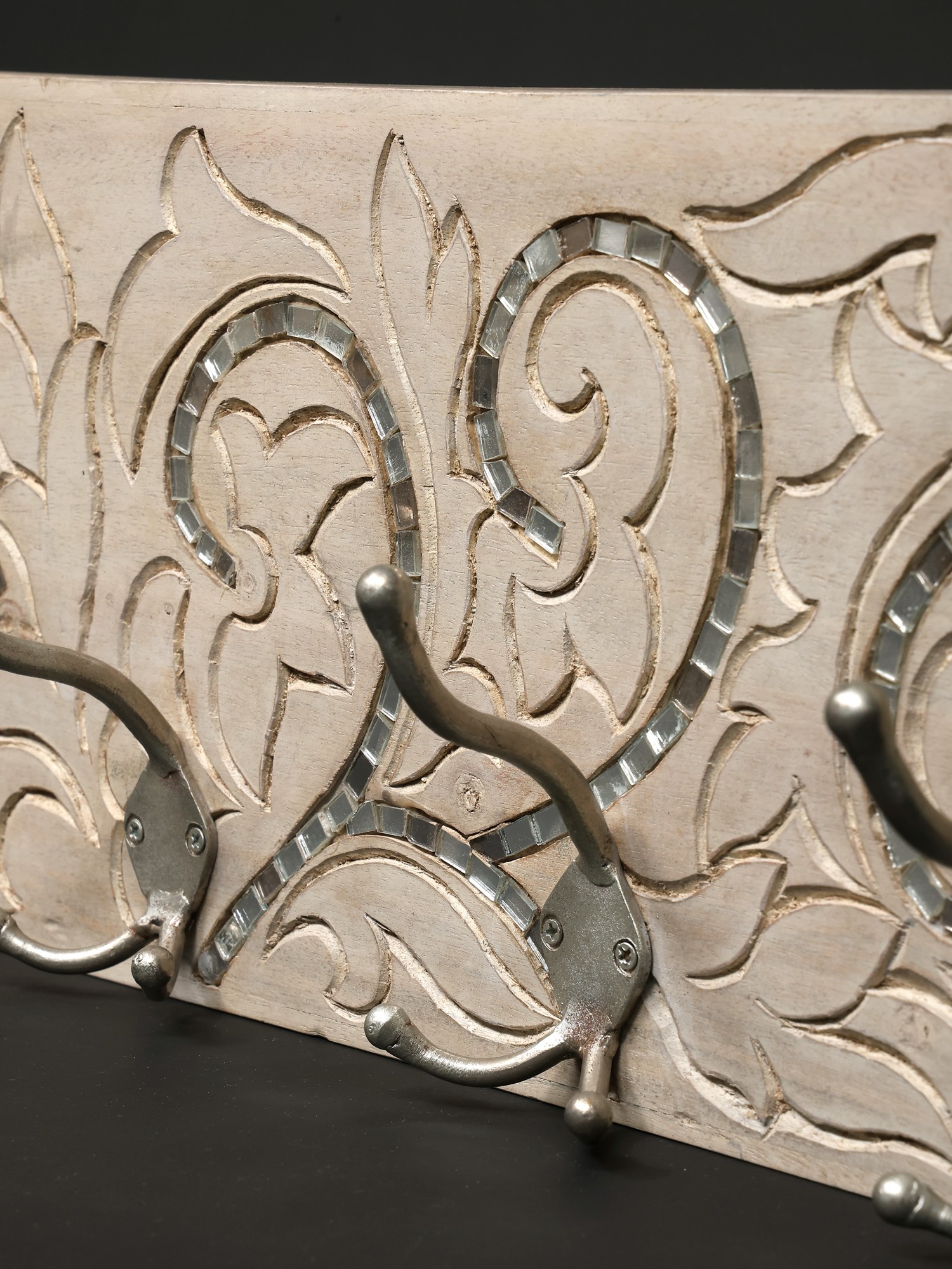 The foundation of this stunning piece is a sturdy wooden plank, adorned with delicately carved details. The light, neutral finish allows the texture and depth of the carving to truly shine, making it a subtle yet eye-catching feature. The design features swirling floral motifs that bring a touch of nature indoors. Complementing the wood's natural beauty are four durable iron hooks. Their curved design adds an additional layer of visual interest while offering ample space for hanging various items. The metallic finish of the hooks provides a striking contrast against the wood, creating a balanced and harmonious aesthetic.