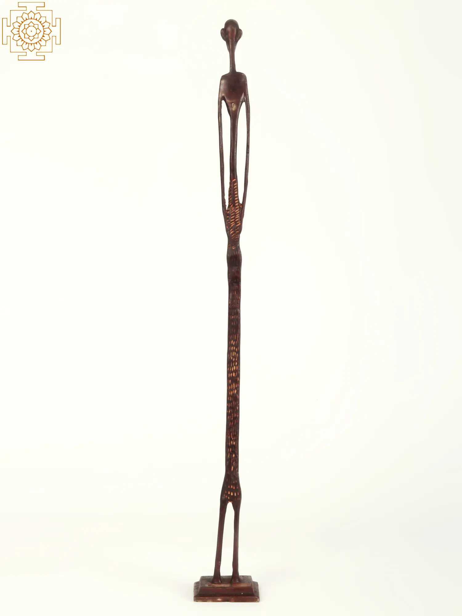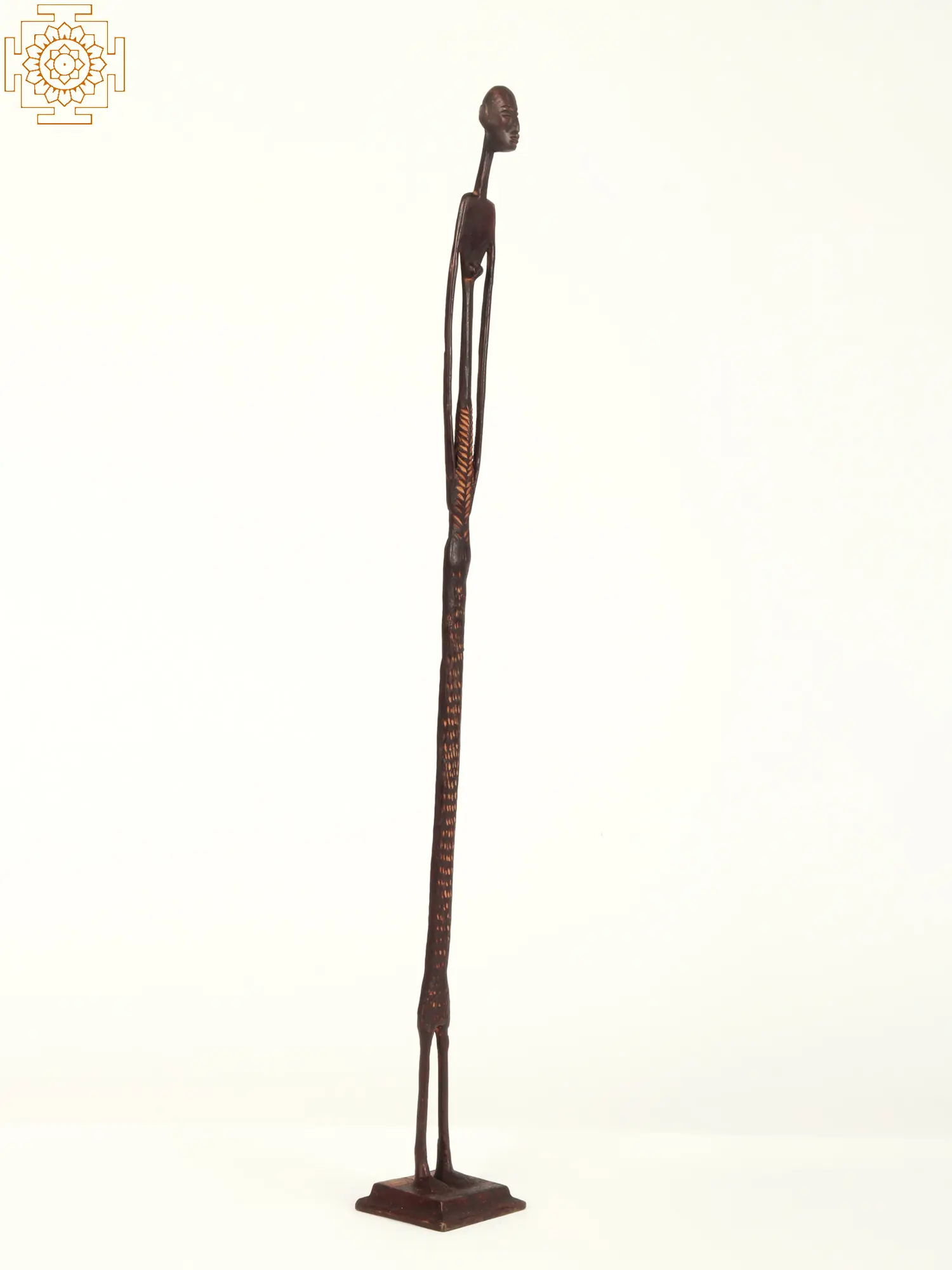 Artists from different continents take inspiration from each other's art and create items that may be considered a tribute to the original artist. Here in this brass statue, the artist from India has tried to imitate the Nyamwezi Stick Figures from Africa. The cultural allure of this Brass Tall Tribal African Woman Statue is inspired by the Nyamwezi Stick Figure tradition of Tanzania and is eye-catching. This exquisite piece reflects the Nyamwezi carvers' mastery, renowned for their slender, elongated figures carved from dark hardwood.