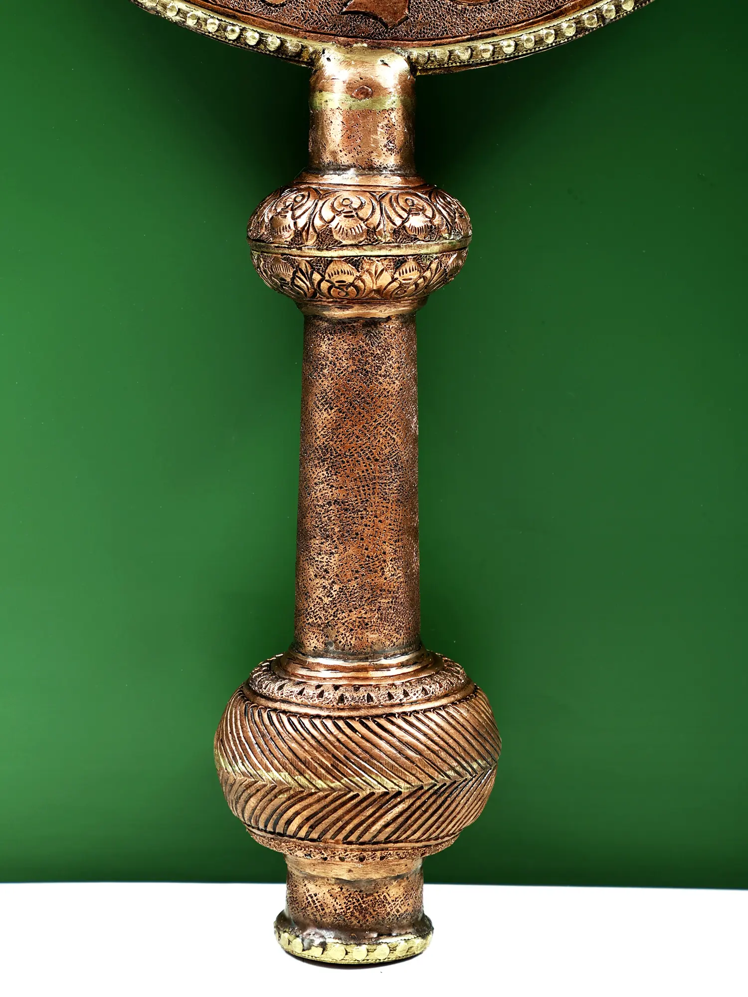 The central motif of the hand is rendered with breathtaking detail, each finger and the palm meticulously carved with ornate Arabic inscriptions. These elegant calligraphic patterns are interwoven with delicate floral and geometric motifs, creating a mesmerizing tapestry of design that draws the eye and invites contemplation. The circular frame surrounding the hand is equally ornate, showcasing a continuous flow of decorative elements that enhance the overall aesthetic appeal. The rich, warm hue of the copper is highlighted by the masterful sculpting, giving the Alam a timeless and dignified presence. The sturdy handle, also adorned with decorative bands, ensures stability and adds to the piece's commanding stature.