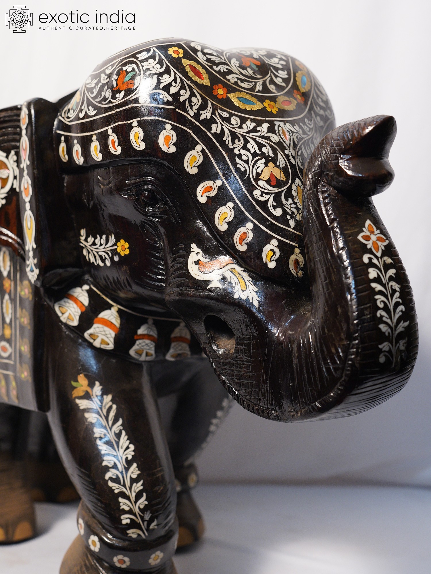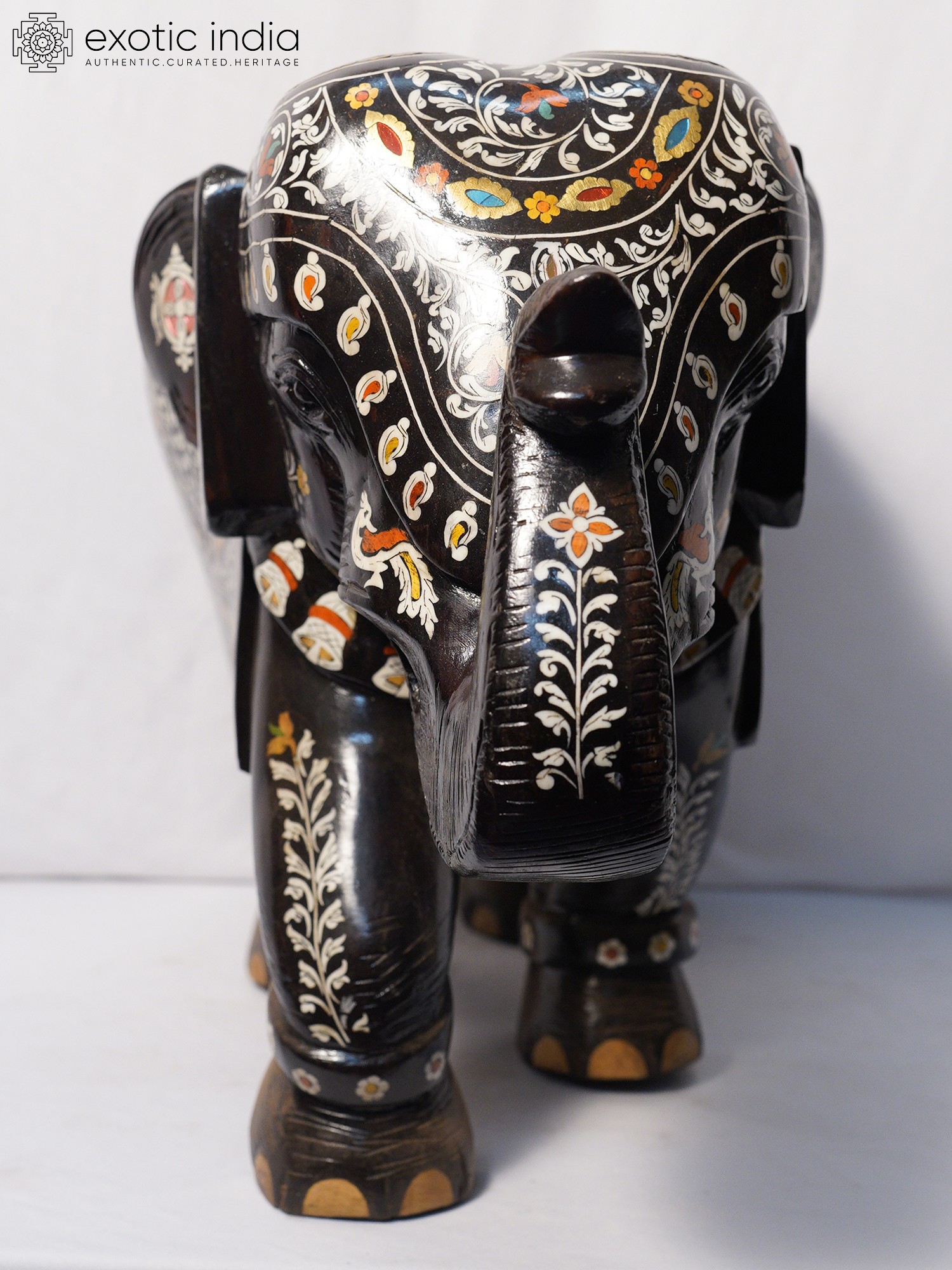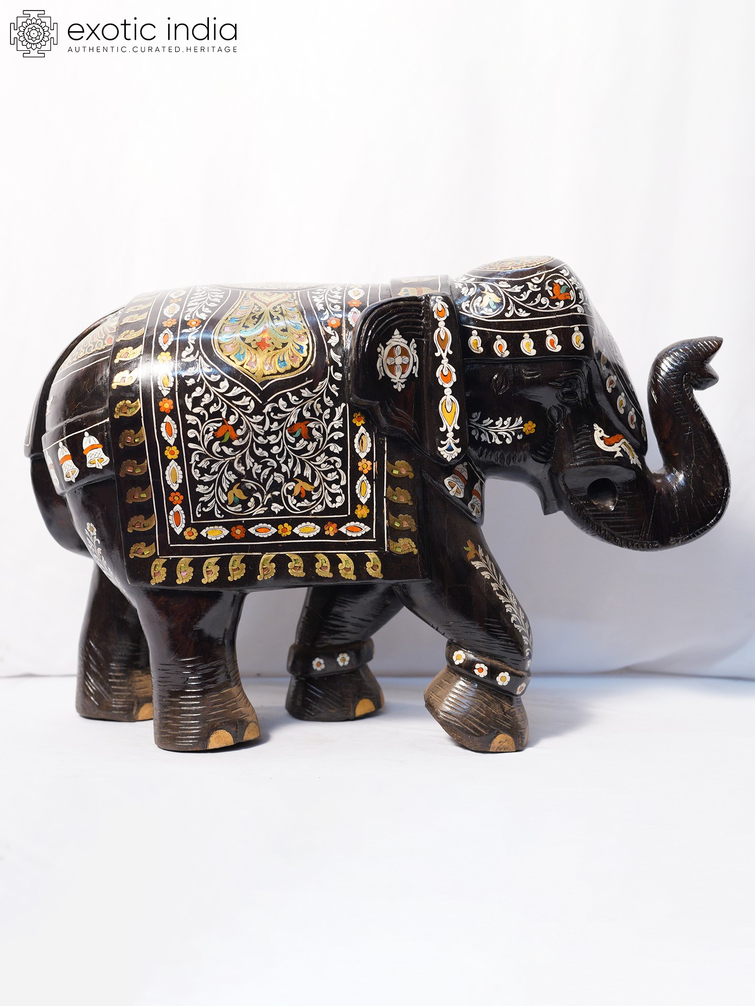 This remarkable piece showcases the beauty of handcraftsmanship. The elephant is carved from rich rosewood, known for its durability and beautiful grain. The dark hue of the wood provides a striking canvas for the intricate brass inlay work that adorns the statue. Each design element is carefully embedded, creating a stunning contrast and adding a touch of opulence. The inlaid patterns feature floral motifs and stylized designs, reflecting traditional artistic styles. The craftsmanship displayed in the details elevates this piece beyond a simple figurine, transforming it into a true work of art. The trunk of the elephant is gracefully curved upwards, symbolizing good luck and prosperity. The intricate detailing on the forehead and around the ears further enhances the statue’s regal appearance.