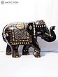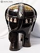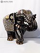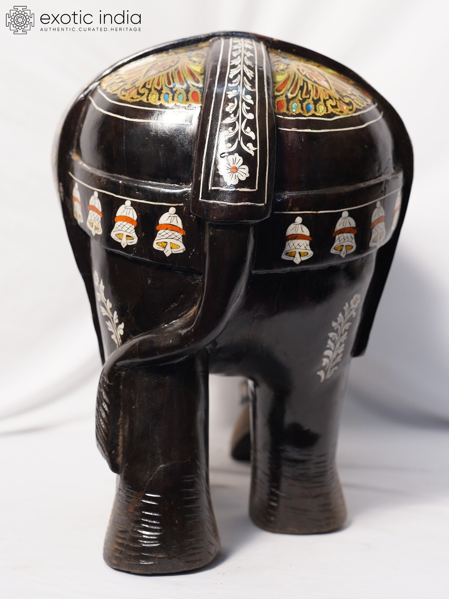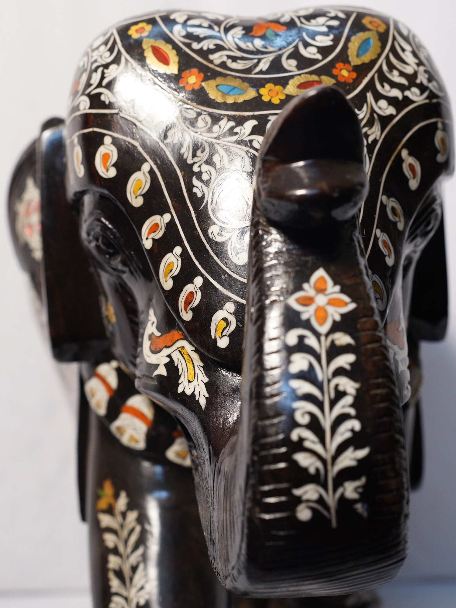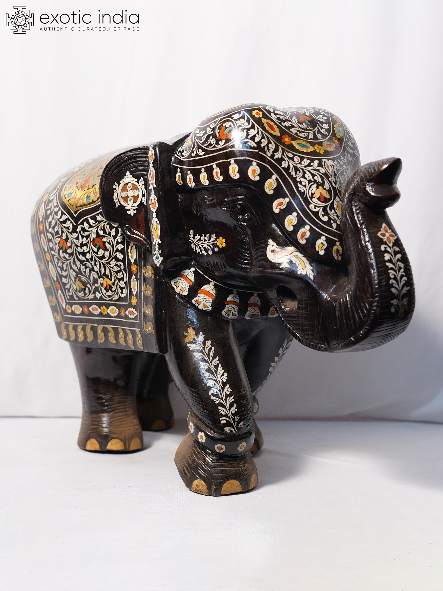 This remarkable piece showcases the beauty of handcraftsmanship. The elephant is carved from rich rosewood, known for its durability and beautiful grain. The dark hue of the wood provides a striking canvas for the intricate brass inlay work that adorns the statue. Each design element is carefully embedded, creating a stunning contrast and adding a touch of opulence. The inlaid patterns feature floral motifs and stylized designs, reflecting traditional artistic styles. The craftsmanship displayed in the details elevates this piece beyond a simple figurine, transforming it into a true work of art. The trunk of the elephant is gracefully curved upwards, symbolizing good luck and prosperity. The intricate detailing on the forehead and around the ears further enhances the statue’s regal appearance.