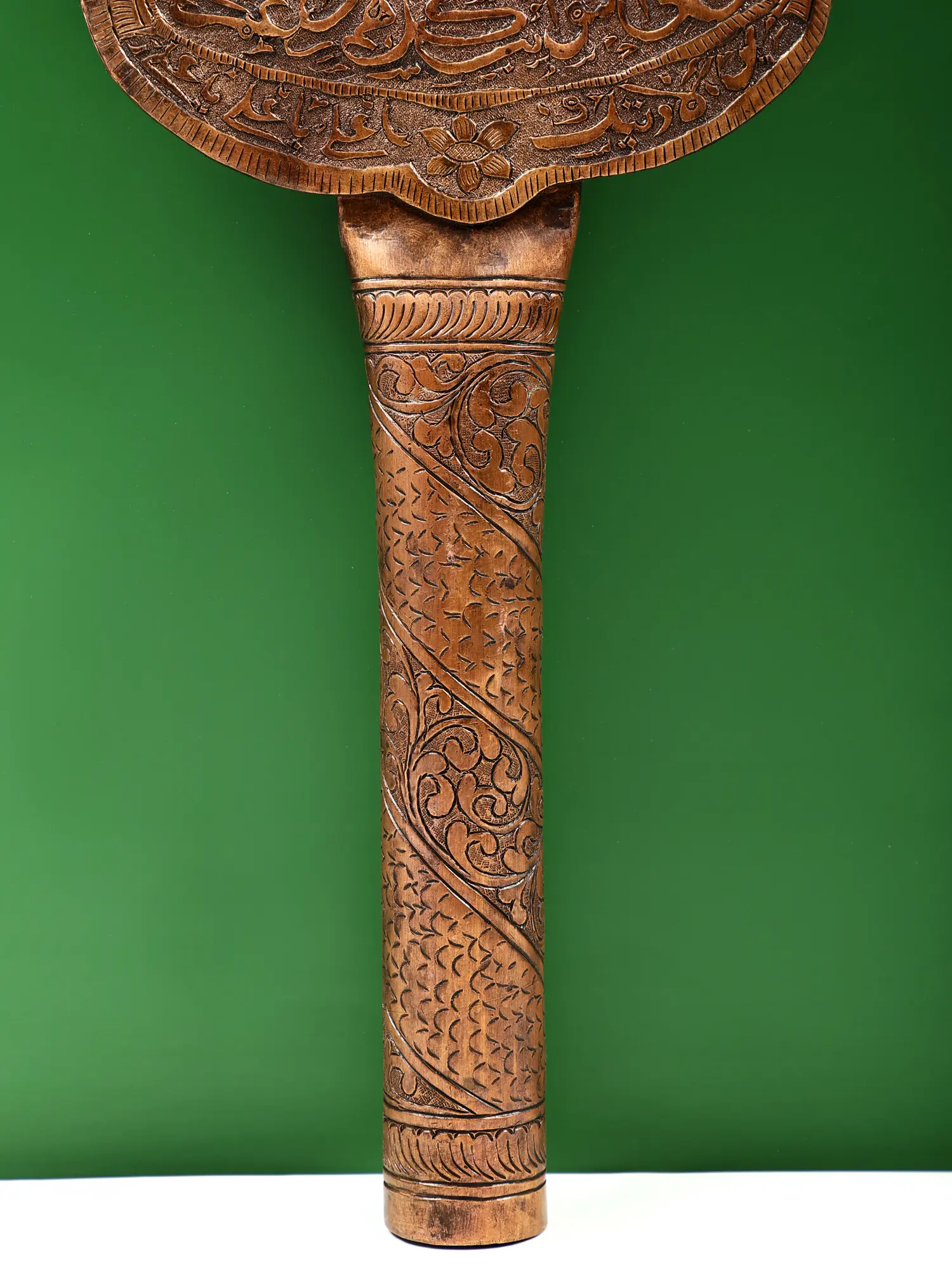 Each curve and inscription on this piece is a testament to the skill of artisans who have honed their craft over generations. The warm, inviting hue of the copper is enhanced by the detailed repoussé work, creating a tactile and visual experience. The surface is adorned with flowing Arabic calligraphy, interwoven with elegant floral motifs, demonstrating a mastery of metal artistry. The design culminates in a symbolic hand, a powerful emblem of faith and protection, with each finger individually shaped and articulated. The stem is equally detailed, featuring a repeating pattern that adds to the overall aesthetic appeal and structural integrity. This handcrafted copper alam is more than just a decorative object; it is a vessel of tradition and devotion. Its substantial nature and the inherent beauty of the copper suggest a piece designed to be cherished and passed down, connecting contemporary spaces with ancient traditions of craftsmanship and spirituality. Its impressive stature ensures it will be noticed and appreciated, adding a unique character to your living space, study, or place of worship.