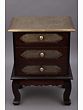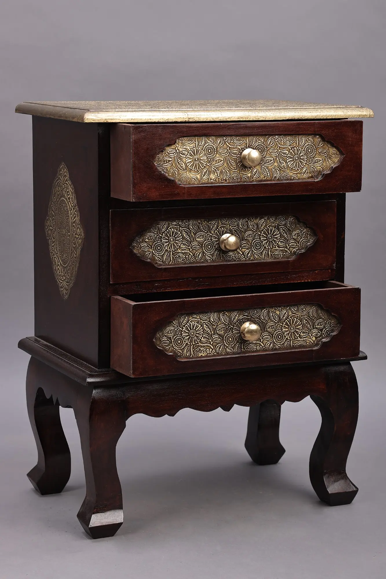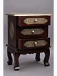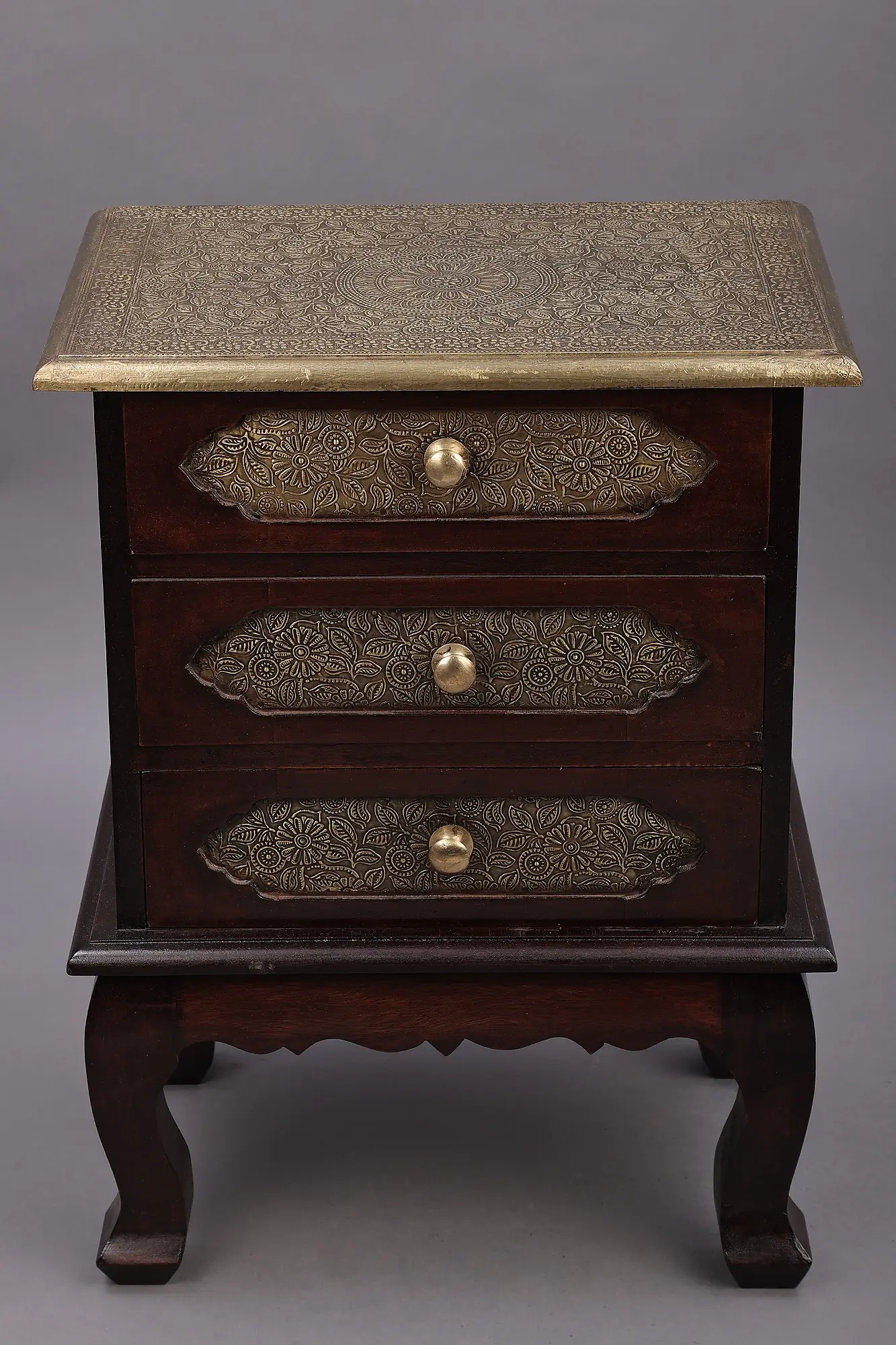 This Wooden Hand Carved Side Table featuring Three Drawers is a unique utility object that carries elegance of ages. Crafted with meticulous precision, this wooden masterpiece showcases the intricate beauty of brass embossed work inspired by the timeless bael buta design. The tabletop, a canvas of art, is adorned with a symphony of details, while four legs provide stability and grace. As a functional and visually enchanting piece, this side table weaves together the warmth of wood and the regality of brass, bringing the essence of craftsmanship into your home. Elevate your décor with this harmonious blend of utility and artistic expression.
