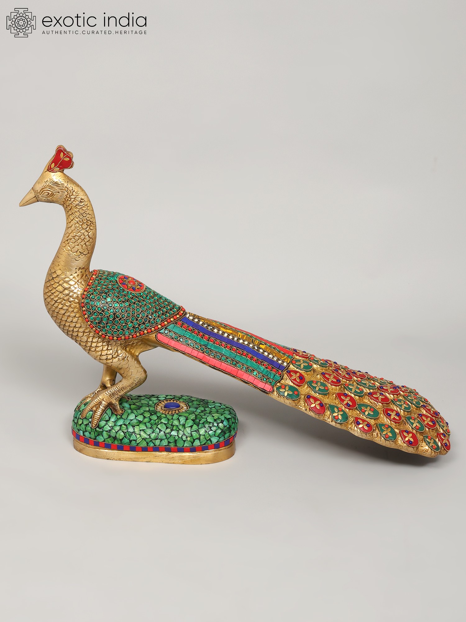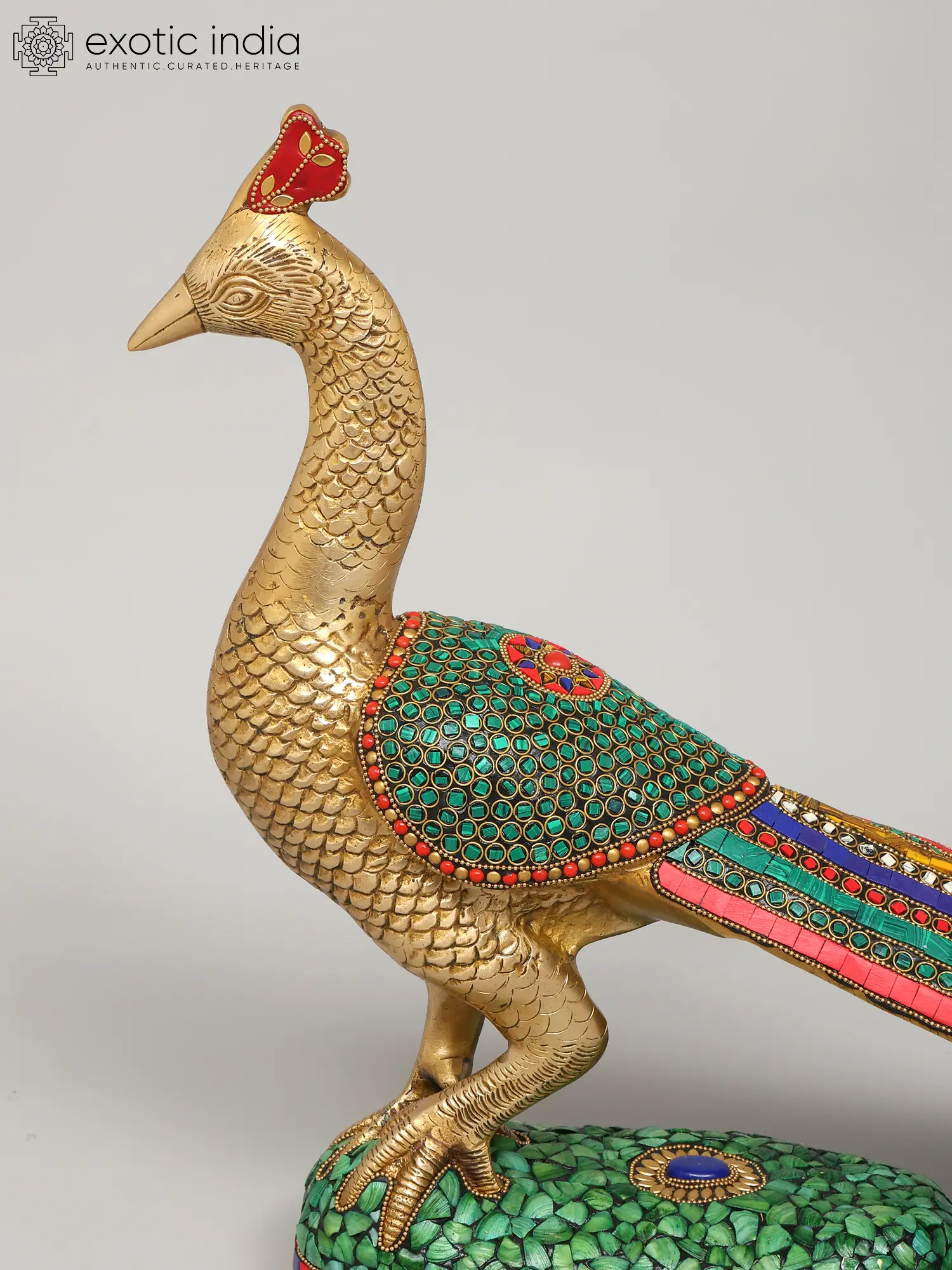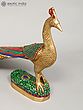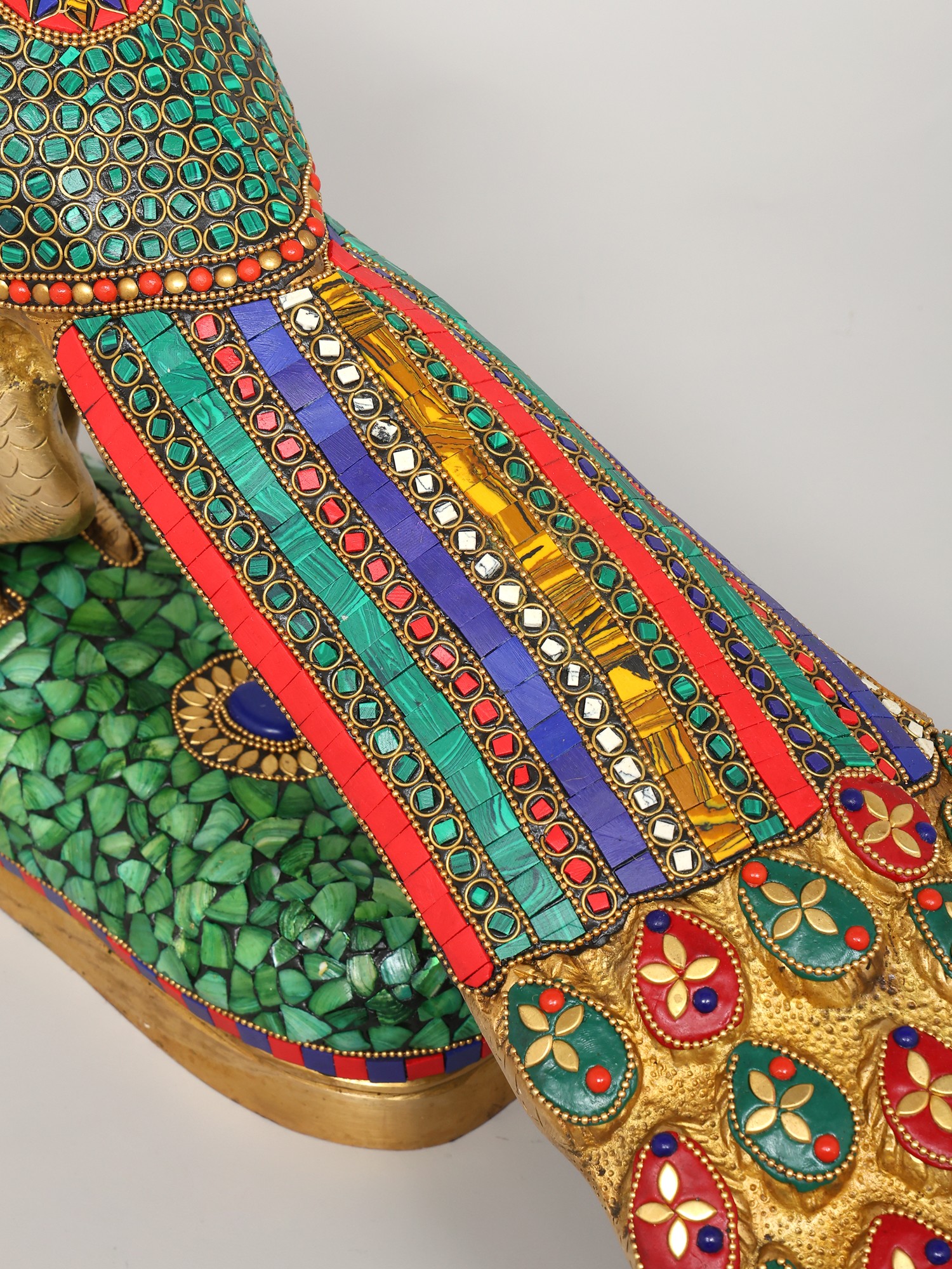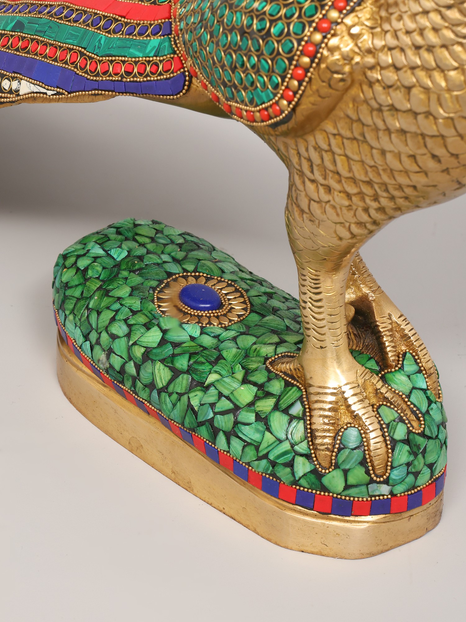 This stunning peacock statue has been masterfully brought to life using the time-honored technique of brass casting, resulting in a piece that is both durable and aesthetically pleasing. The rich golden hue of the brass complements the intricate inlay work that adorns the bird's body and tail. Adding to the visual appeal are painstakingly embedded stones, skillfully placed to capture the mesmerizing quality that makes this bird famous. The statue is mounted on a pedestal also detailed with a mosaic of stones in various hues. Each stone is carefully positioned, creating a mesmerizing pattern of color and light that enhances the overall visual impact.