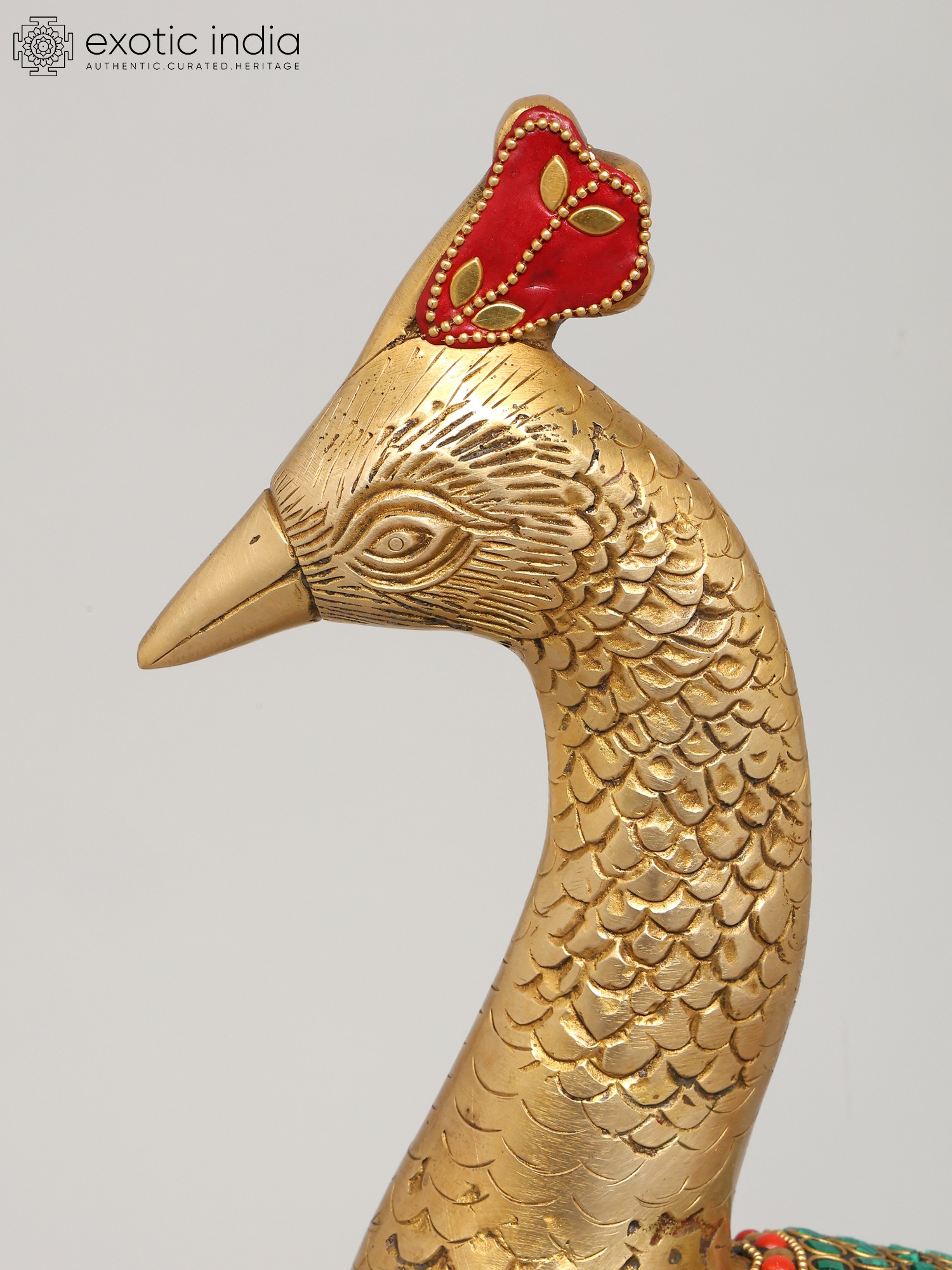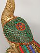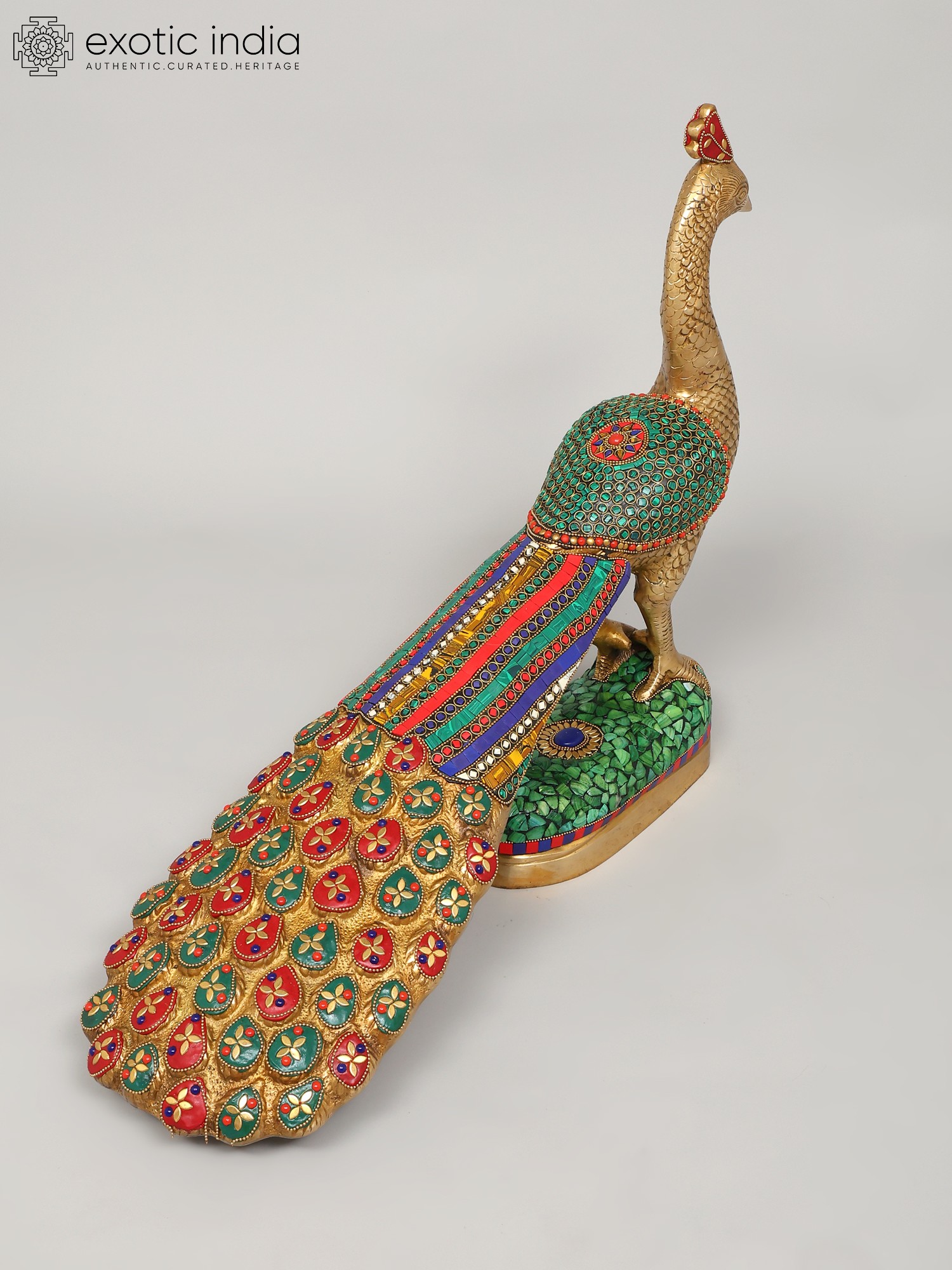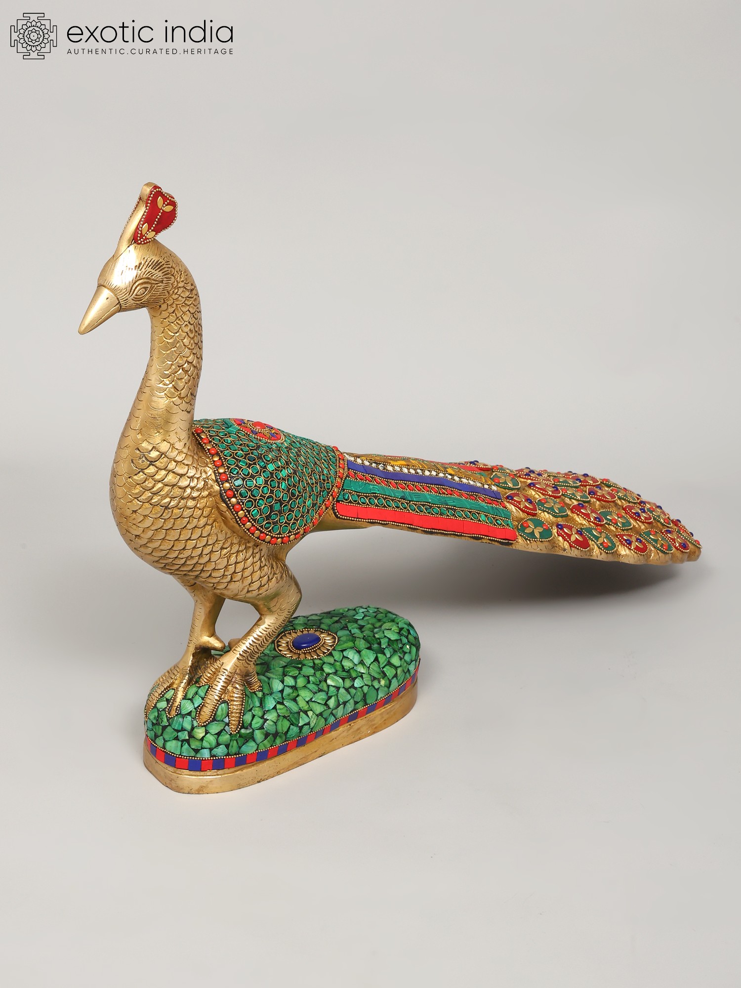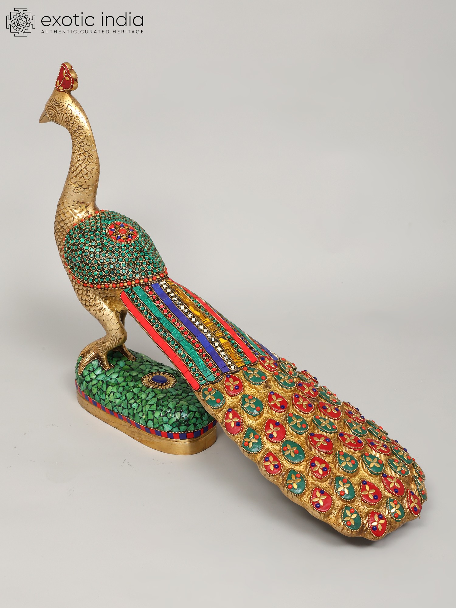 This stunning peacock statue has been masterfully brought to life using the time-honored technique of brass casting, resulting in a piece that is both durable and aesthetically pleasing. The rich golden hue of the brass complements the intricate inlay work that adorns the bird's body and tail. Adding to the visual appeal are painstakingly embedded stones, skillfully placed to capture the mesmerizing quality that makes this bird famous. The statue is mounted on a pedestal also detailed with a mosaic of stones in various hues. Each stone is carefully positioned, creating a mesmerizing pattern of color and light that enhances the overall visual impact.