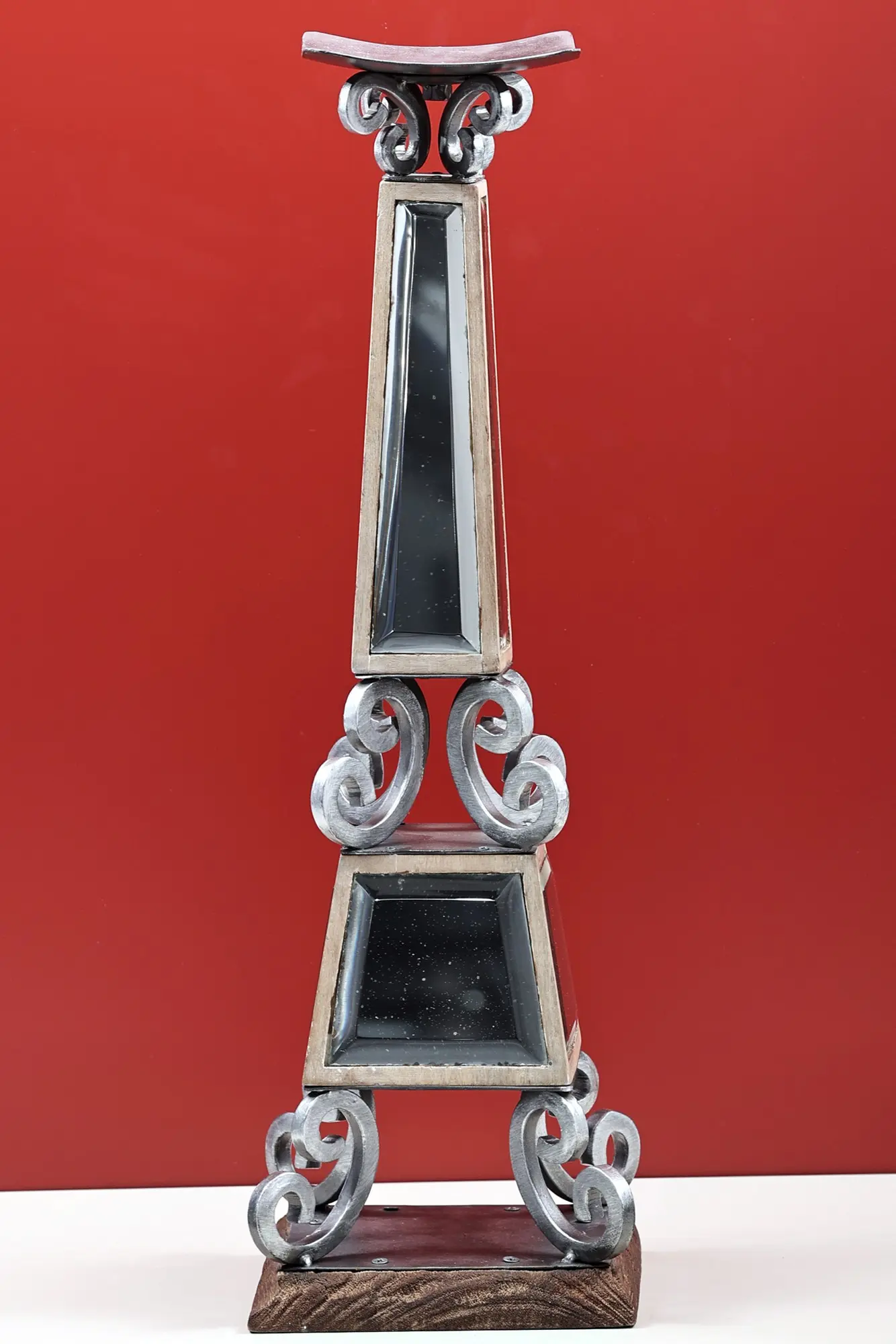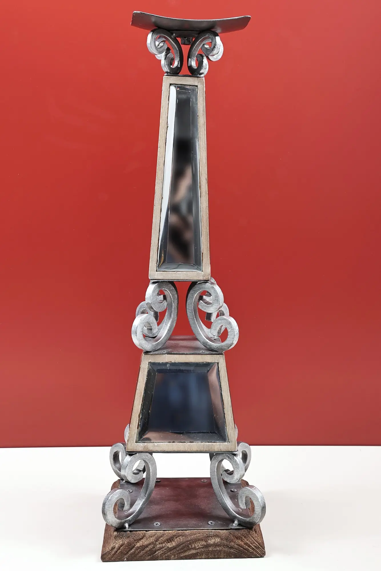Enliven your living space with a piece that seamlessly blends rustic charm with elegant design. This eye-catching candle stand is more than just a functional item; it's a statement piece that will draw attention and spark conversation. Its distinctive construction showcases a harmonious blend of natural wood, robust iron, and reflective glass, resulting in a truly unique and captivating aesthetic. The earthy tones of the wooden base provide a grounding contrast to the polished ironwork and shimmering glass elements.