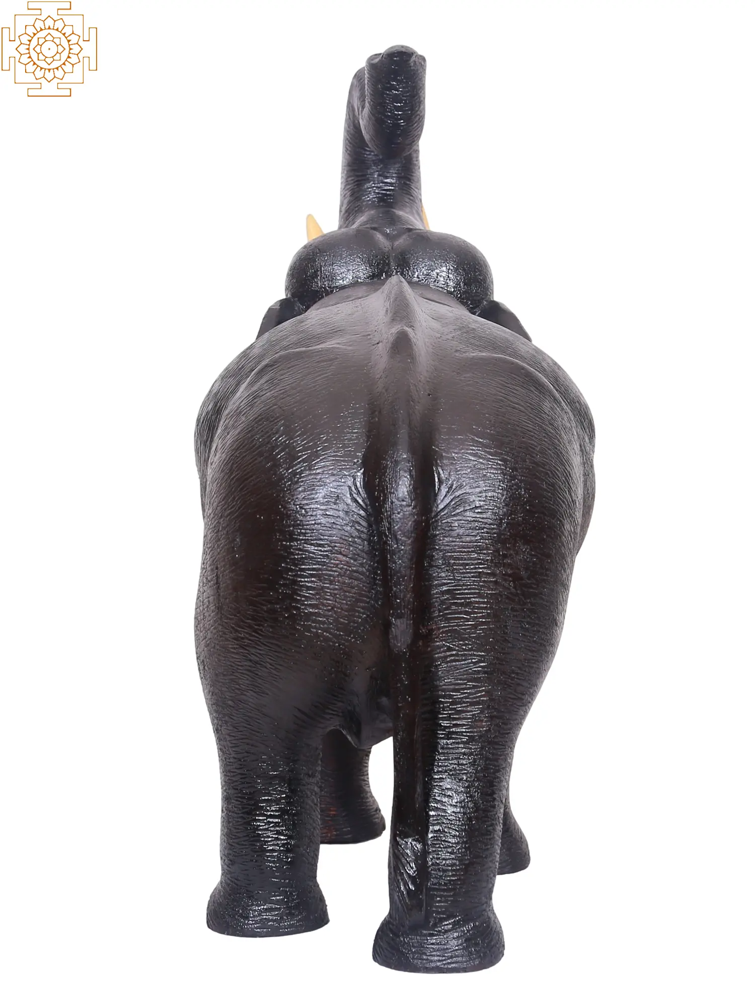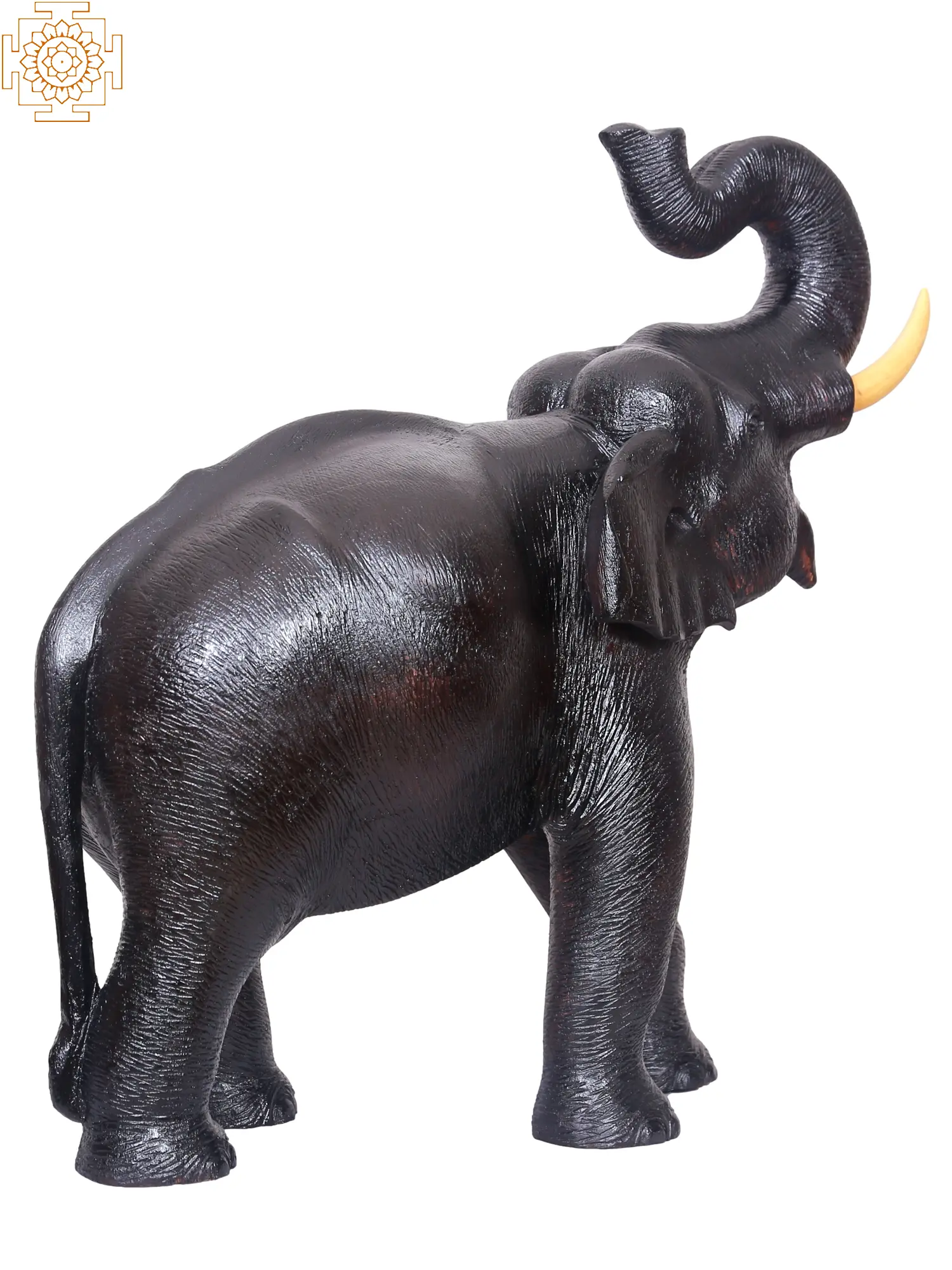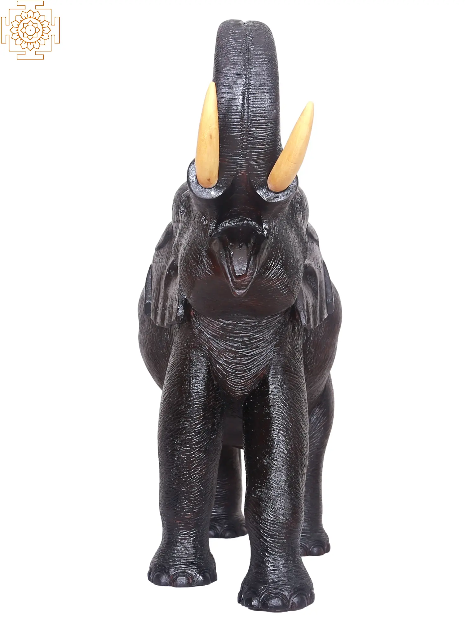 The charm of this exquisite wooden statue depicting an elephant with its trunk joyfully raised is a feast to the naked eye. In our culture, an elephant with its trunk up is considered highly auspicious and symbolizes good luck, wisdom, and prosperity. This beautifully crafted sculpture captures the gentle and majestic nature of elephants, revered as sacred animals. The intricately carved details bring the wooden sculpture to life, showcasing the texture and strength of an elephant's skin. With its symbolic meaning and artistic craftsmanship, this statue serves as a powerful symbol of positivity and abundance, making it a cherished addition to any space.