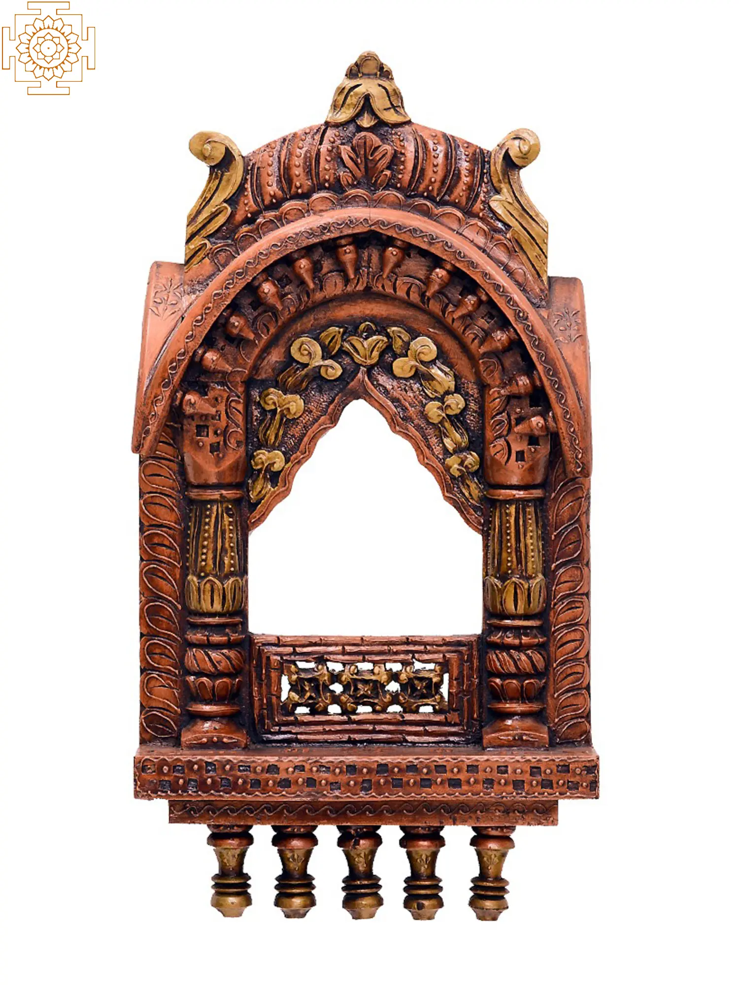 In traditional Indian havelis and homes, a Jharokha serves as the occupants' private window to the outside world. This wooden Jharokha has been constructed with a colorful finish and ethnic components, giving it an aura of nostalgia and architectural beauty. Ornamentation on the lintel, and arch and the addition of pillars on each side give the Jharokha wall hanging an exquisite appeal of the bygone days, which can transform your space beautifully.