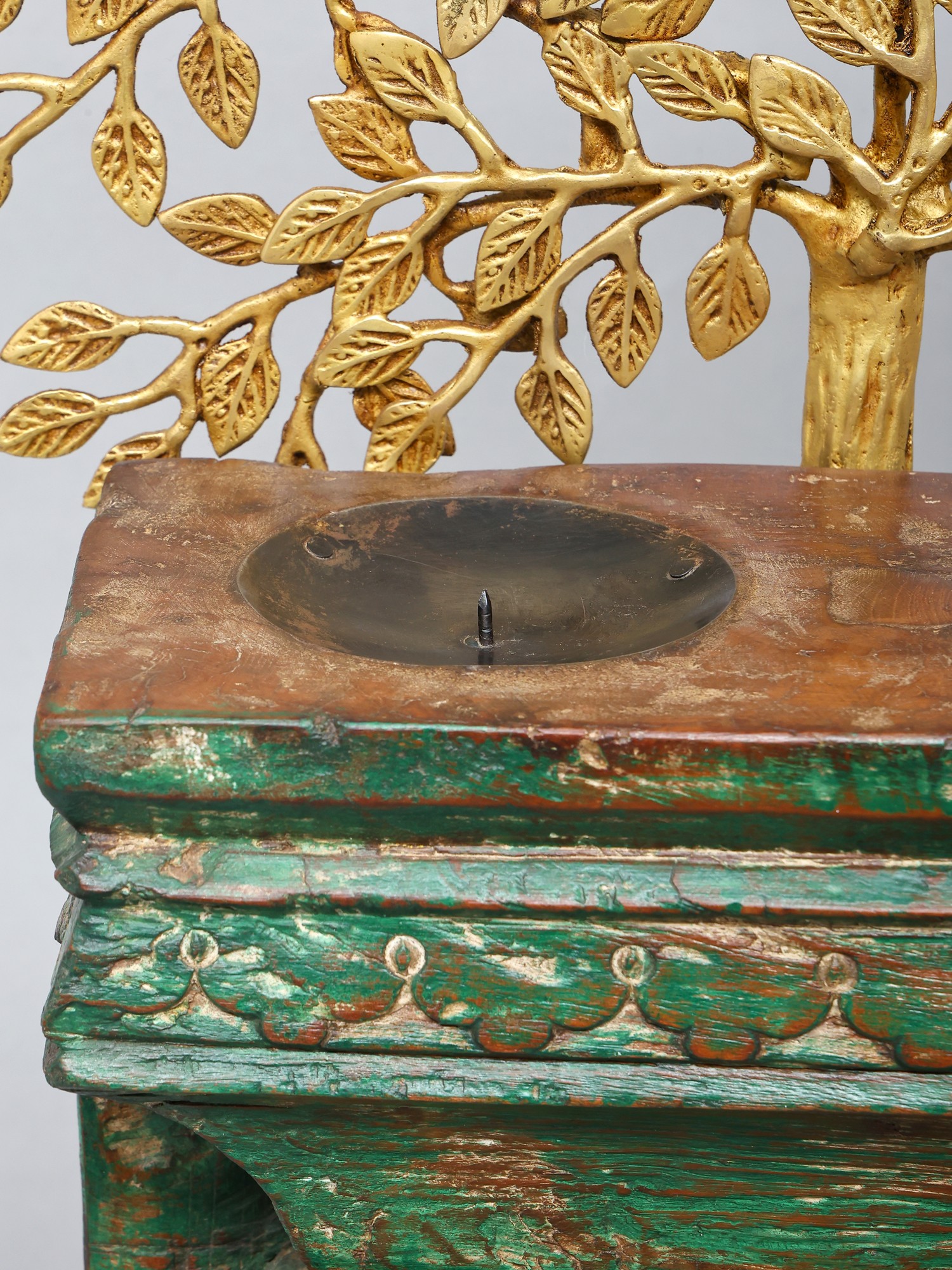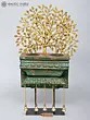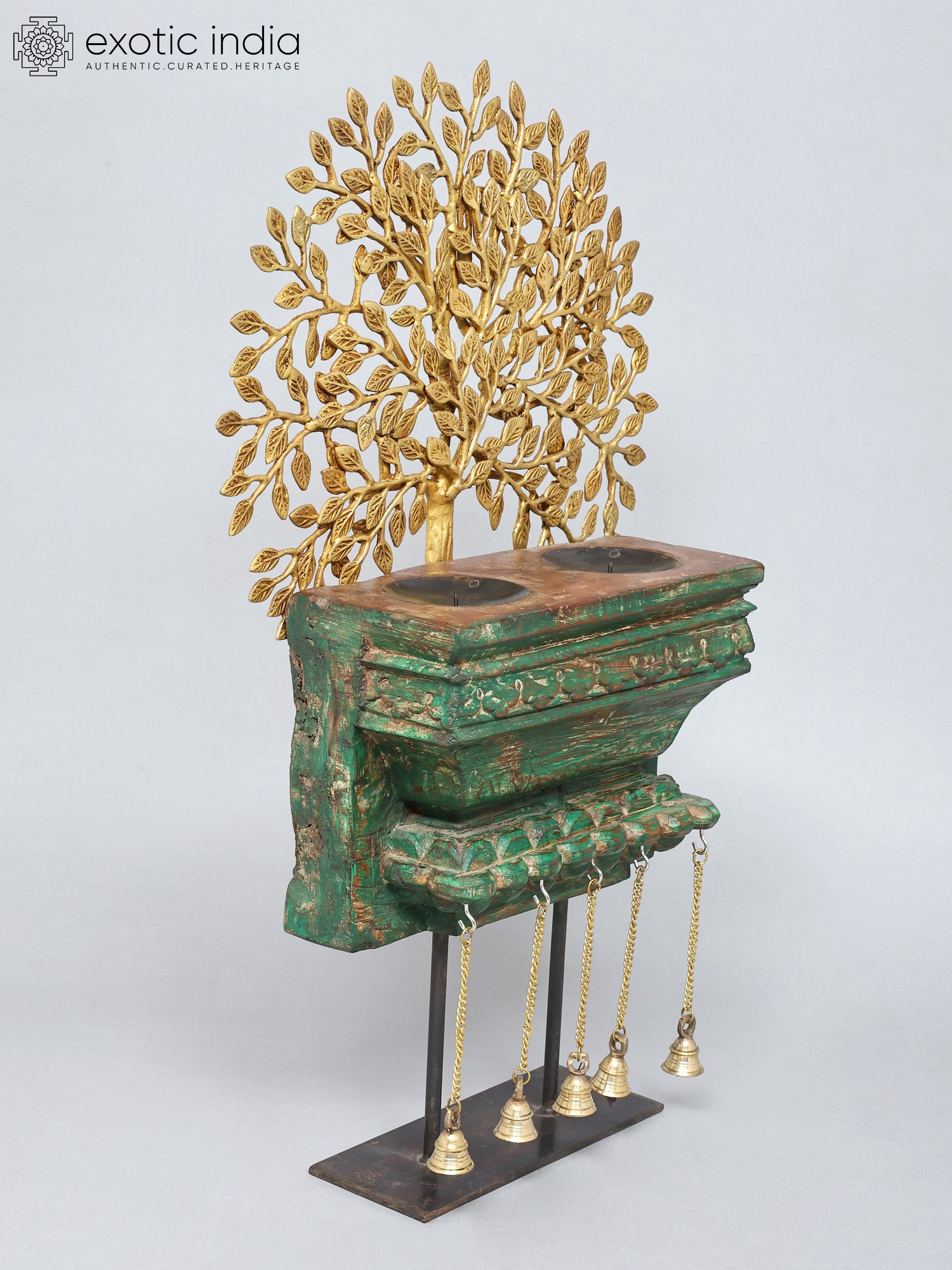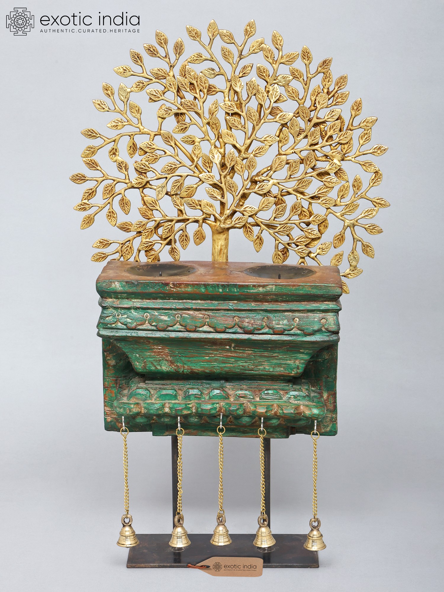 28" Brass Tree of Life with Wooden Candle Stand and Dangling Bells | Decorative Showpiece