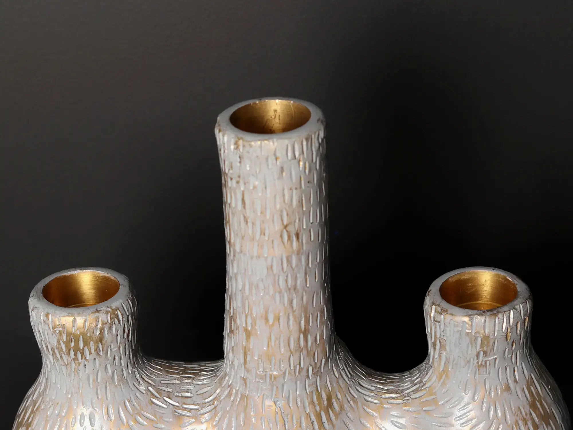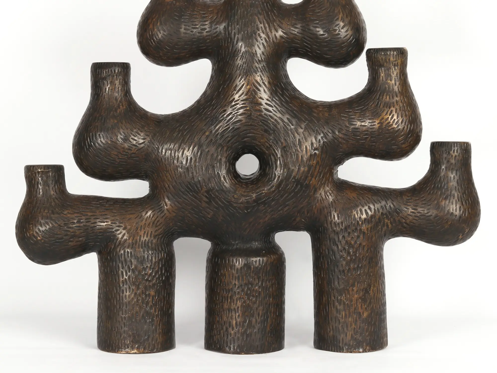 This creative brass candle holder is designed to look like a beautiful tree and has been precisely constructed to reflect elegance and artistic refinement. Its structure is reminiscent of a tree with upward branches, emphasizing grace and upward expansion. Because there are no leaves, the candlelight may throw stunning patterns and create a compelling environment. The lines on the trunk that resemble natural tree patterns add to the candle holder's aesthetic appeal. This one-of-a-kind sculpture combines nature-inspired design with functional beauty, making it a visually appealing centerpiece or decorative addition in any area. The brass candle holder's tree-like shape promotes contemplation and celebrates the inherent beauty of simplicity and organic shapes.