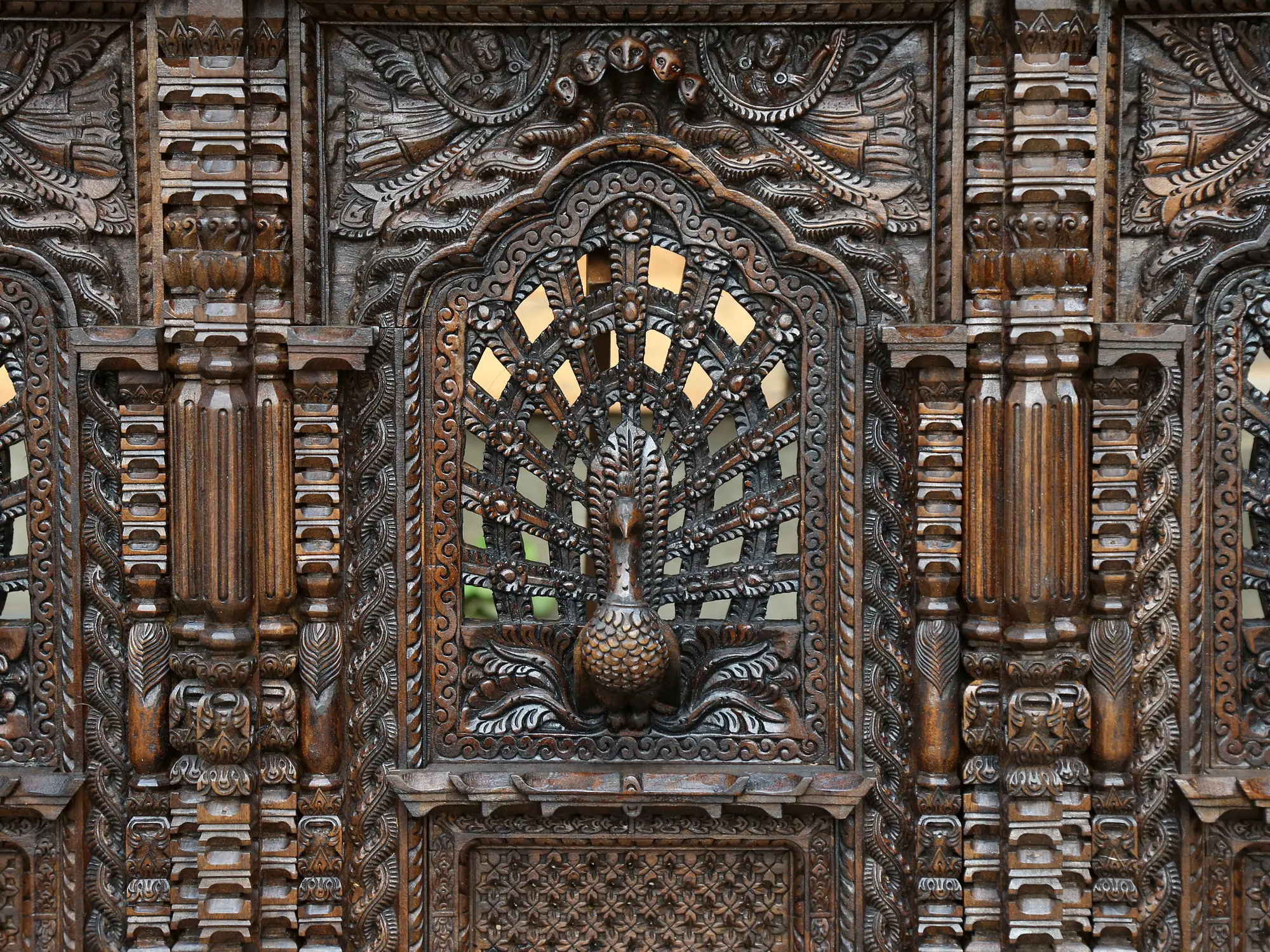 The hand-crafted, beautiful Peacock Window is built from high-quality wood to ensure high sustainability with a splendid appearance. Not single, but three fleshy, exquisite peacocks have been carved elegantly in the center, with the Nepalese Gods around, to enhance the ambiance of your home.