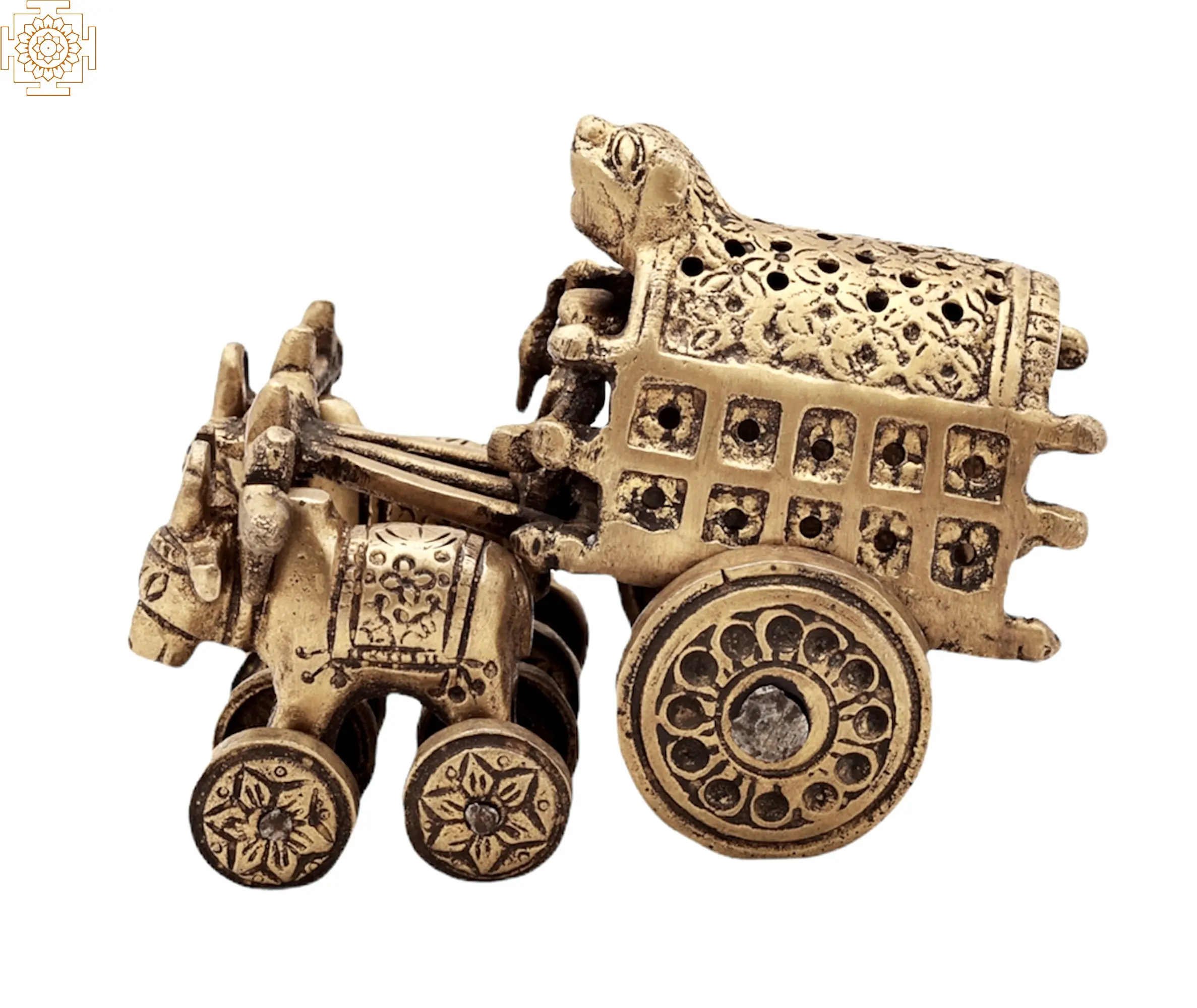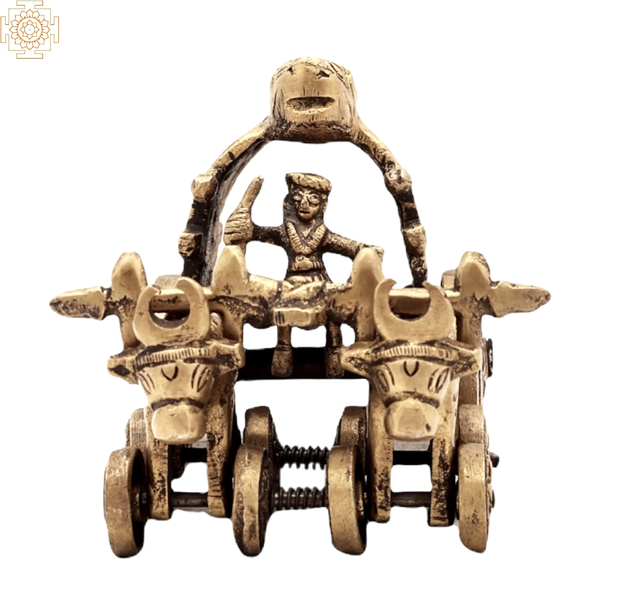 Many items were discovered during the excavation of the Mohenjo Daro site in the Indus Valley. There were little utensils and miniatures of bullock carts among those relics, confirming that bullock carts were employed as modes of transportation during the period. Since then, the casting of brass sculptures in the shape of bullock carts has begun. These artworks serve as a memory of a period when mobility was a viable option. Two bullocks are hitched to a wagon driven by a human in this brass figure. The most important aspect of this sculpture is that the bullocks are coupled with wheels, allowing them to move. This one-of-a-kind décor piece may also be utilized as a play toy.