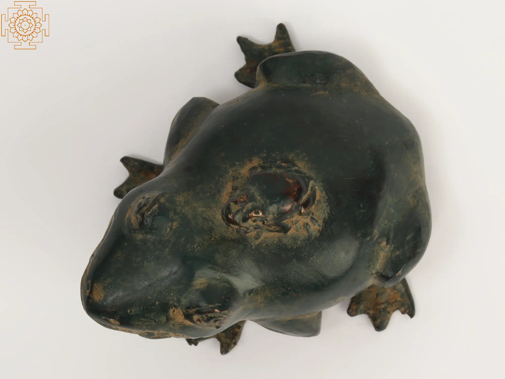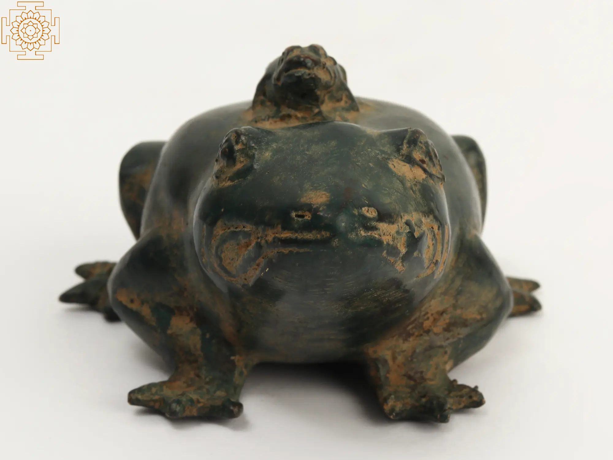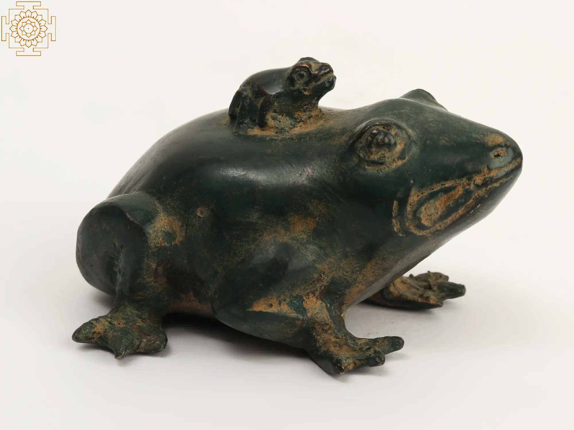 Frogs have long been considered environmental barometers. They are the first to notice when and how the climate is changing. Because of this, they are revered as rainbearers in many ethnic communities. Mother Nature's favorite child, the frog, is honored in this Small Brass Child Frog on the mother statue. This monument, painted in a dark green patina, depicts the amphibian's nature. The connection and familial link demonstrated by the mother frog carrying a kid is followed by animals. It also represents the dependency of animals on one another. Keeping this statue at home helps the beholder to recall nature and the frog, which is seen as a vital aspect.