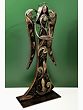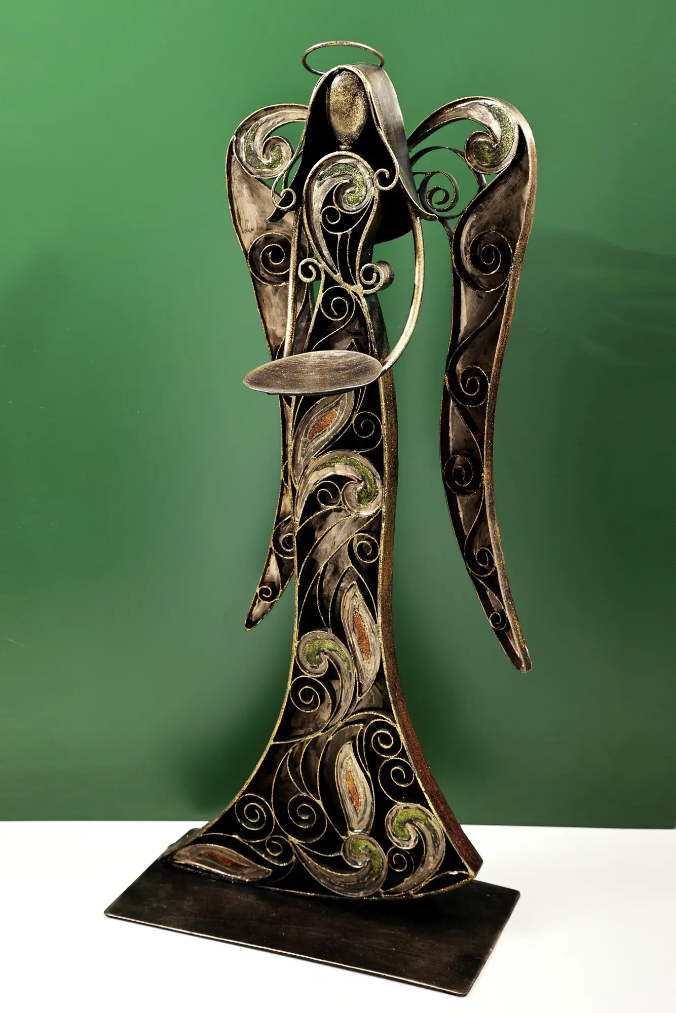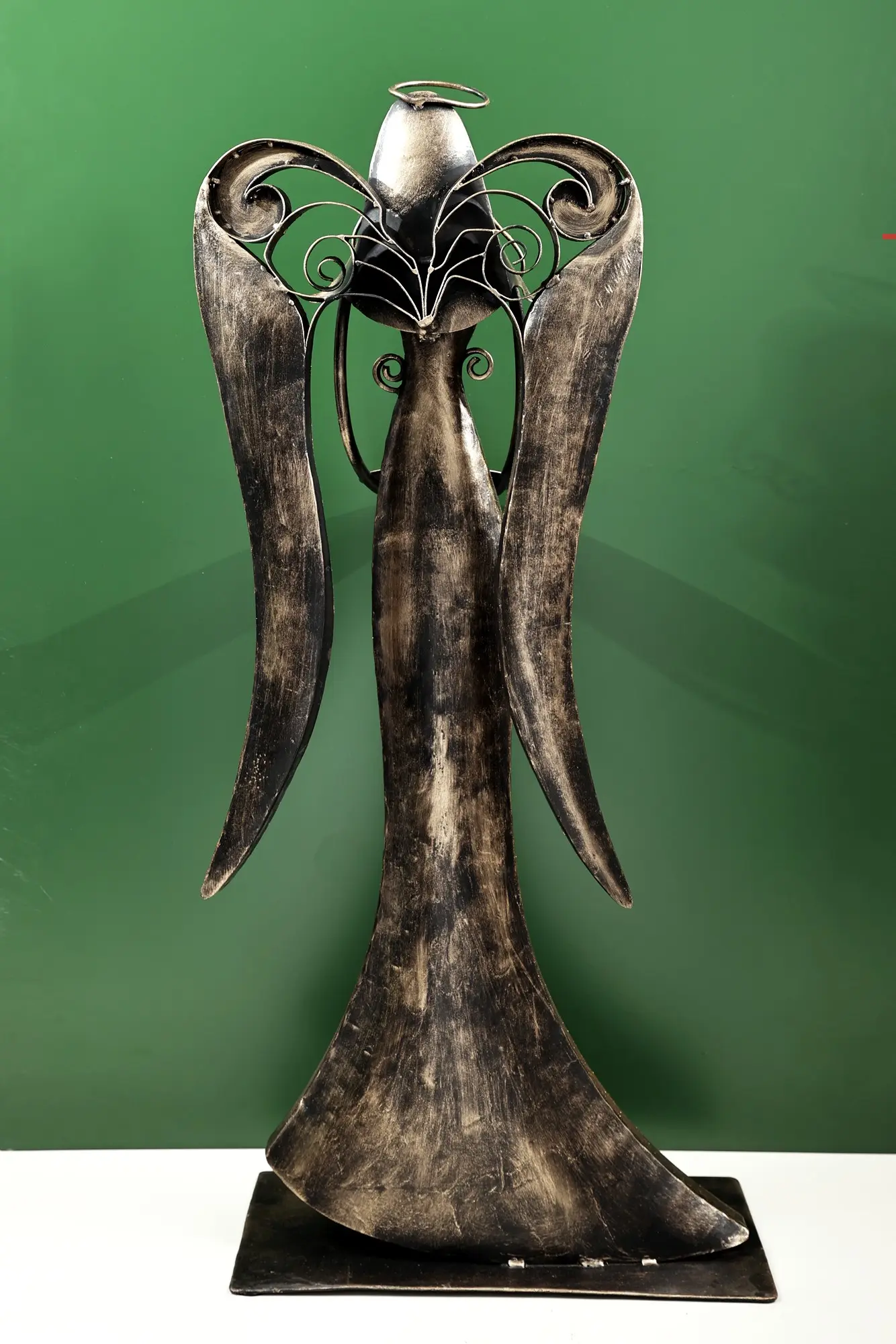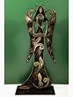 Throughout history and across cultures, the image of the angel has been synonymous with hope, guidance, and divine intervention. From the winged figures gracing the walls of ancient temples to the celestial beings depicted in Renaissance art, angels have served as intermediaries between the earthly and the divine. These benevolent spirits, often portrayed with radiant wings and a serene countenance, represent purity, protection, and the unwavering presence of a higher power. This carefully handcrafted sculpture evokes that sense of peace and celestial grace. The silhouette of the angel, wrought from durable iron, is a testament to the artist's skill and dedication. Intricate swirls and delicate floral patterns adorn the figure’s gown, creating a visual tapestry that is both captivating and elegant. The aged finish adds a touch of old-world charm, lending the piece a timeless quality that will complement any décor.