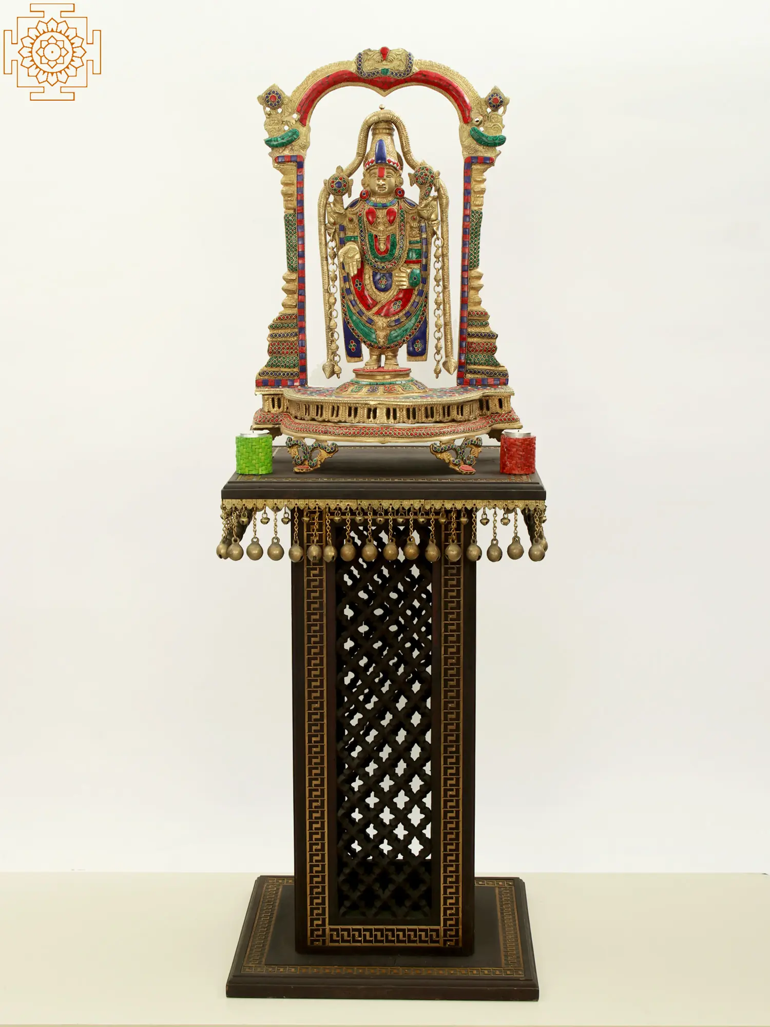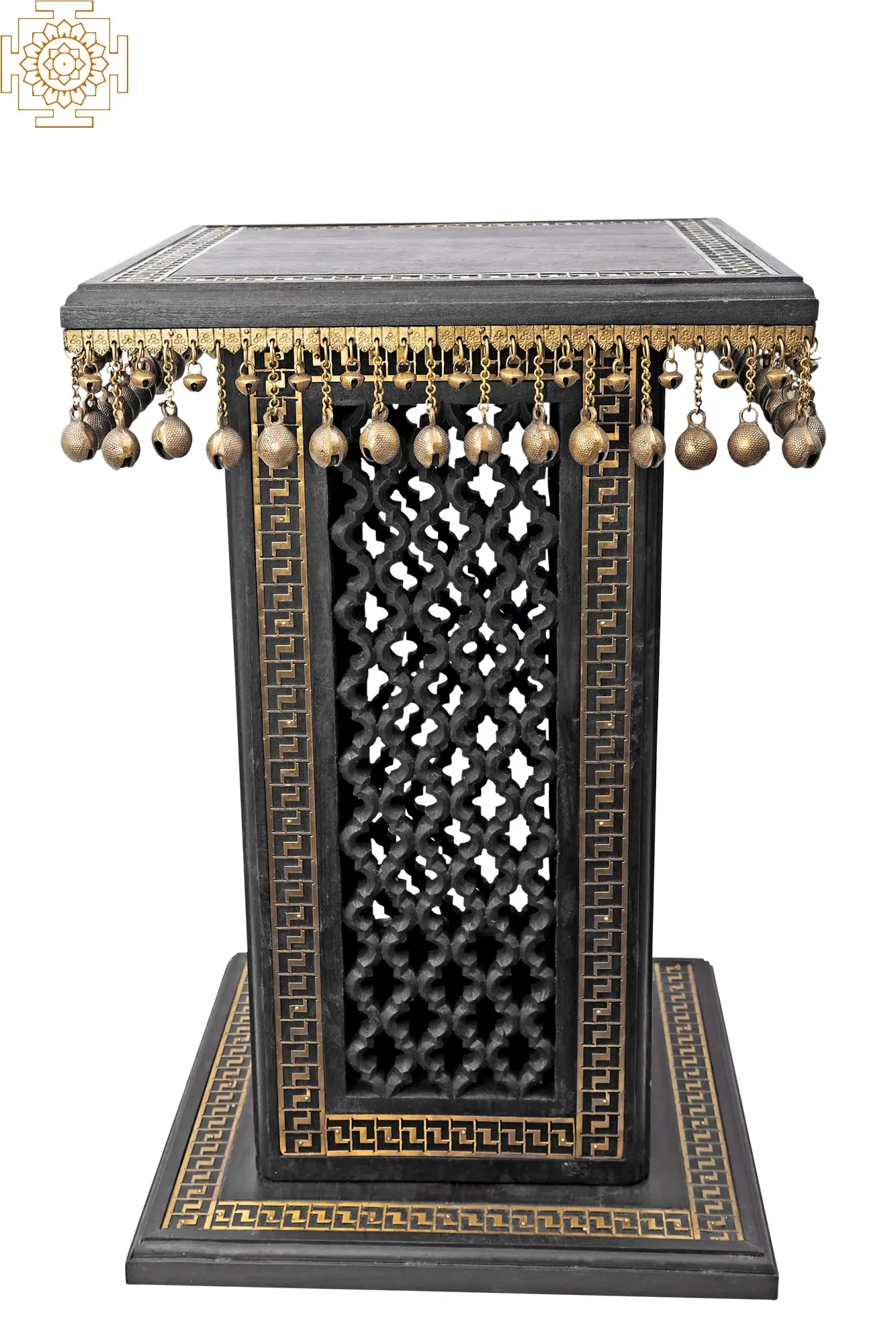 Elevate your home decor with our High Wooden Pedestal with Lattice, Brass Work, and Ghungroos. Handcrafted by skilled artisans in India, this teakwood pedestal is a true beauty. The intricate lattice design, combined with the brass inlay work and ghungroos, creates a stunning visual appeal that will captivate your guests. The high pedestal adds a touch of grandeur to any space, making it perfect for displaying your favourite artefacts or plants. Made with love and attention to detail, this handmade pedestal embodies the rich cultural heritage of India.