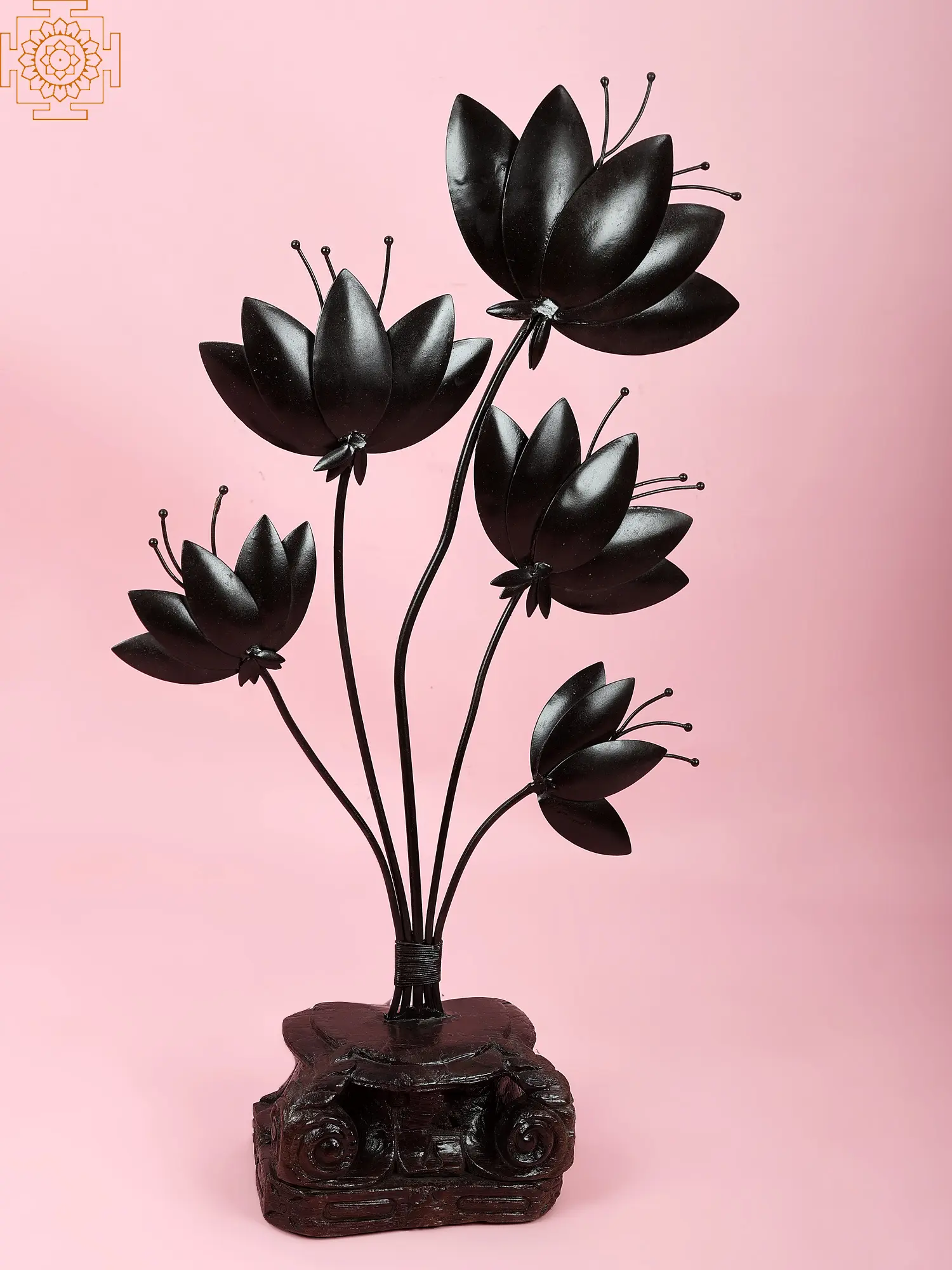 Elevate your home's ambiance with this exquisite iron lotus table decor. Crafted with meticulous attention to detail, this piece embodies the grace and tranquility of the lotus flower, a powerful symbol of purity, enlightenment, and rebirth across many cultures. Its striking design, featuring multiple blooming lotus flowers rendered in a sophisticated black finish, offers a statement of refined elegance to any room.