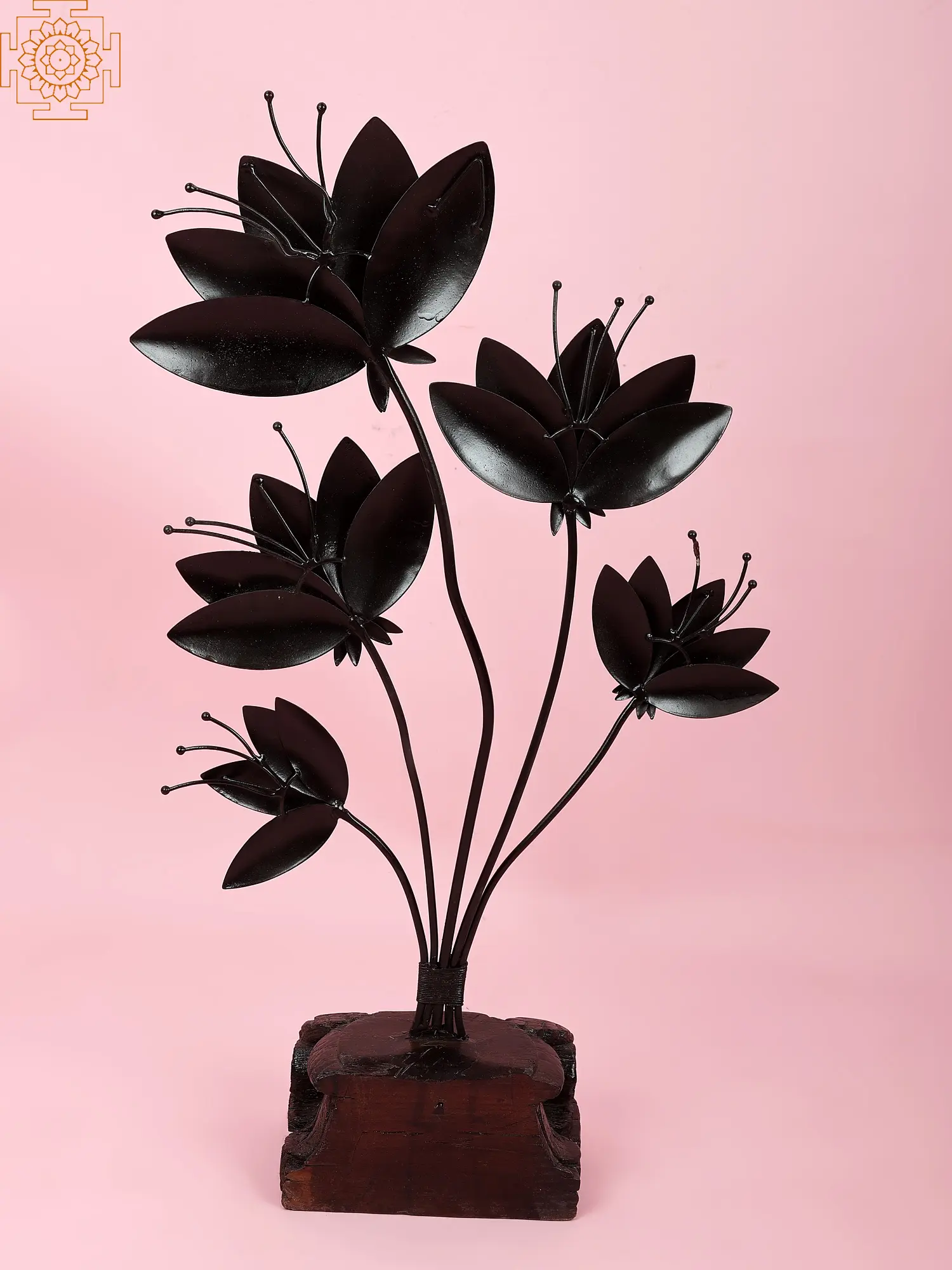 Each element of this decor piece speaks to its artisanal origin. The delicate iron petals of the lotus flowers are artfully shaped, capturing the natural unfolding of these sacred blooms. The stems gracefully arc, creating a sense of organic movement that draws the eye. The entire arrangement is anchored by a substantial, intricately carved wooden base. This fusion of robust wood and delicate ironwork creates a visually captivating contrast, highlighting the skill and craftsmanship involved in its creation.