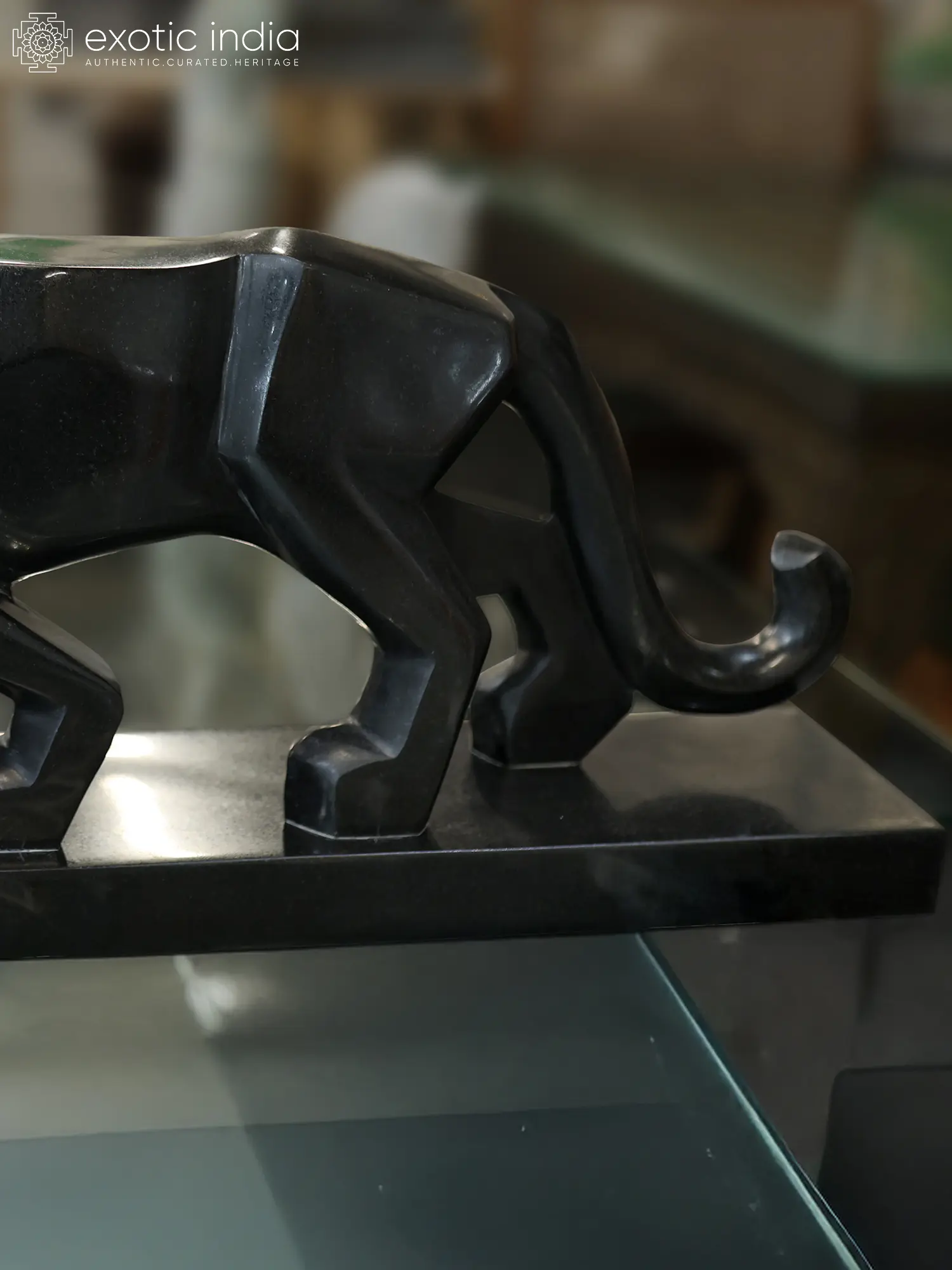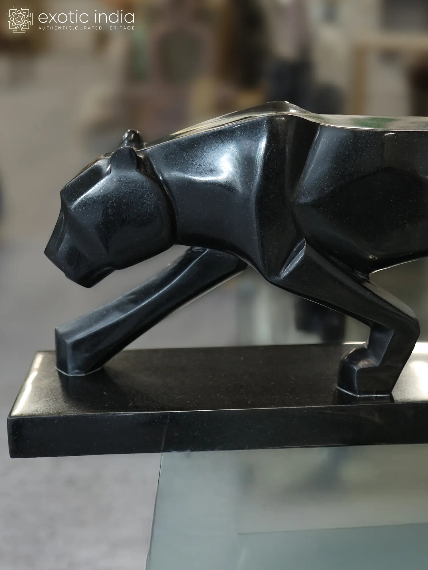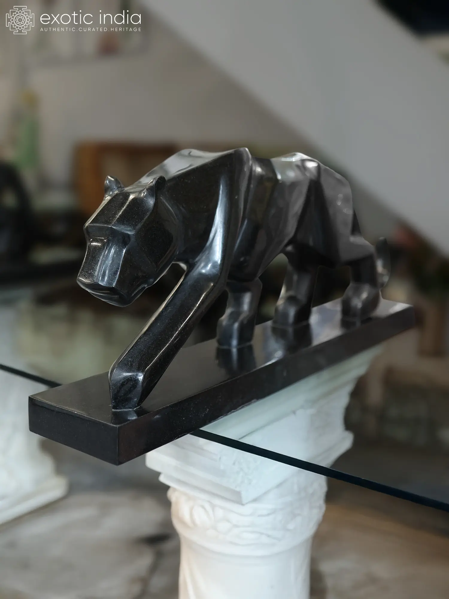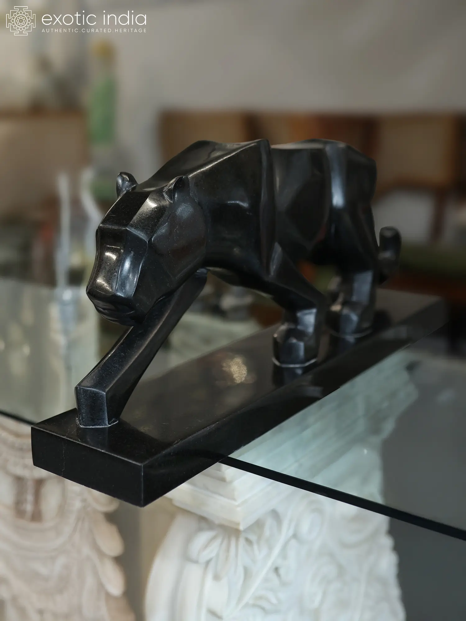 The arresting form is presented with a commanding stance, its proportions suggesting imminent action, poised for a silent stalk. The deep, enigmatic black hue of the marble accentuates the sculpture's sharp, geometric lines, creating a modern yet primal aesthetic. Measuring an impressive 34 inches in length and 14 inches in height, its substantial dimensions ensure it will be a memorable addition to your decor.