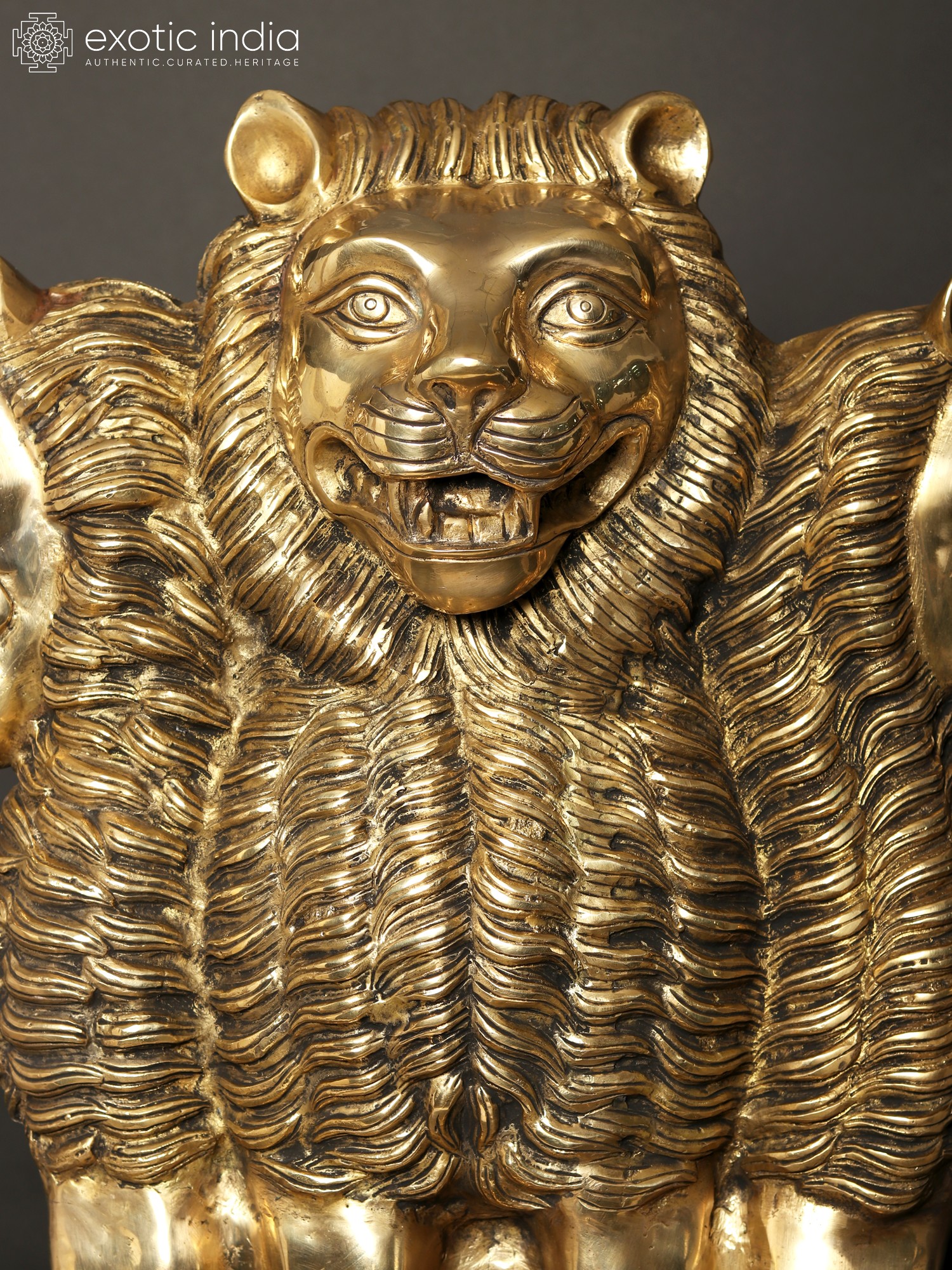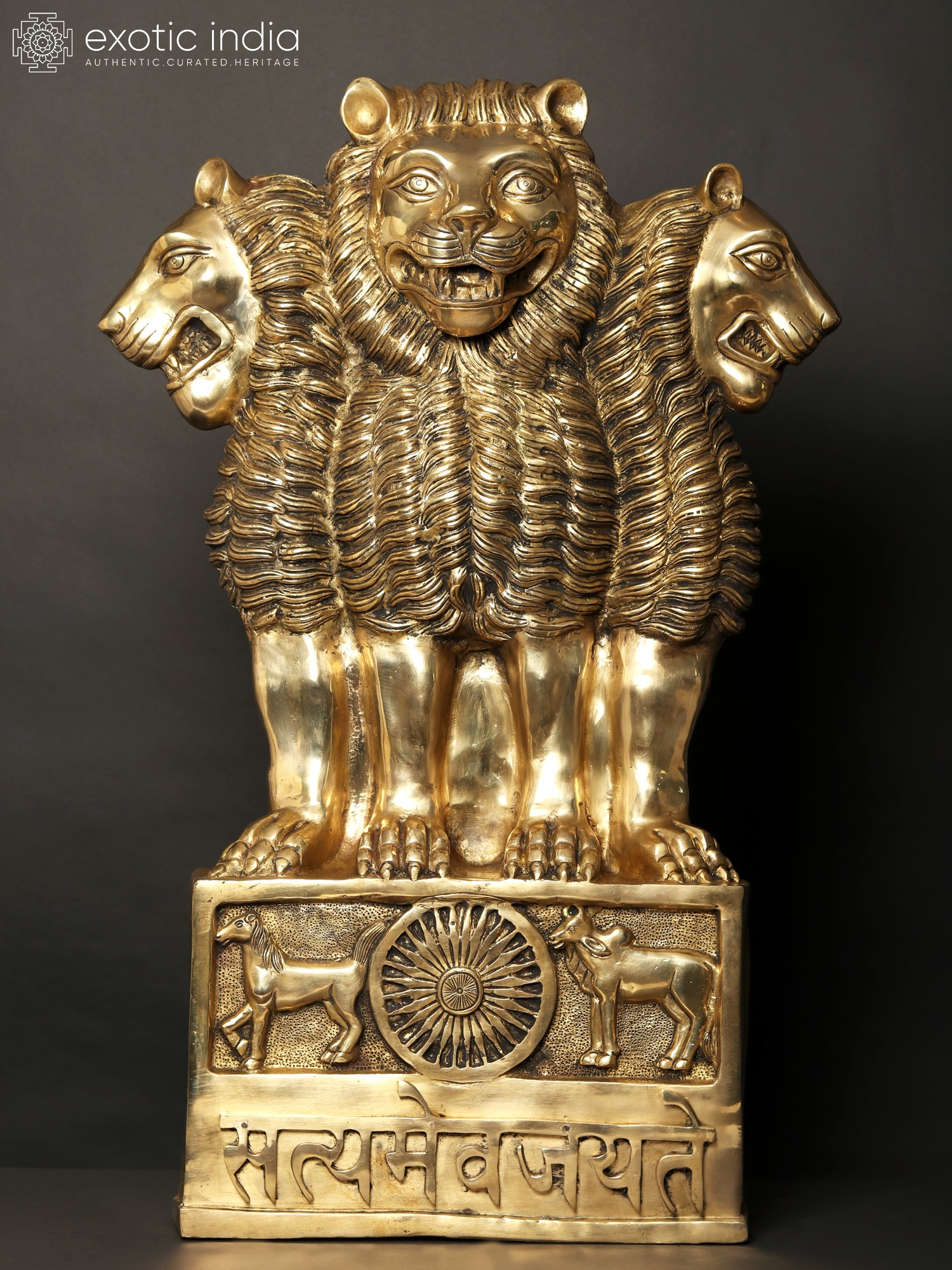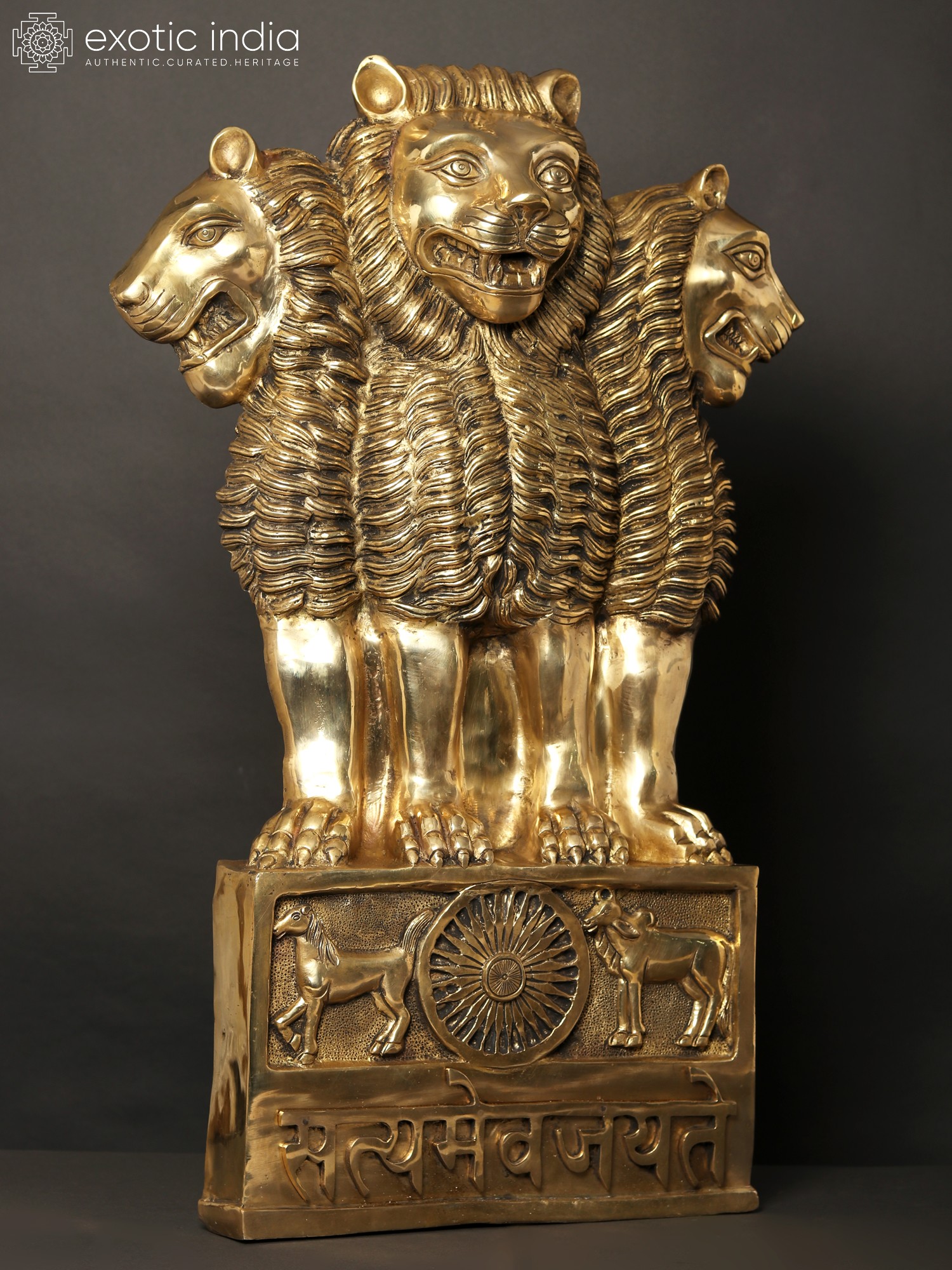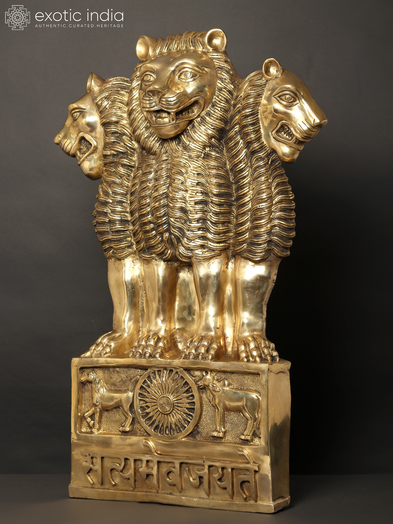 This breathtaking 34-inch tall brass sculpture is a stunning representation of the National Emblem of India. Meticulously crafted, it captures the power and majesty of the four Asiatic lions standing back to back, embodying strength, courage, and pride. The rich, deep brown and gold tones of the brass create a captivating contrast, enhancing the intricate details of the lions' manes and muscular bodies. More than just a decorative piece, this sculpture is a powerful symbol of India's heritage and cultural identity, making it a perfect statement piece for any home or office.