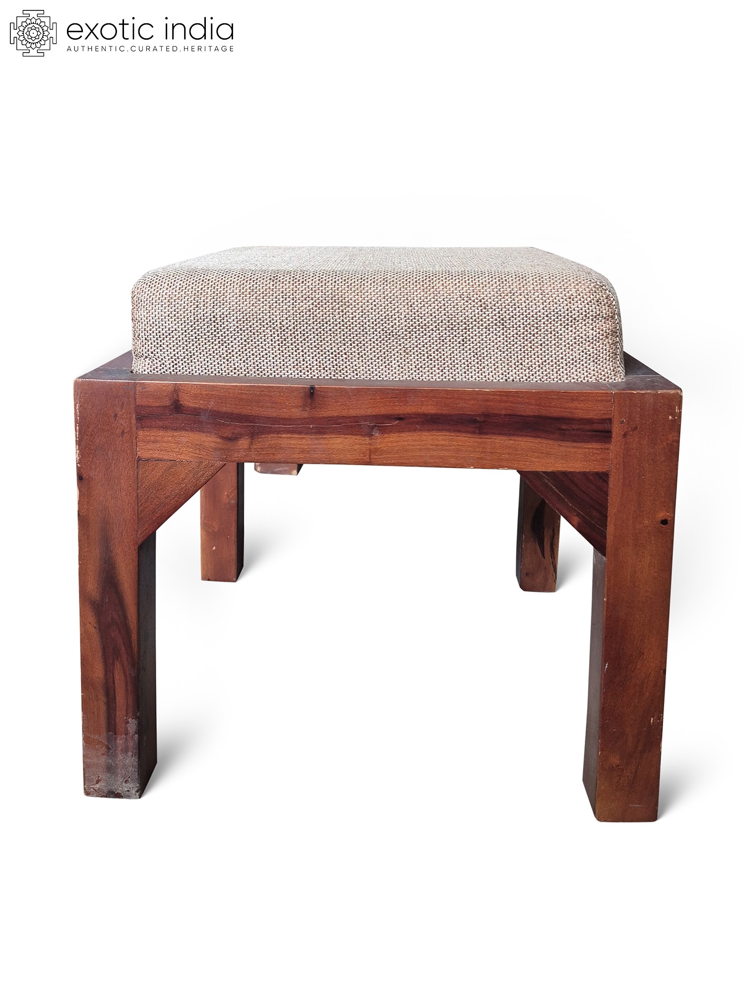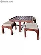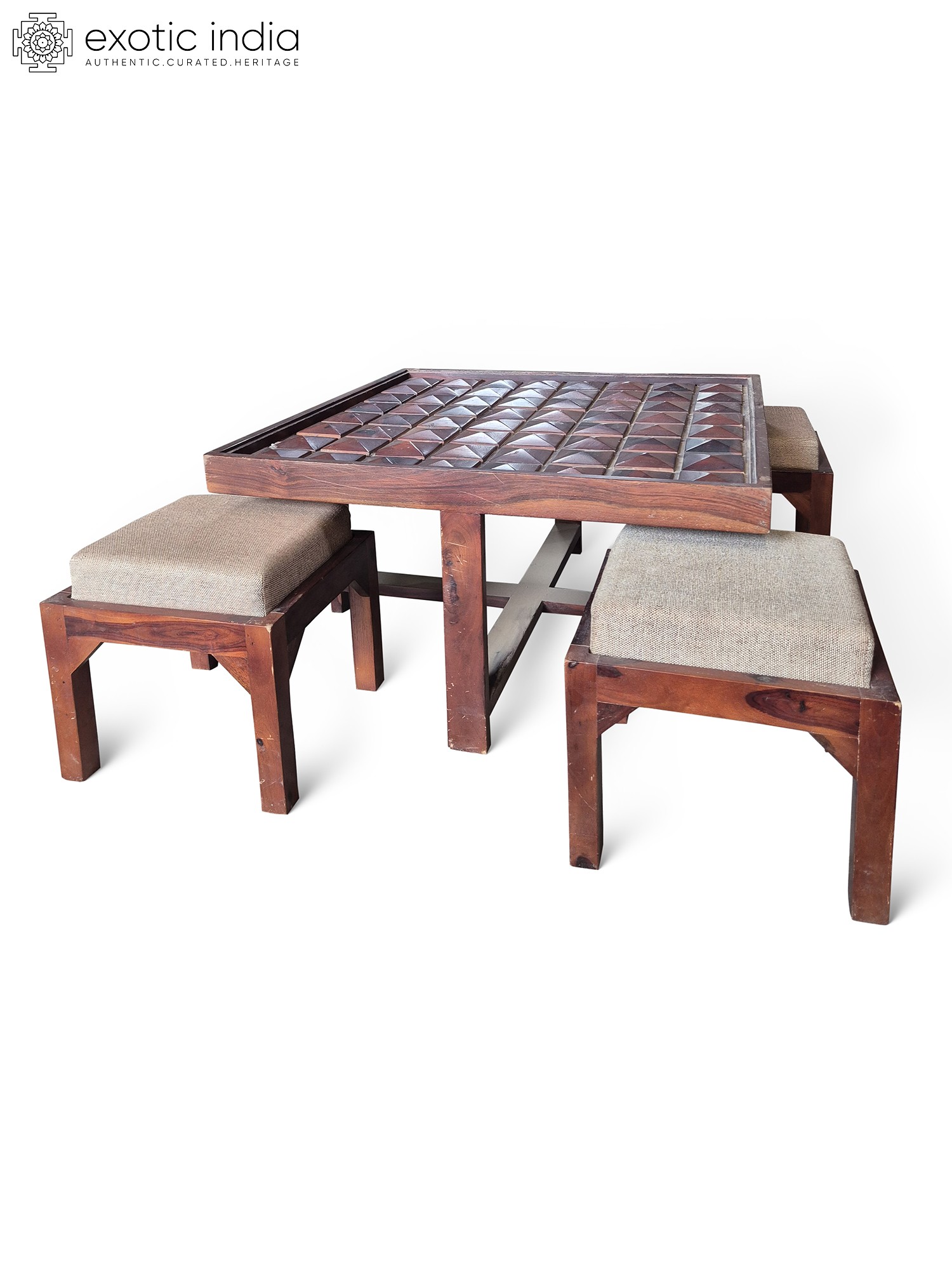 Included with the coffee table are four comfortable and stylish stools. Each stool is designed to tuck neatly under the table, maximizing space efficiency when not in use. The seats are generously padded and upholstered in a durable, textured fabric in a neutral hue, offering a pleasing contrast to the deep tones of the wood. The sturdy wooden legs of the stools echo the design of the table, ensuring a cohesive and harmonious look throughout the set. These stools provide convenient seating for guests or a comfortable spot to rest your feet.