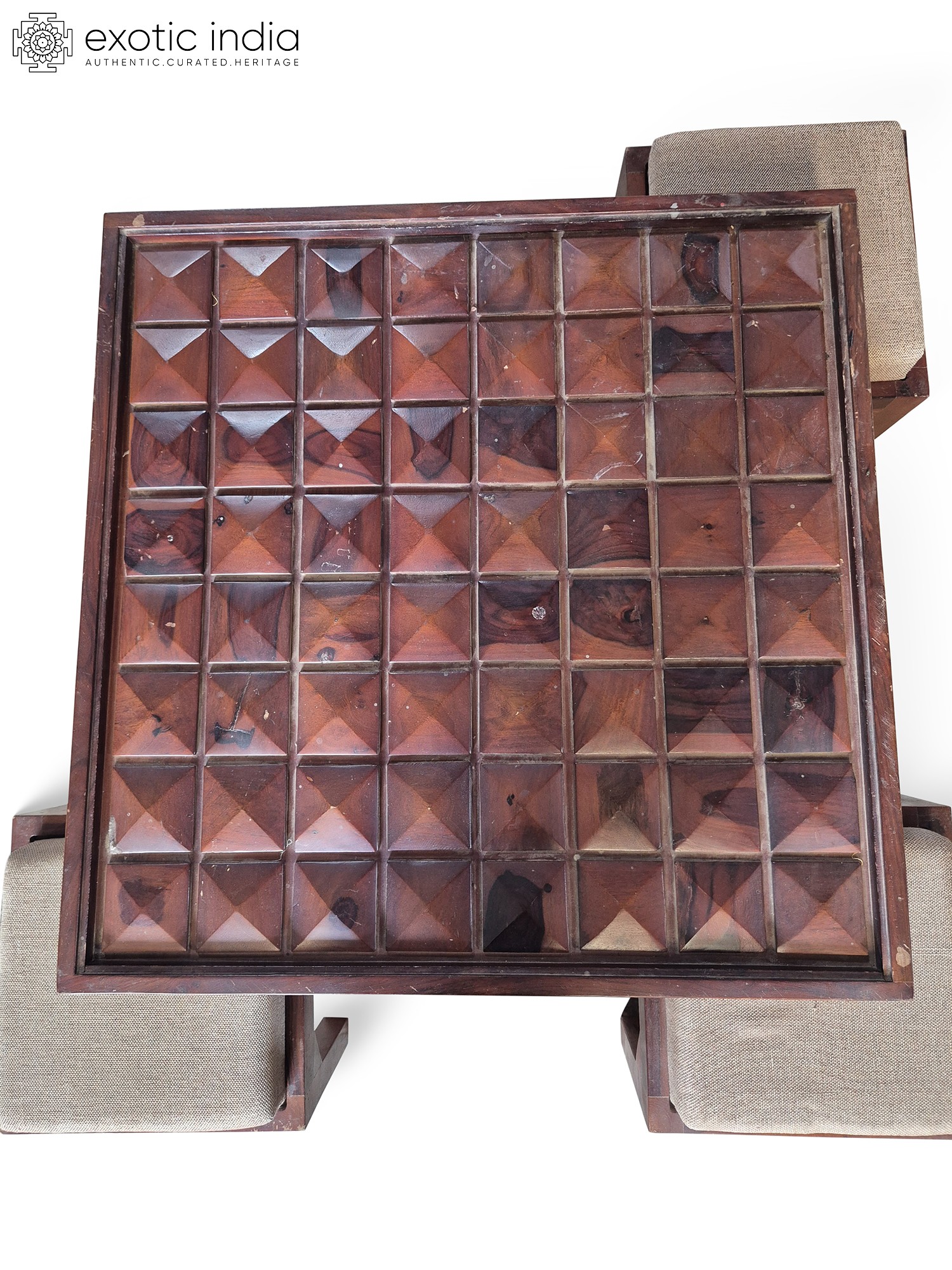 The square tabletop is a true work of art, featuring a mesmerizing geometric pattern. Each square is meticulously carved with a unique, multifaceted design that creates a captivating play of light and shadow. This intricate detailing adds a touch of luxury and visual interest, making the table not just a functional piece of furniture, but a statement decor item. The generous surface area provides ample space for beverages, books, decorative items, or even a friendly board game.