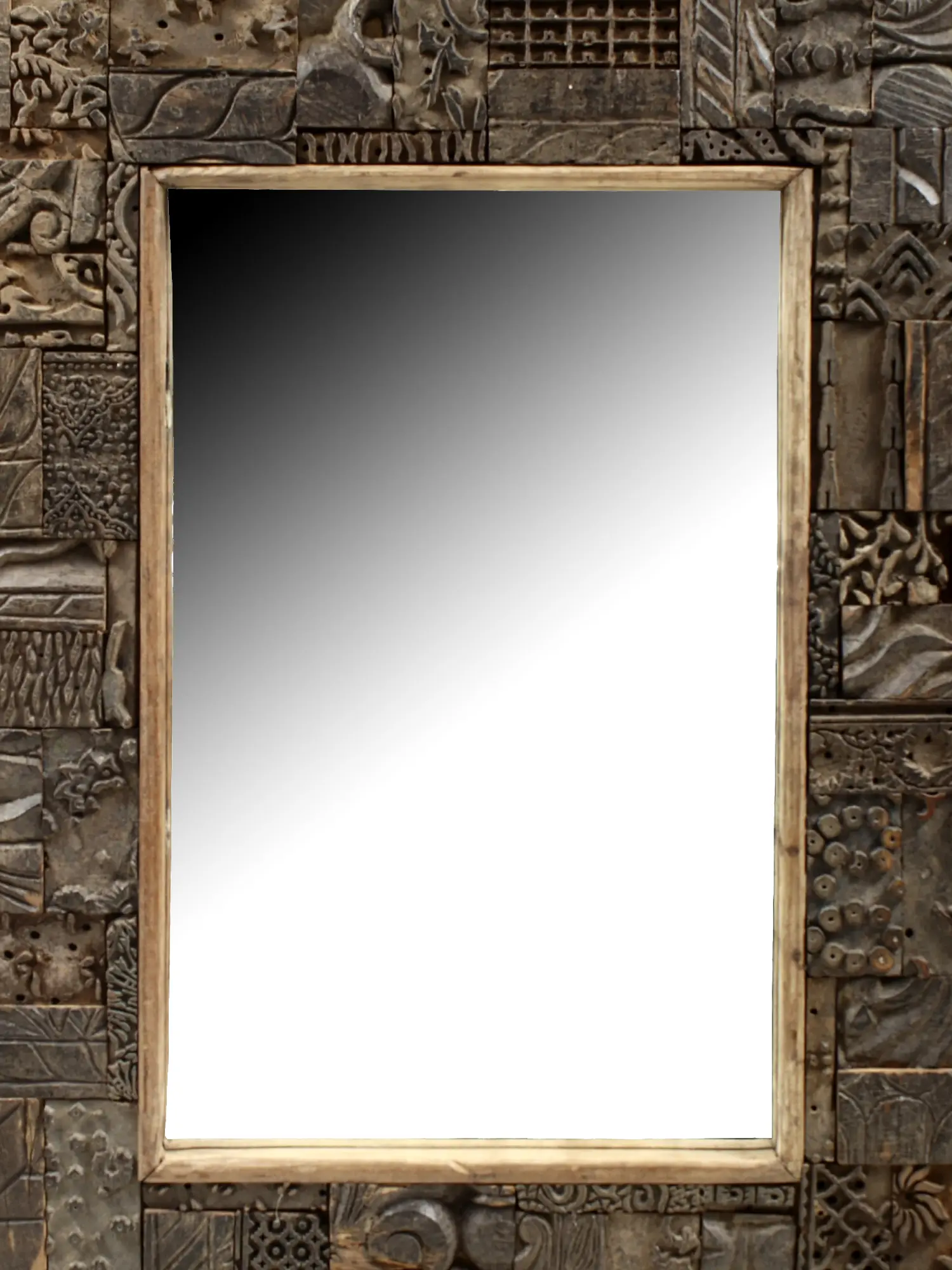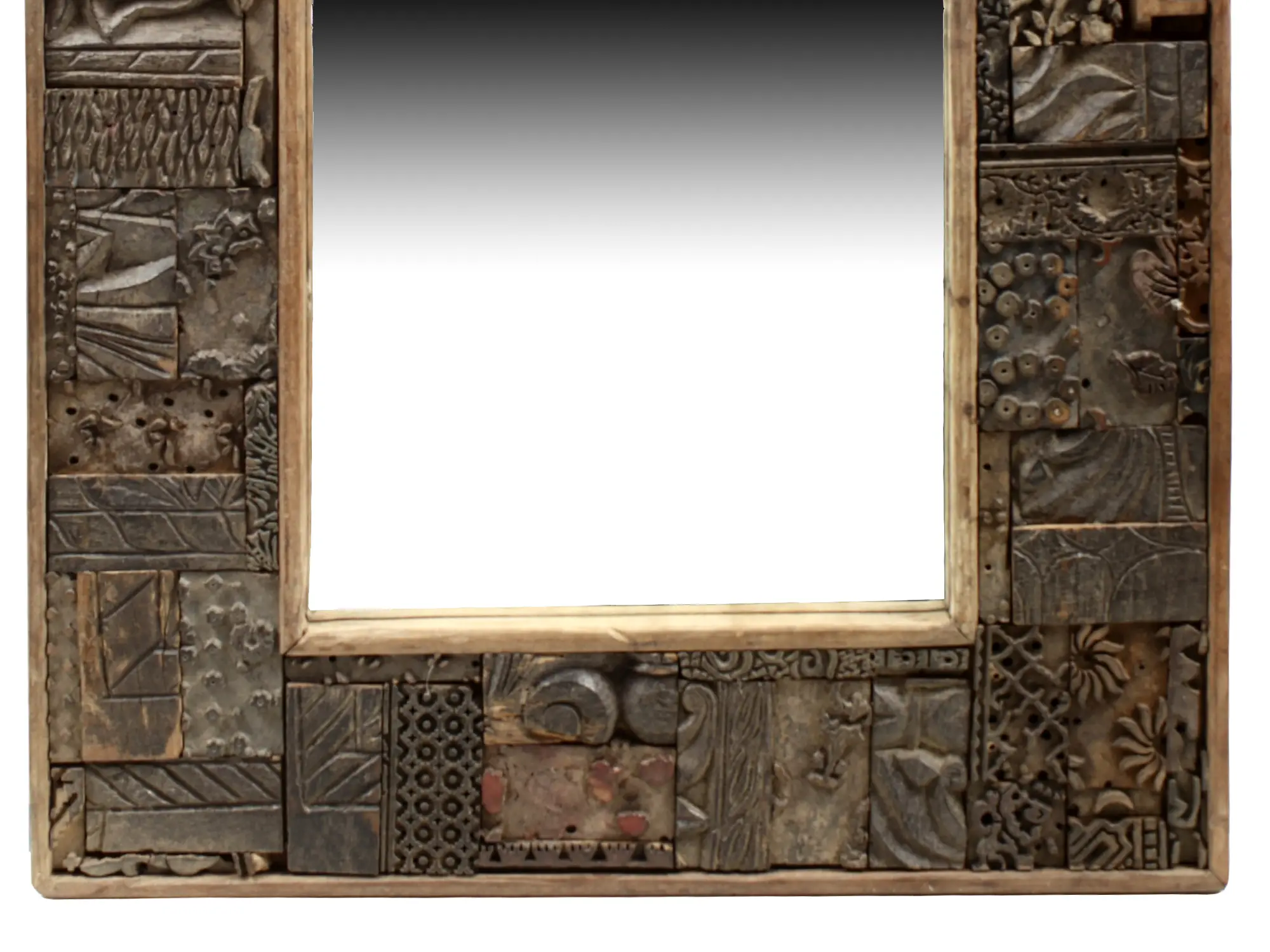 Elevate your home decor with this exquisite vintage wooden mirror, a true testament to artisanal craftsmanship. Each mirror is a unique creation, meticulously assembled from a diverse collection of antique wooden printing blocks. These blocks, each bearing its own history and intricate patterns, are artfully arranged to form a captivating and textured frame. The result is a piece that is not merely a mirror, but a conversation starter, a focal point that draws the eye and sparks the imagination. The frame itself is a complex tapestry of diverse carvings. You’ll discover delicate floral motifs, bold geometric designs, and abstract patterns, all rendered with a timeless appeal. The natural patina of the aged wood, combined with the varied depths and textures of the carved blocks, creates a visually rich and tactile experience. This mirror brings an unparalleled sense of character and history to any room, seamlessly blending rustic authenticity with sophisticated design. It’s a piece that whispers tales of a bygone era, adding warmth and a touch of the exotic to your living space.