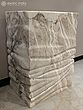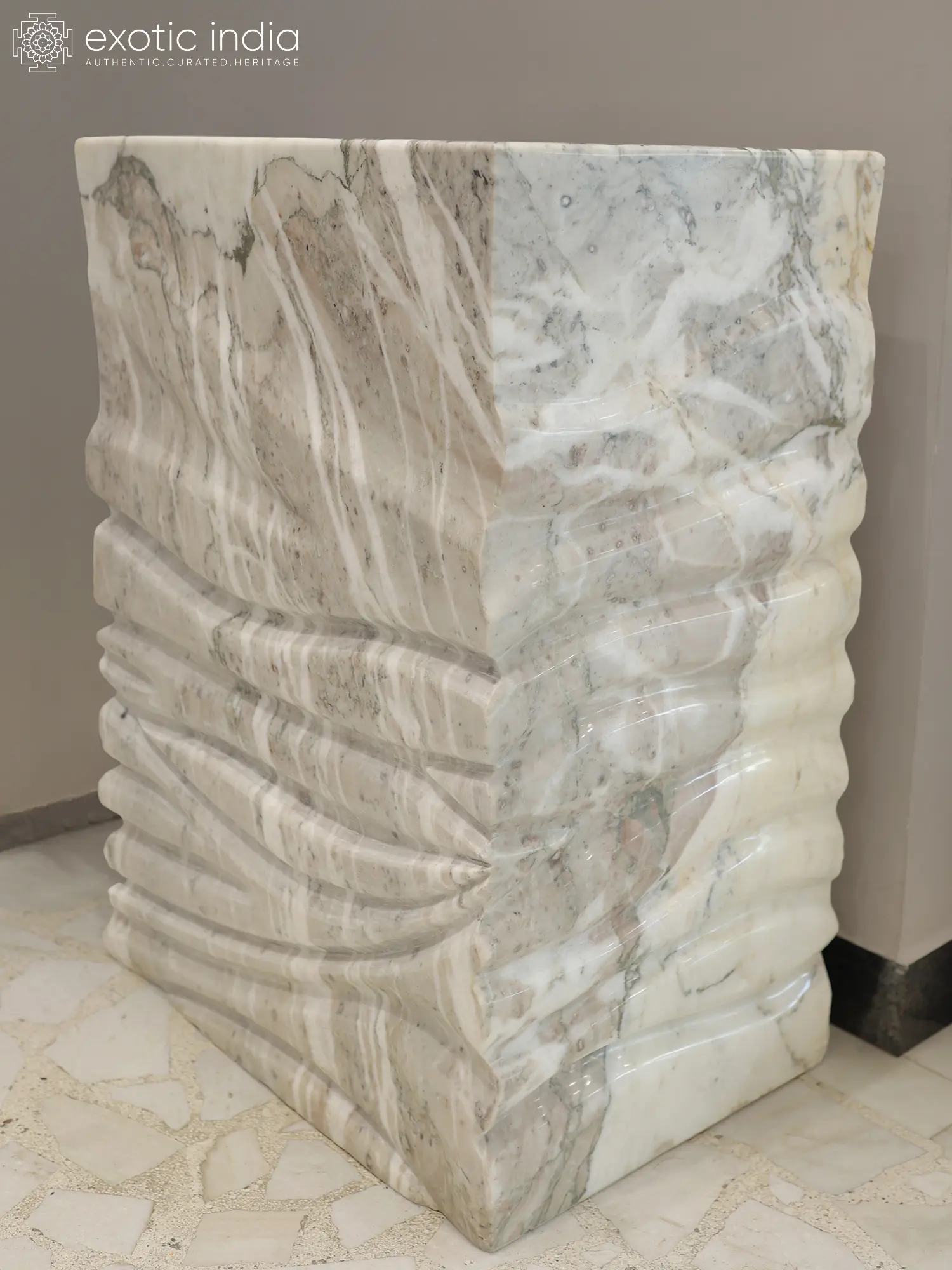 The basin's design is where functionality meets breathtaking artistry. Its commanding height and generous width create a substantial presence, perfect for making a dramatic statement in any bathroom or powder room. The exterior is adorned with a series of gracefully carved undulating waves. These horizontal grooves not only add a dynamic visual texture but also create a captivating play of light and shadow, lending an organic, fluid feel to the solid stone. The edges are softened by the careful sculpting, hinting at the raw, untamed beauty of the marble while maintaining a polished, refined finish. This piece embodies a harmonious blend of natural elegance and inspired craftsmanship, reflecting a deep appreciation for both the material and the artistic interpretation.