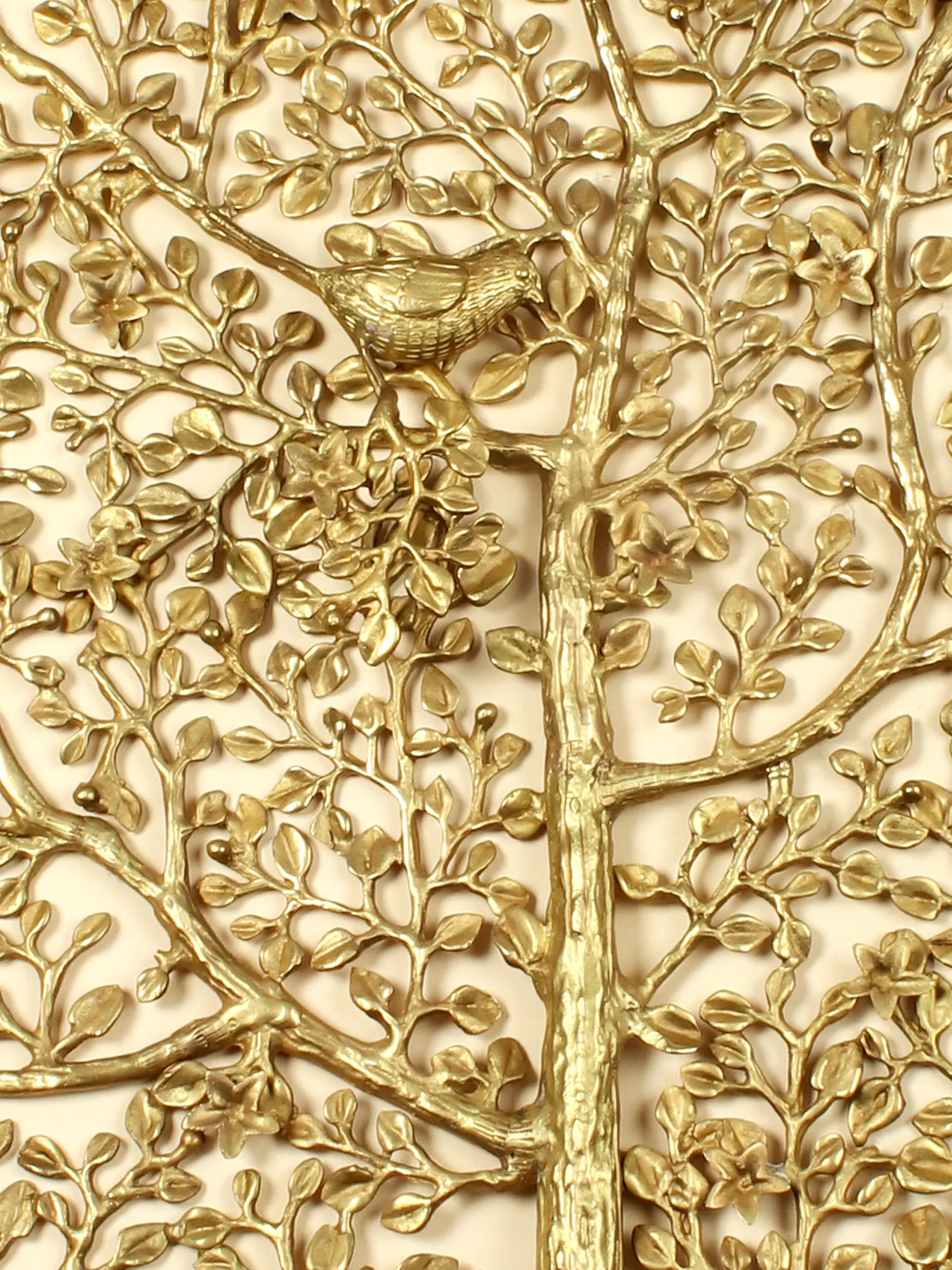 Adding a touch of lively charm to the already captivating tree, several small, intricately detailed birds are nestled among the branches. Each bird appears poised as if in mid-chirp, imbuing the artwork with a sense of gentle movement and the peaceful ambiance of a sun-dappled forest. This subtle yet impactful detail transforms the wall hanging from a mere decorative piece into a narrative of nature's vibrant symphony. The warm, rich hue of the brass catches the light beautifully, casting subtle shadows and adding depth to the overall presentation. ––––––––––––––––––––