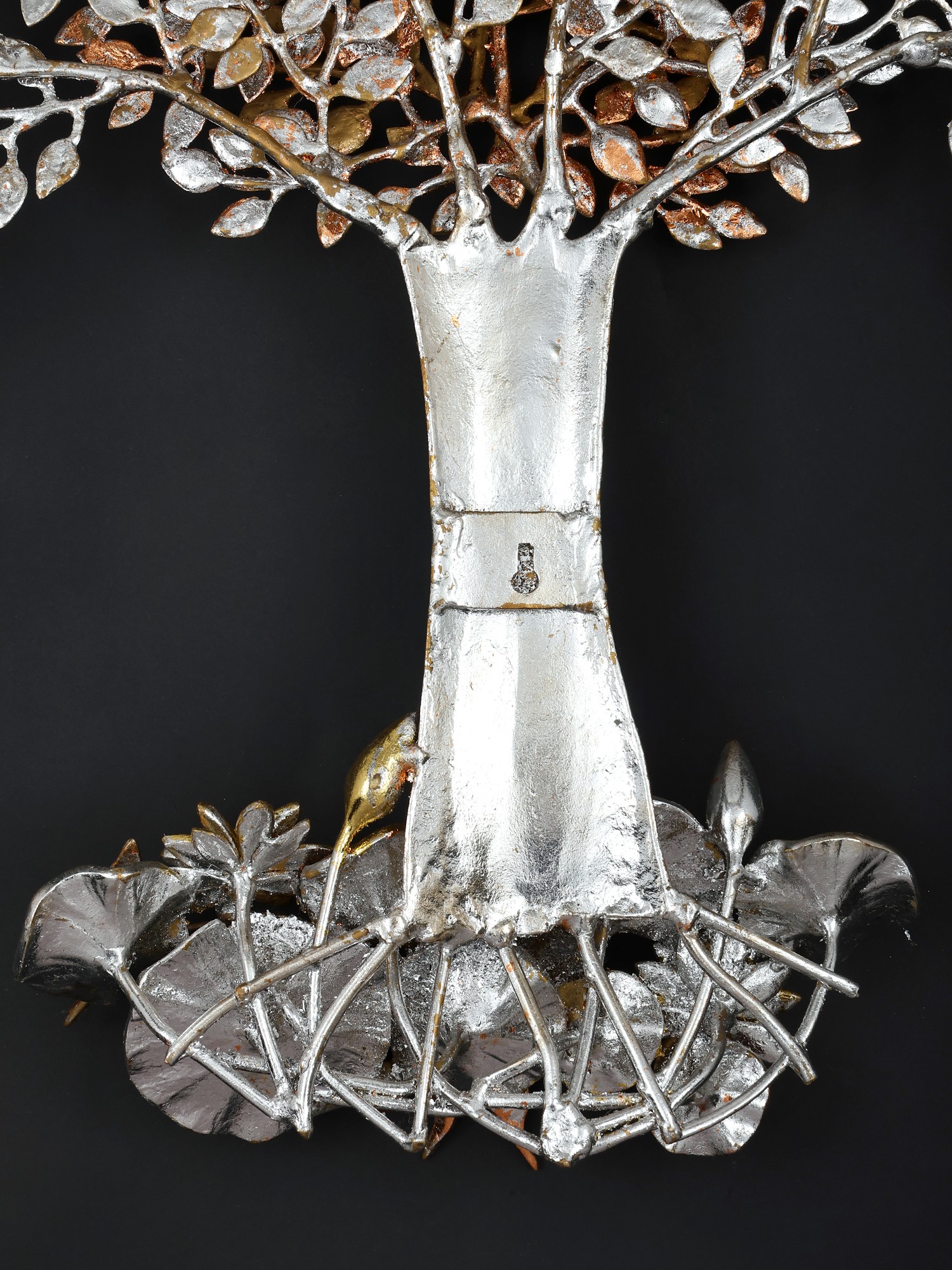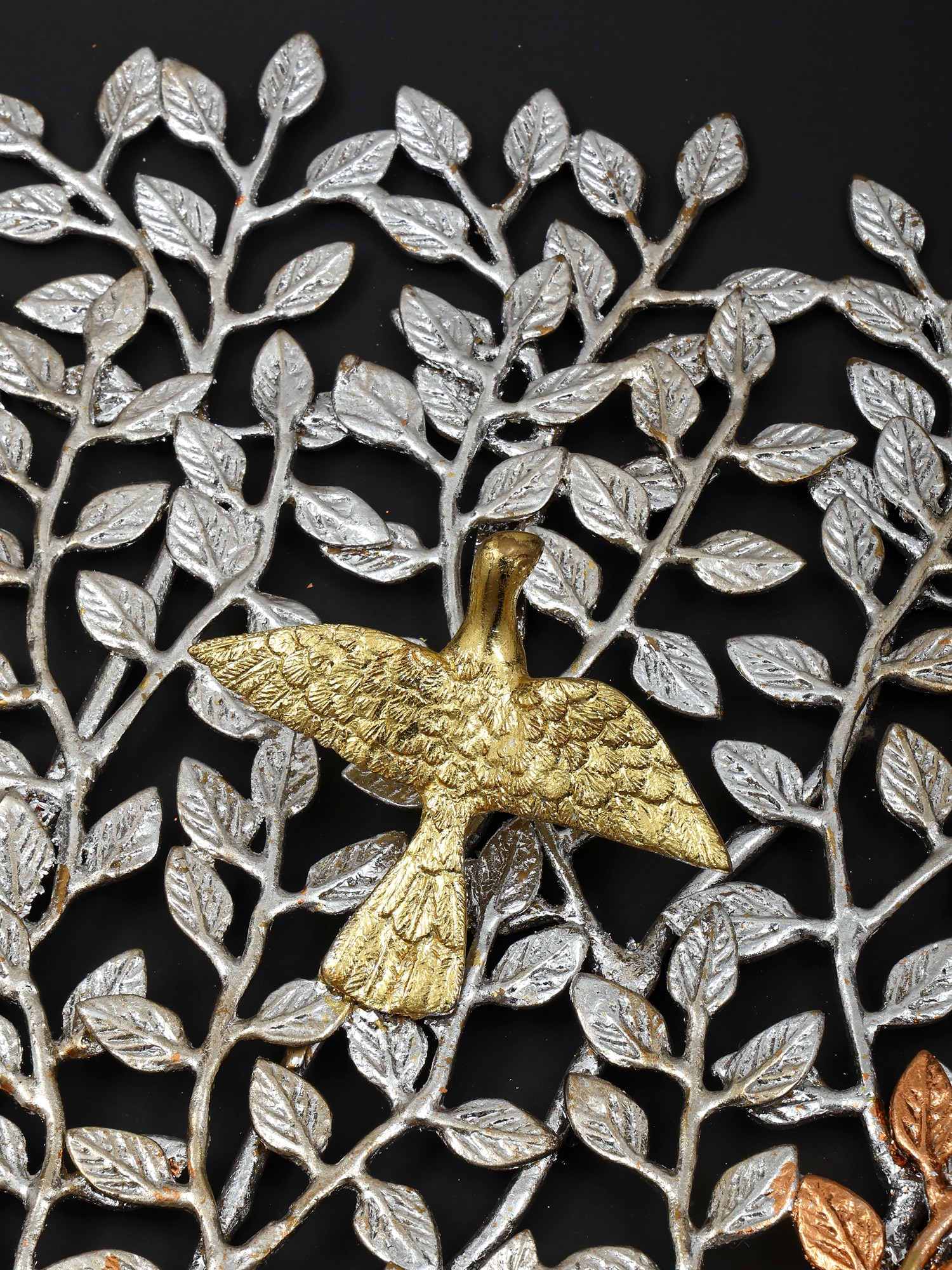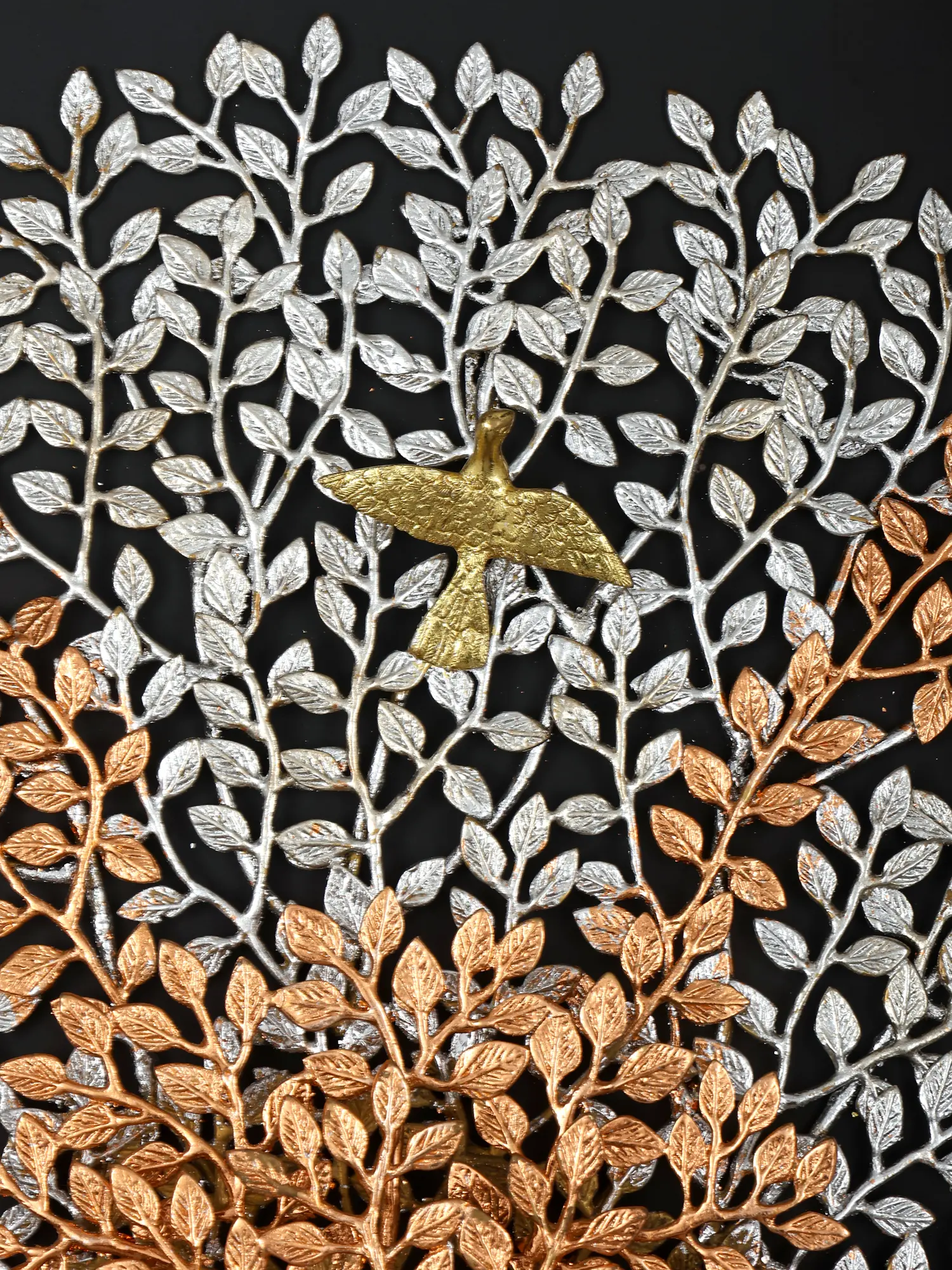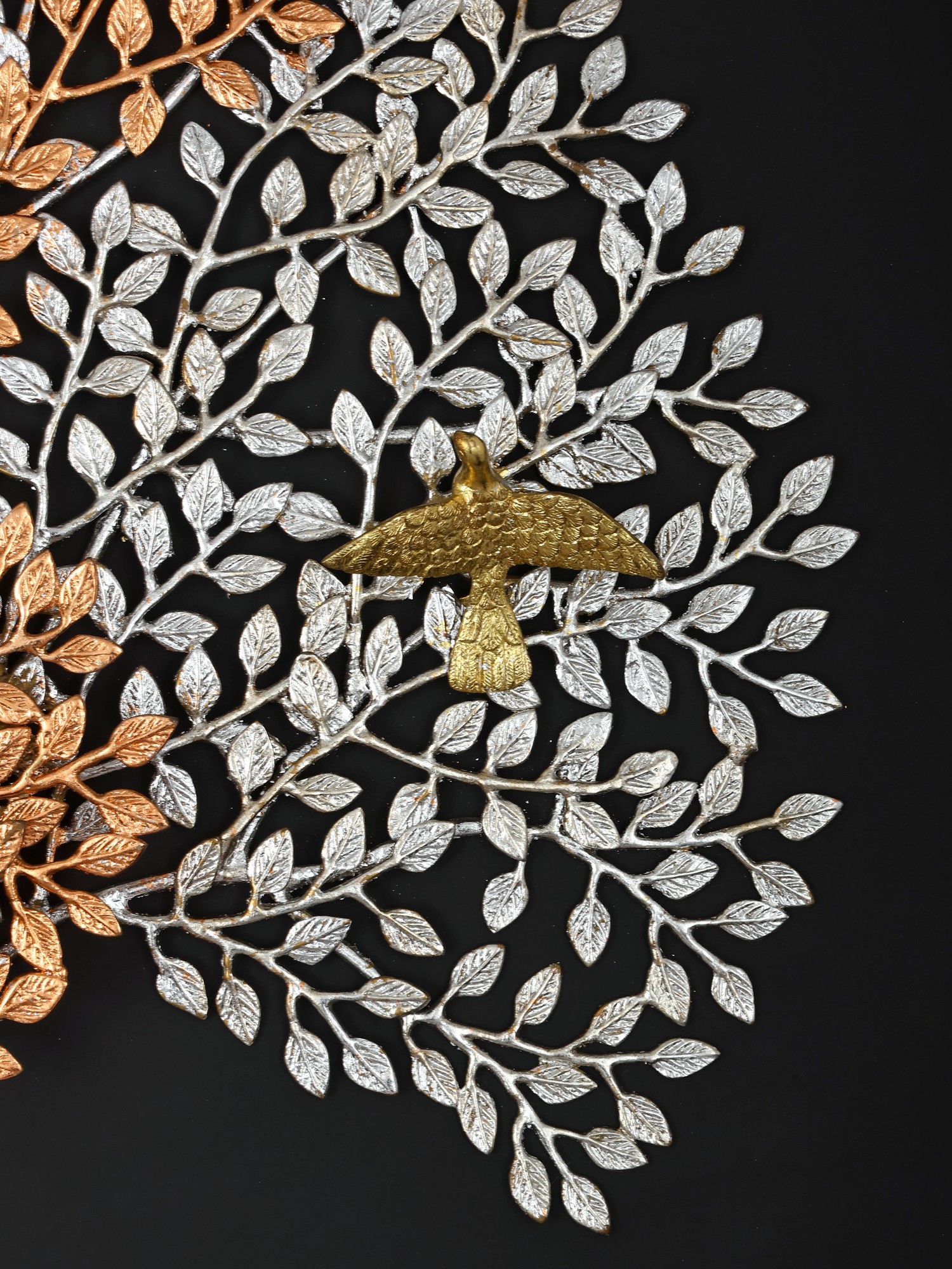 Measuring an impressive 36 inches in height and 33 inches in width, this substantial wall art commands attention. Its intricate design features a canopy of meticulously rendered leaves, a captivating blend of antique silver and warm copper tones. Perched amongst the foliage, you'll discover exquisitely detailed birds, their presence adding a dynamic touch of nature’s melody to the composition. The depth created by the four-inch length ensures it casts subtle, captivating shadows.