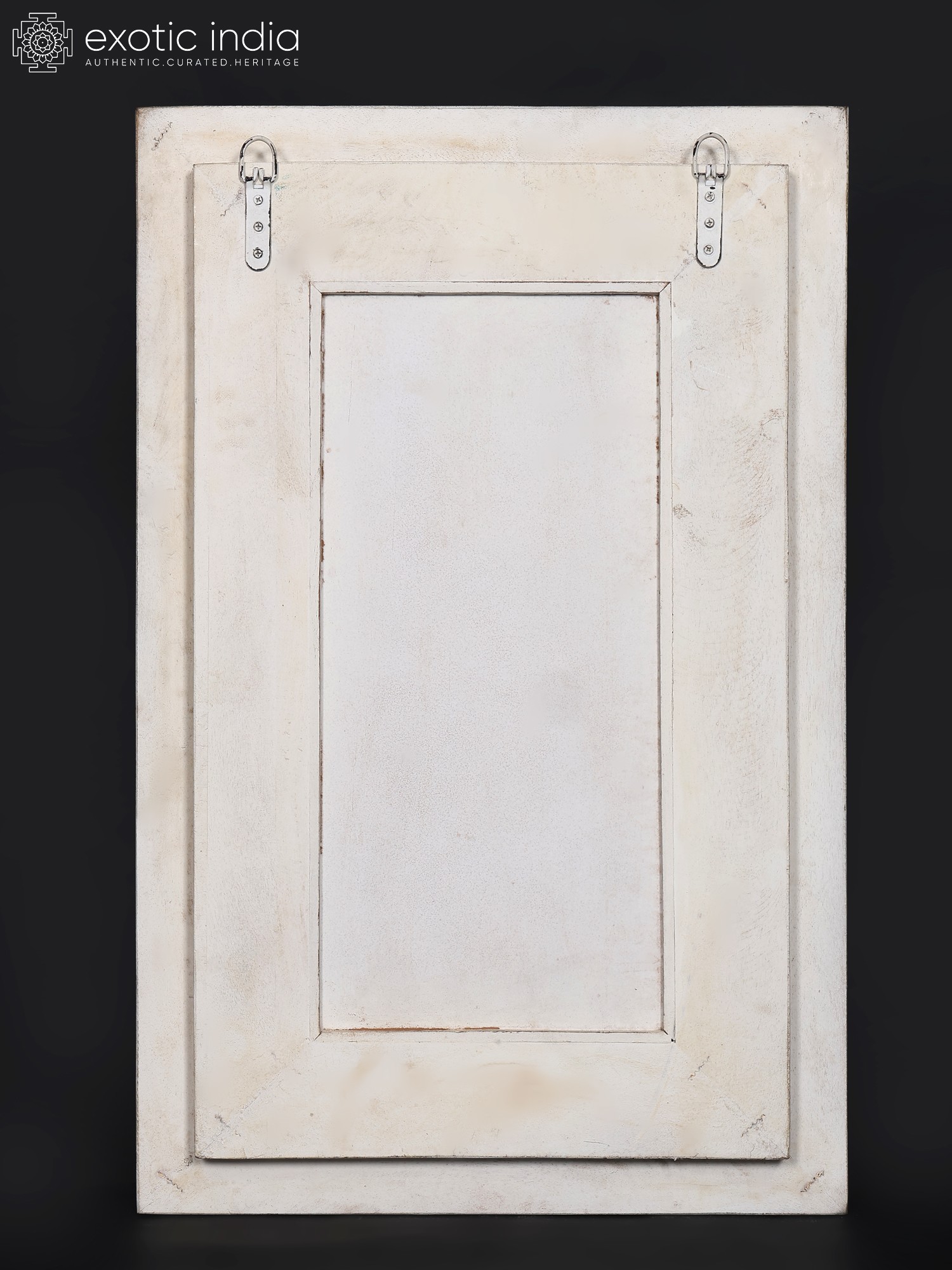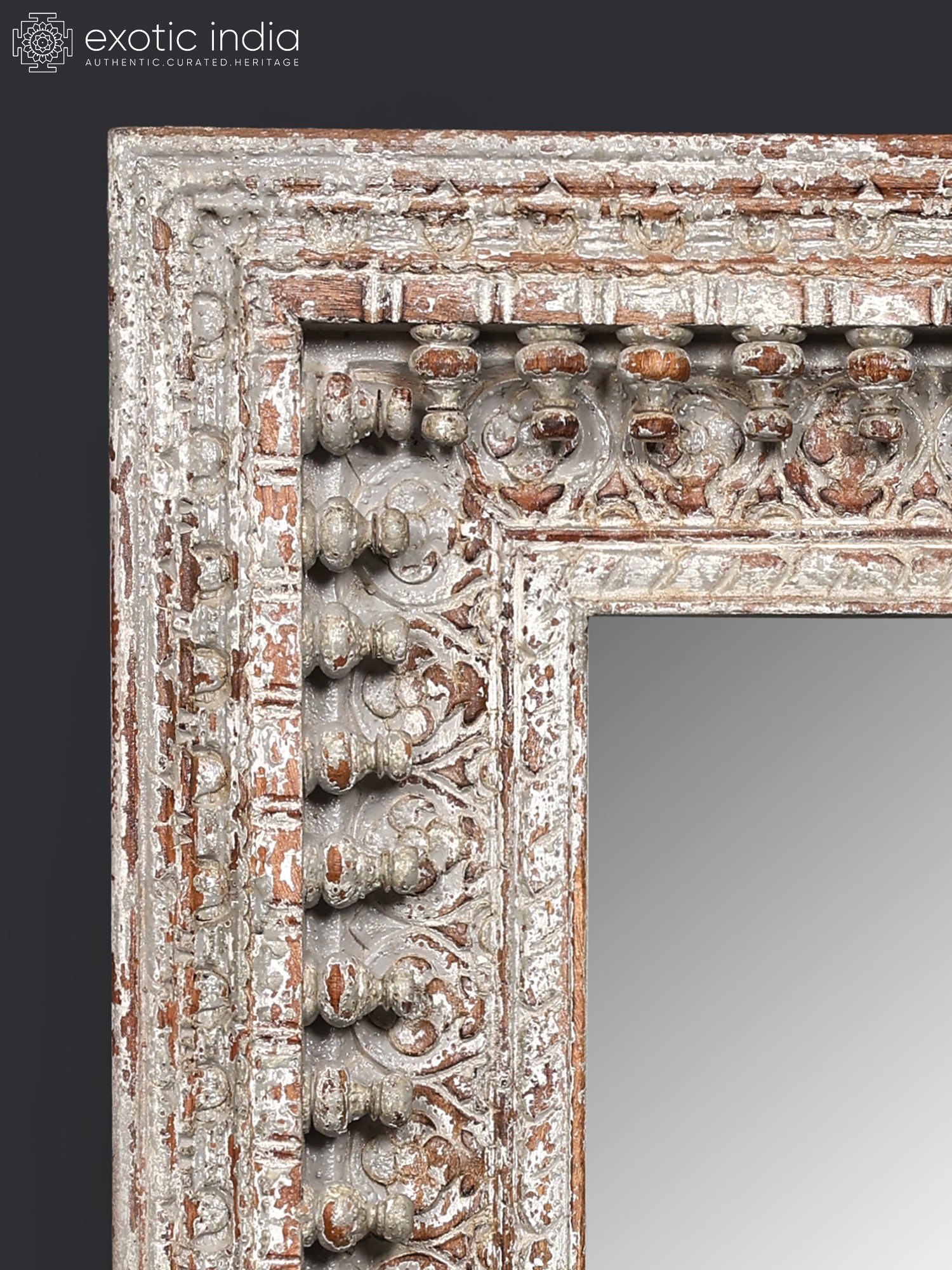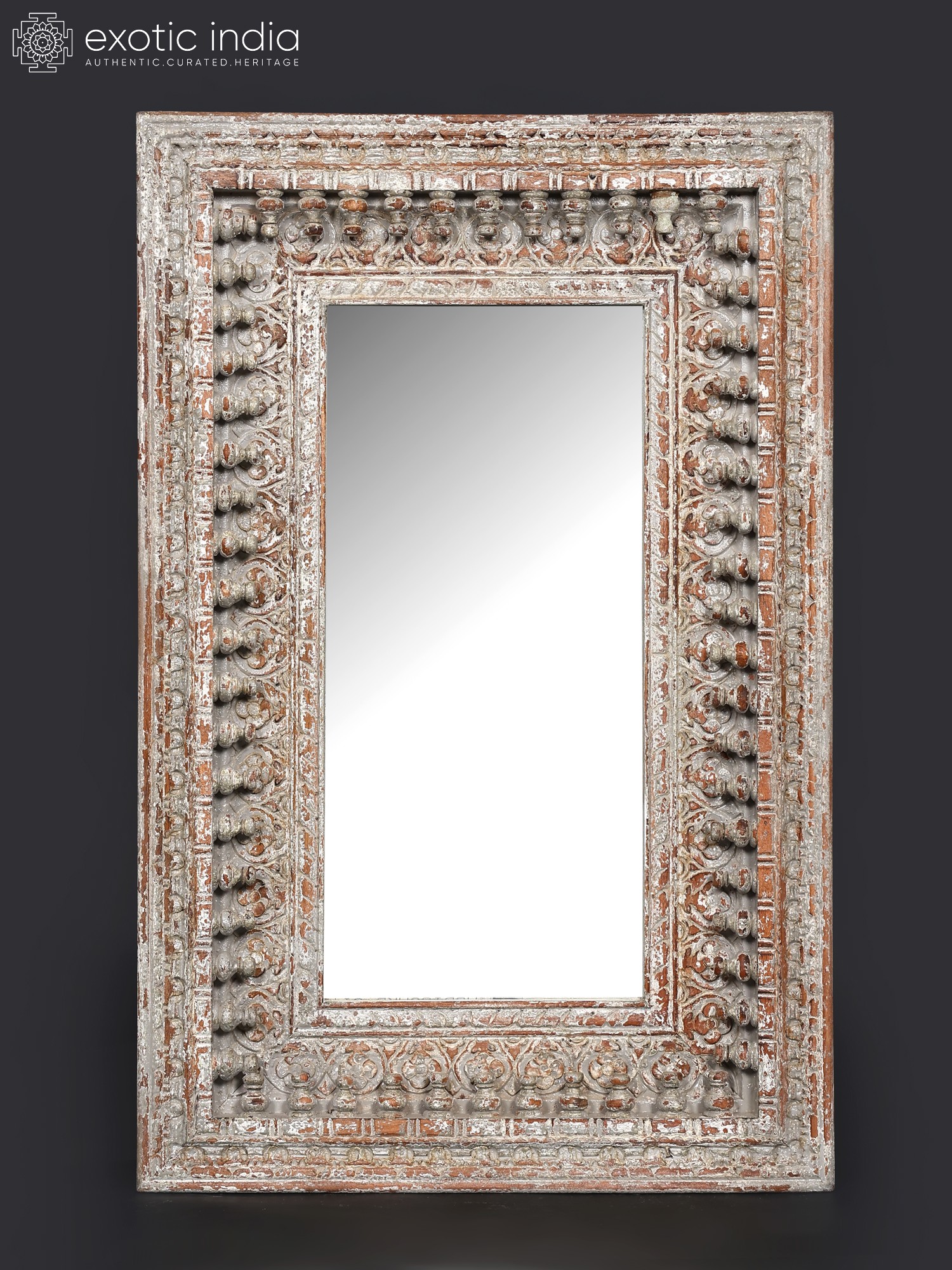 The mirror's frame is a masterpiece of hand-carved artistry. Notice the stunning detail in the frame's design—intricate floral motifs and repeating patterns are woven together to create a visually rich and captivating border. The distressed finish, with its subtle variations in color and texture, adds to the mirror's antique aesthetic. The aged look imparts a sense of history and character, lending an air of sophistication and old-world charm to your home. This mirror is a unique statement piece, reflecting not only your image but also your discerning taste. It’s a conversation starter, a reflection of both your style and the artistry behind its creation.
