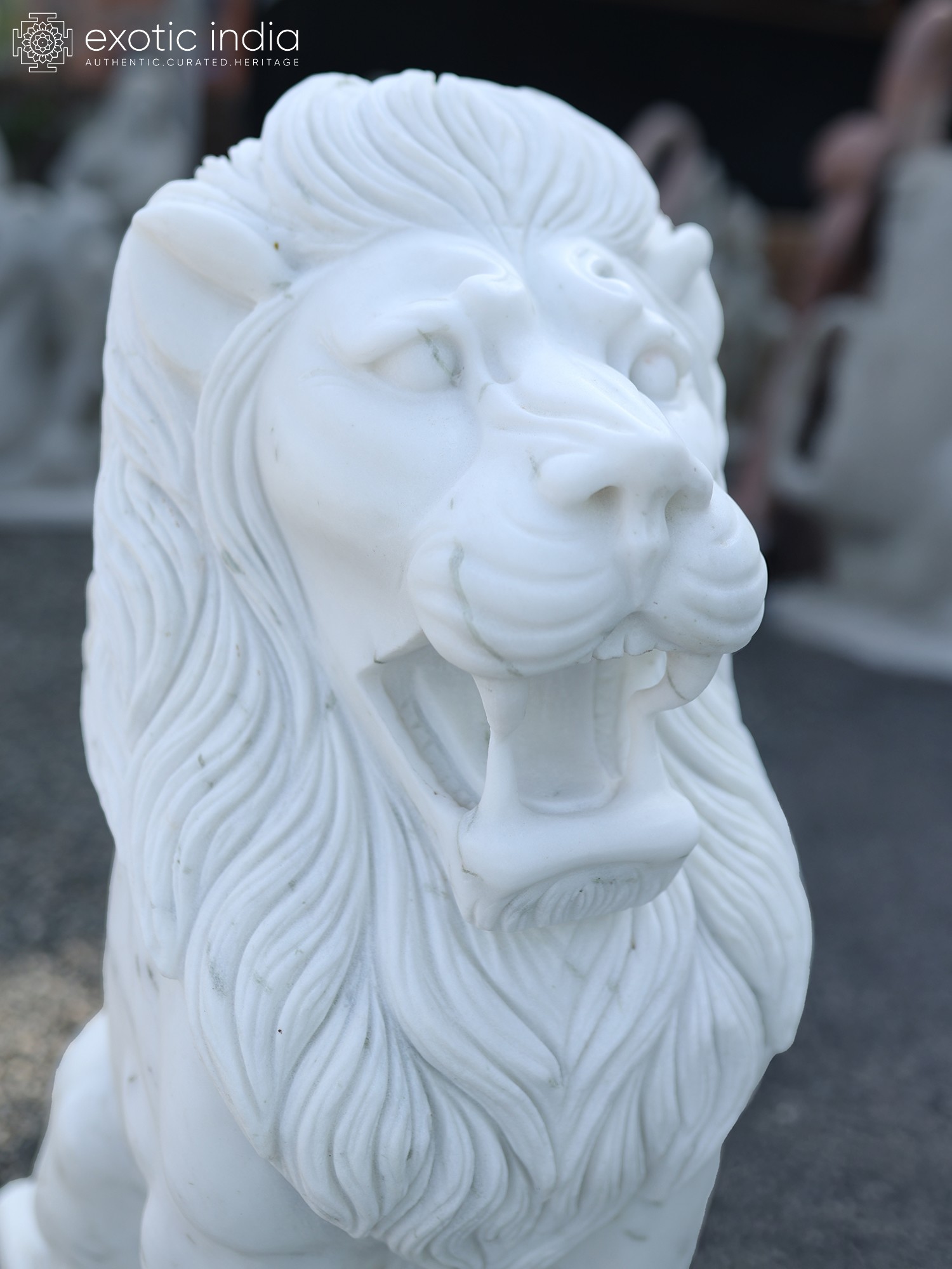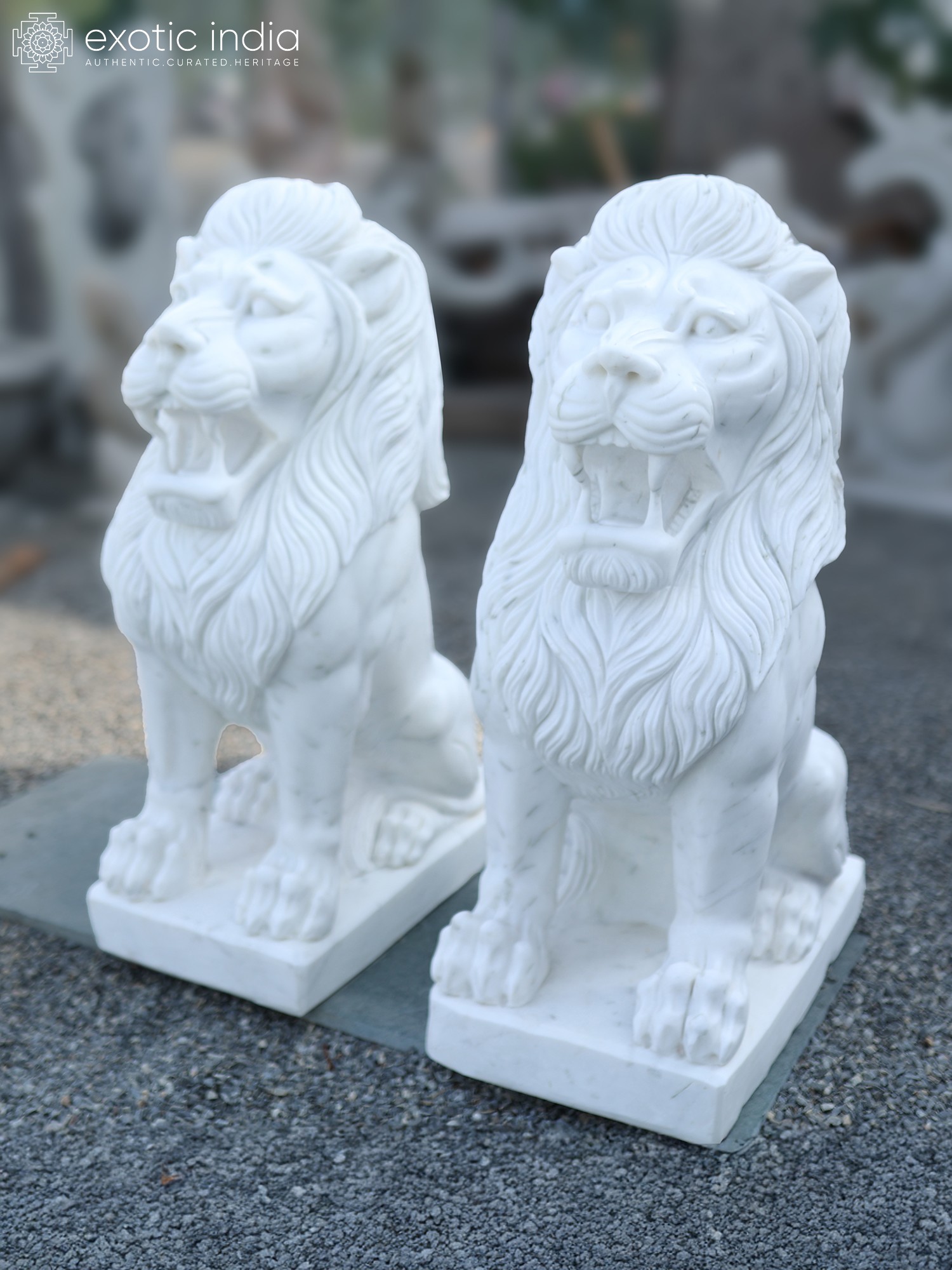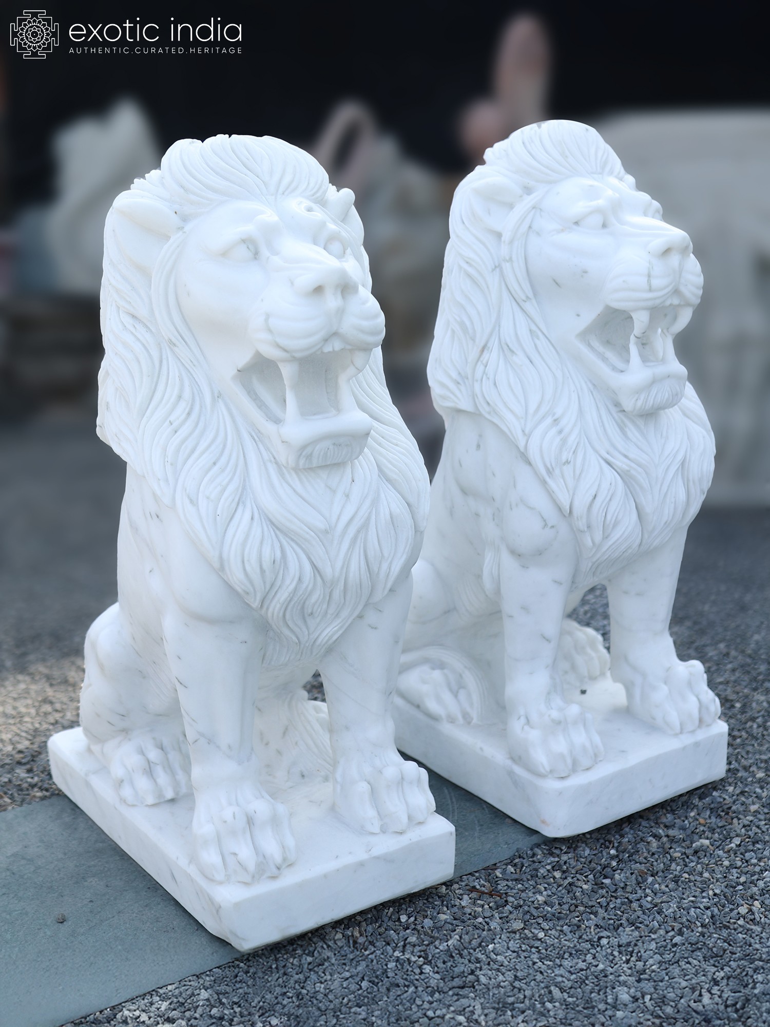 Symbol of Guardianship - Pair Statue of Lion | Home Decor | White Marble | Excellent Indian Art