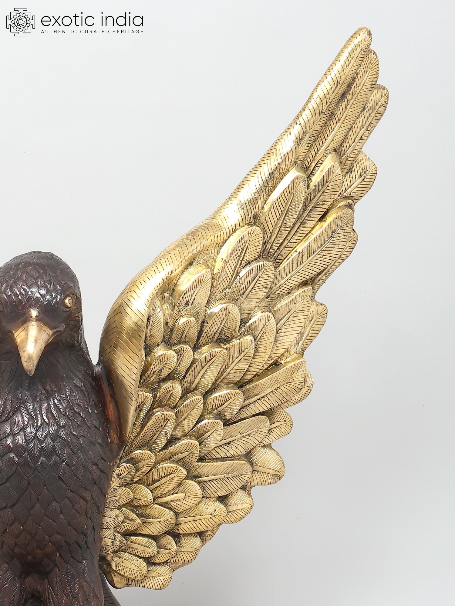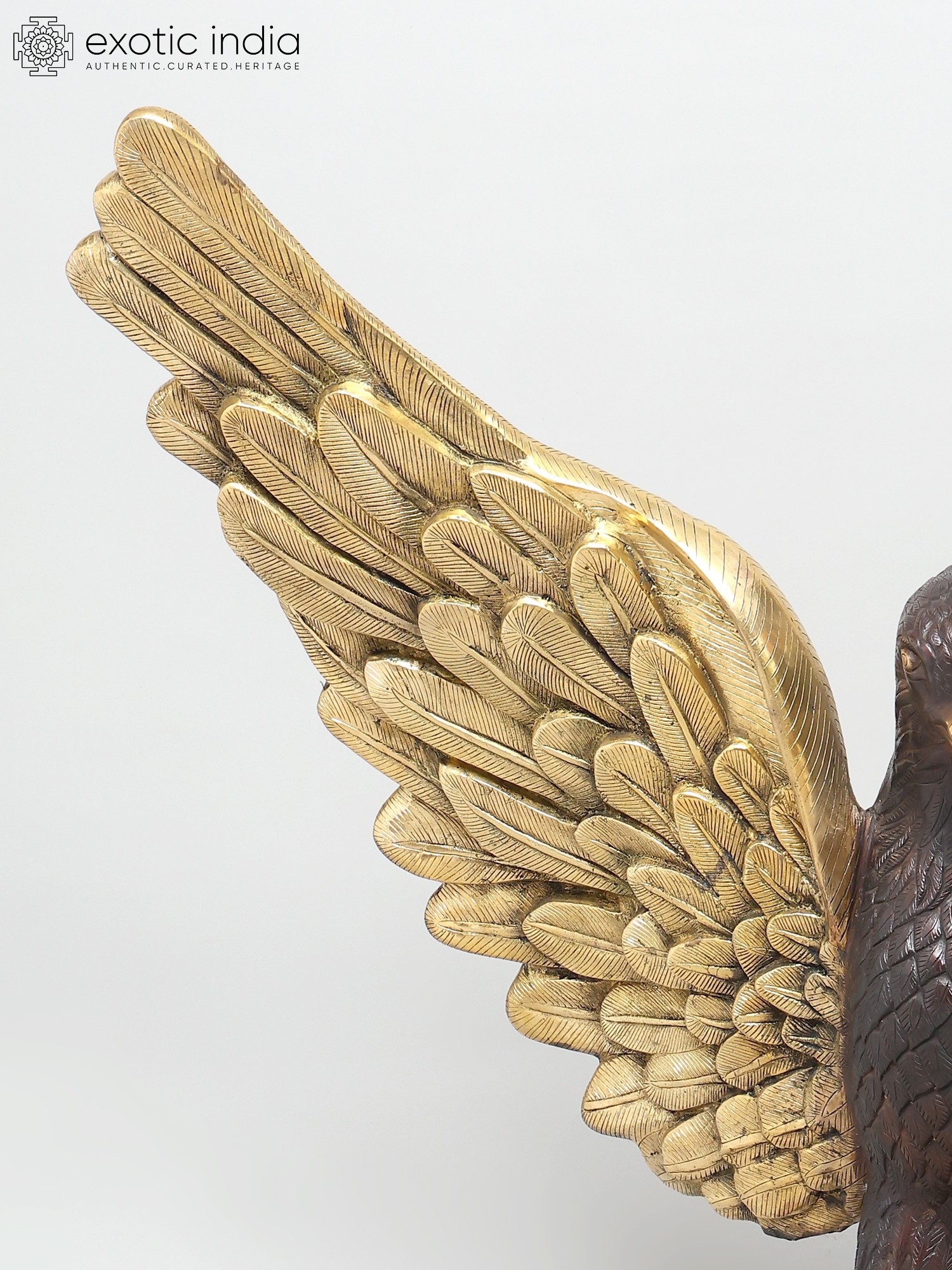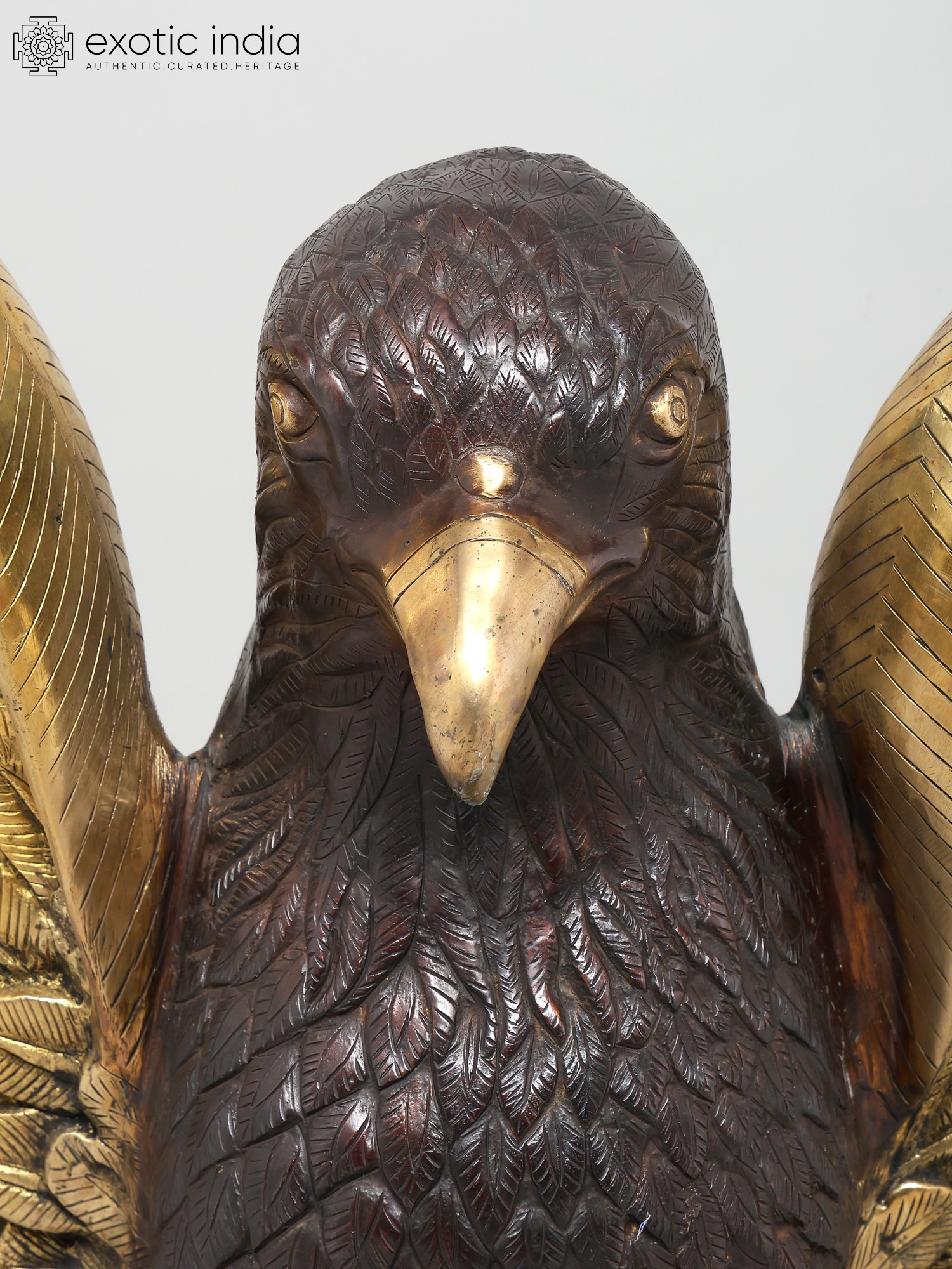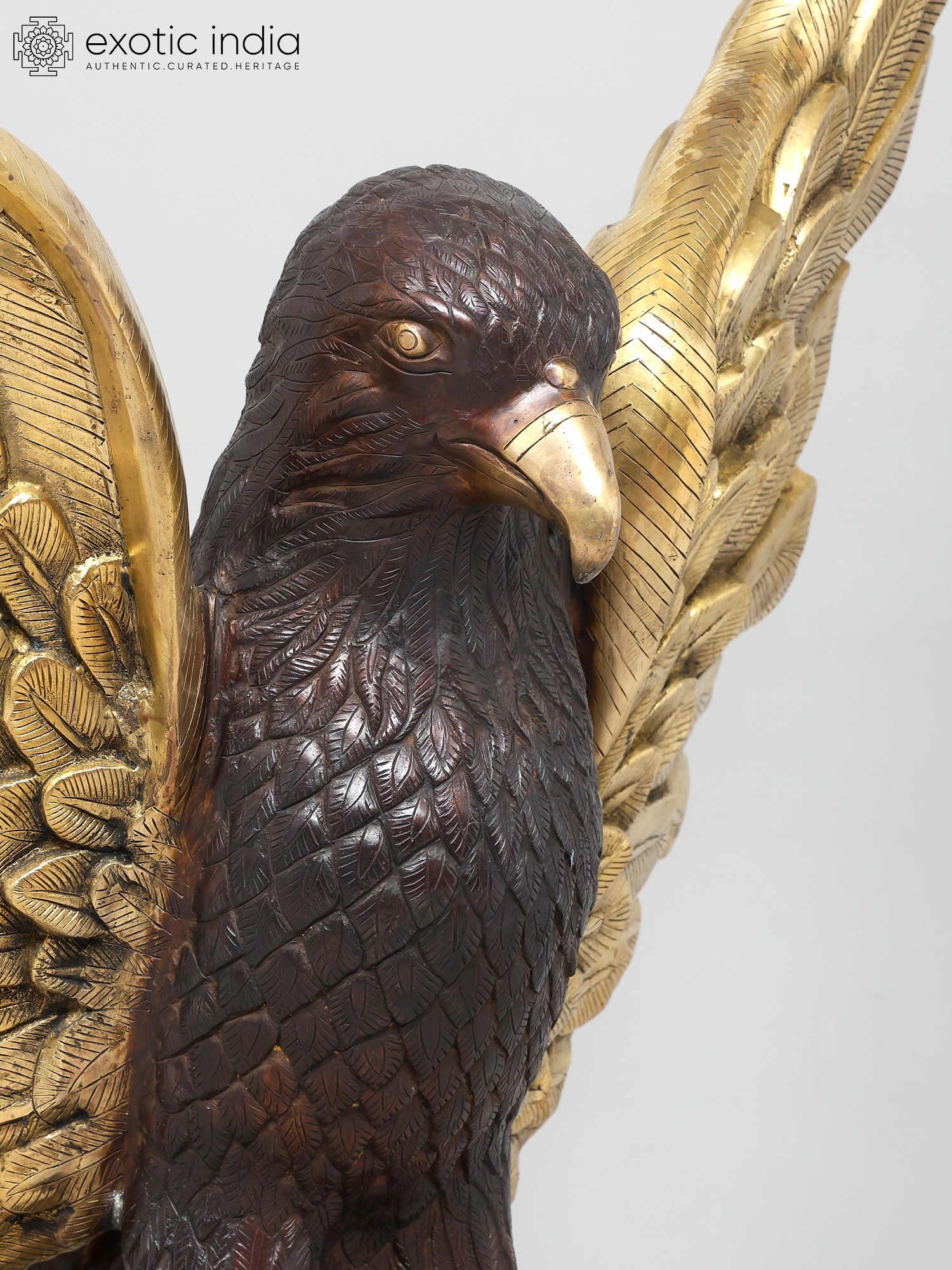 This magnificent brass statue captures the awe-inspiring essence of an eagle, a creature renowned for its power, vision, and freedom. Standing at an impressive height, this sculpture is more than just a decorative piece; it is a statement of elegance and a testament to the artistry of traditional craftsmanship. The majestic golden wings are spread wide, as if poised for flight, drawing the eye with their intricate detailing and lustrous sheen. Each feather is meticulously sculpted, conveying a sense of lifelike texture and movement that is truly captivating.