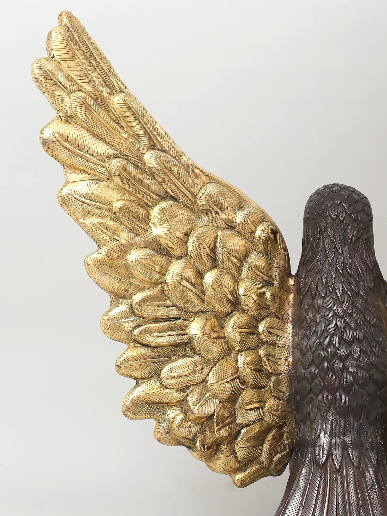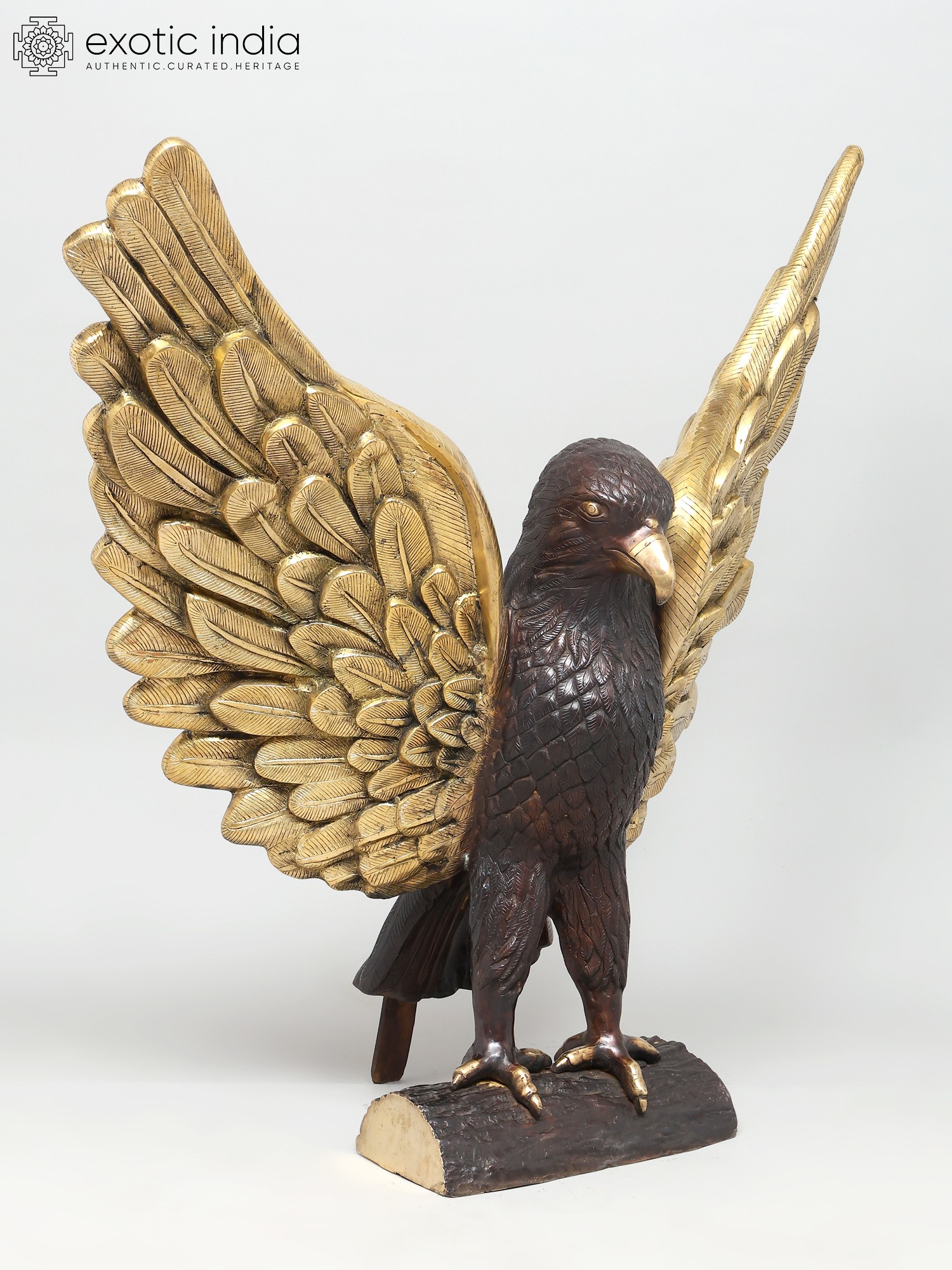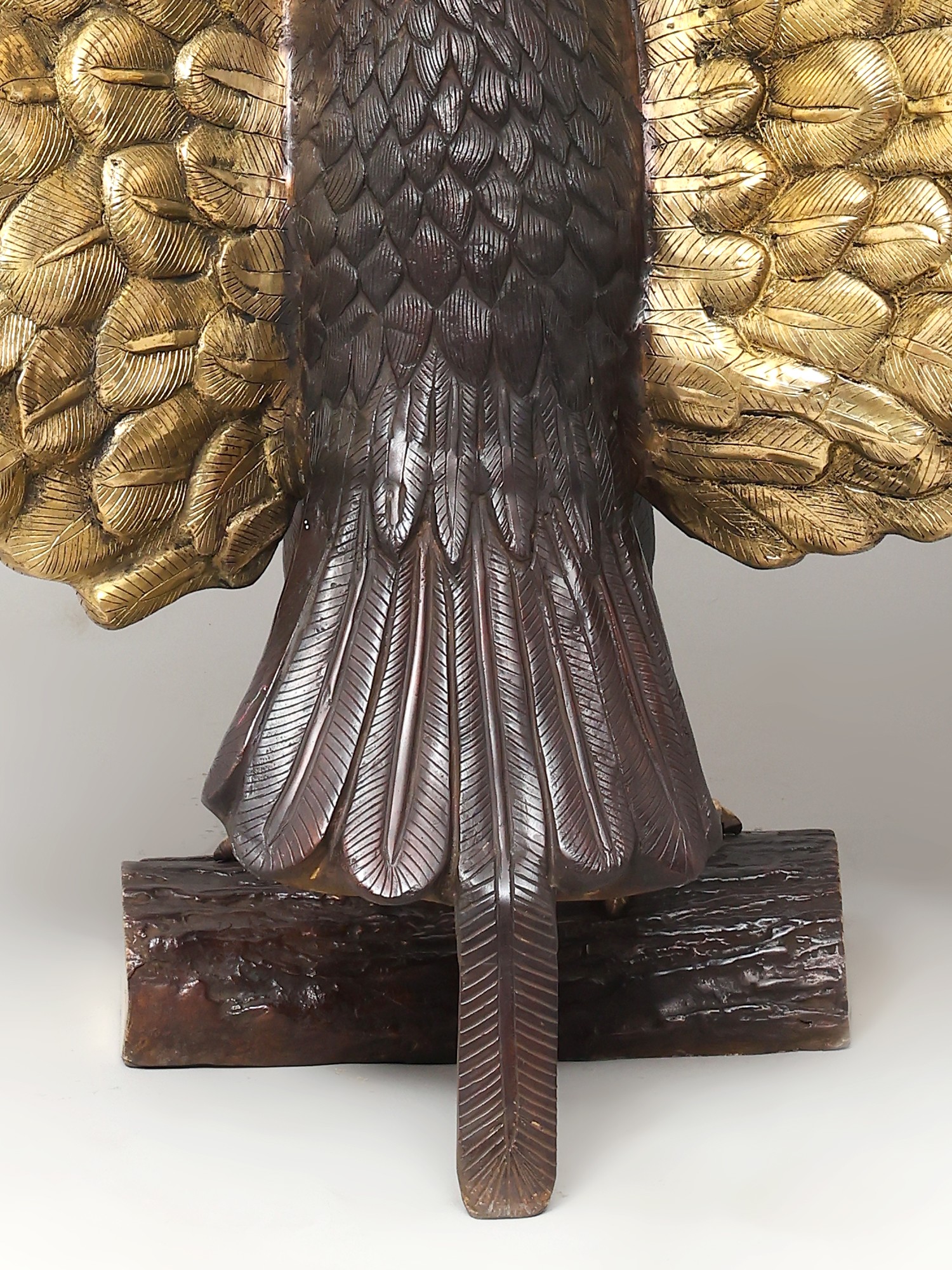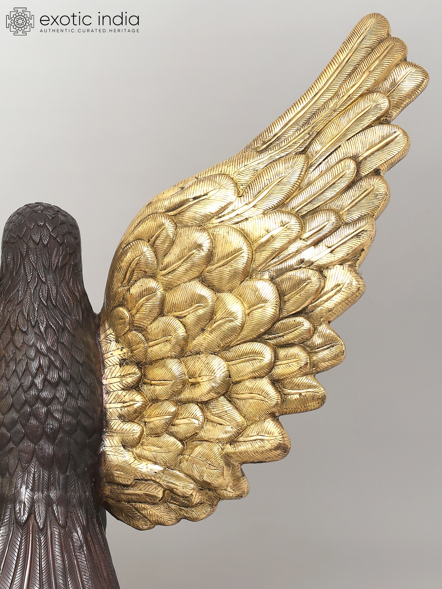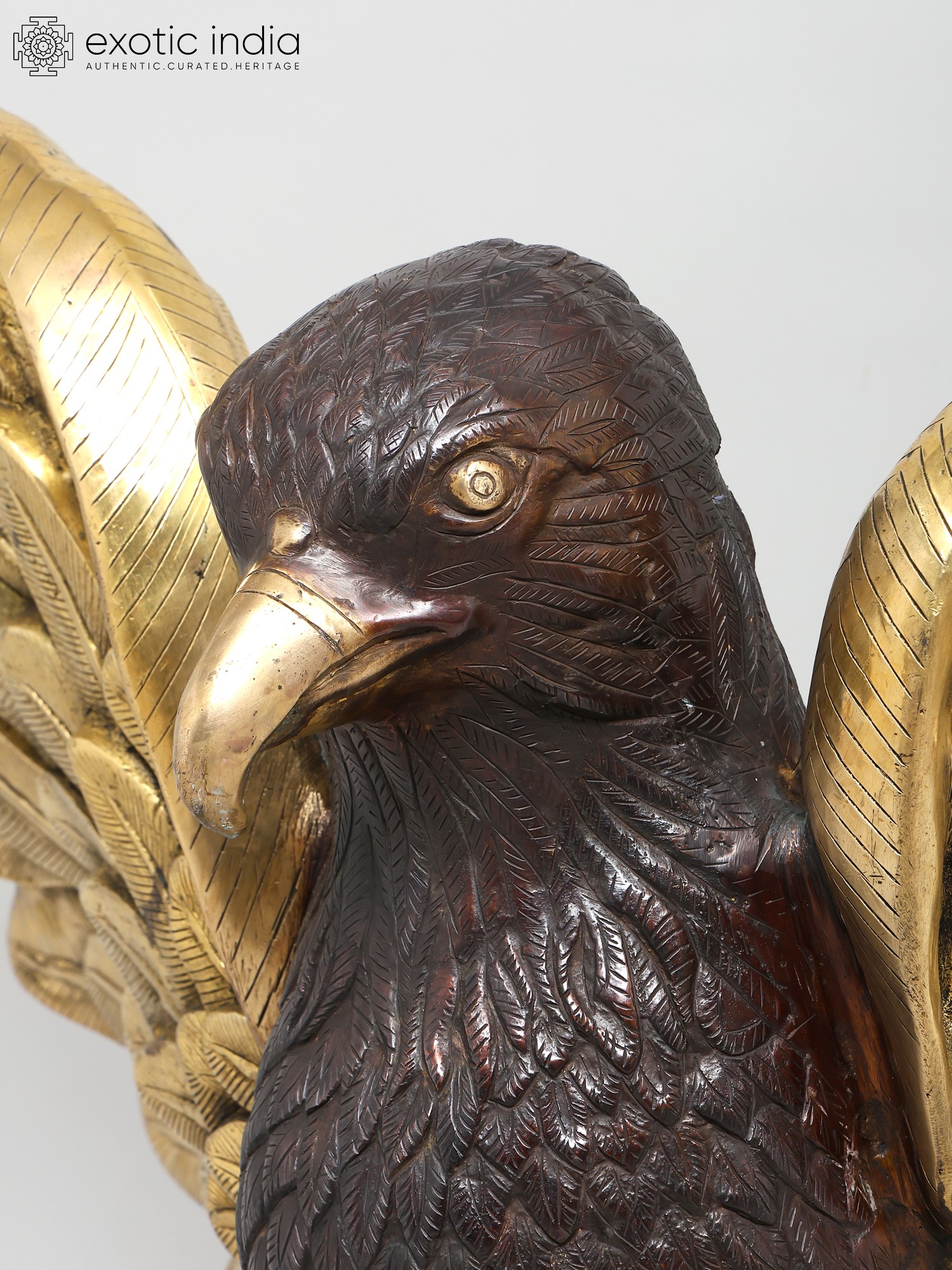This magnificent brass statue captures the awe-inspiring essence of an eagle, a creature renowned for its power, vision, and freedom. Standing at an impressive height, this sculpture is more than just a decorative piece; it is a statement of elegance and a testament to the artistry of traditional craftsmanship. The majestic golden wings are spread wide, as if poised for flight, drawing the eye with their intricate detailing and lustrous sheen. Each feather is meticulously sculpted, conveying a sense of lifelike texture and movement that is truly captivating.