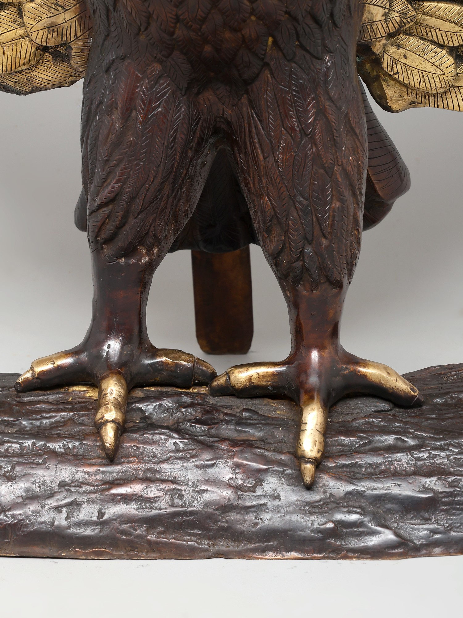 Expertly cast in brass, this eagle statue boasts a rich, dark patina on its body that contrasts beautifully with the radiant golden hue of its wings. This masterful juxtaposition of colors and textures highlights the inherent qualities of the material and the skill of the artisan. The attention to detail extends to every aspect of the sculpture, from the sharp, piercing gaze of the eagle's eyes to the powerful grip of its talons on the rustic log it stands upon. The base itself, designed to resemble a piece of weathered wood, grounds the sculpture and adds an organic, natural element to its overall design.