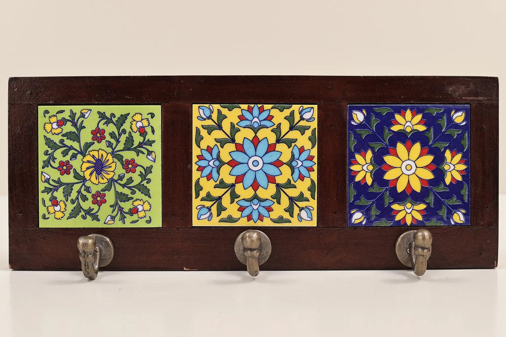 The highlight of this key holder lies in its stunning ceramic tile inlays. Each tile features a unique and intricate floral design, bringing a burst of color and vibrancy to the piece. The hand-painted details on the tiles showcase the artisan's meticulous attention to detail and create a captivating visual focal point. The vivid hues and patterns add a touch of cheerfulness to your daily routine, making it a pleasure to grab your keys on the way out the door.