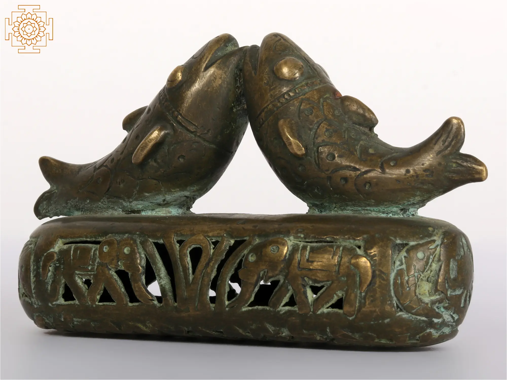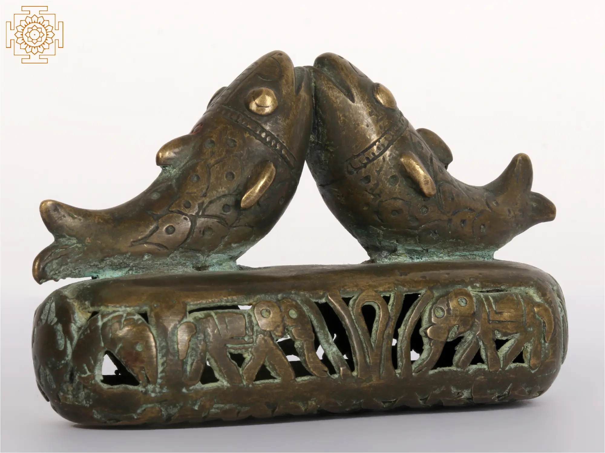 The design showcases two elegantly sculpted fish, poised in a playful, almost kissing, stance. The subtle details etched onto their forms lend them a lifelike quality, capturing the fluid grace of these aquatic creatures. These intricate details are what truly set this item apart. Beneath the fish, the base is adorned with an elaborate cut-out design of elephants. The overall form is well-proportioned and carefully considered. It functions as a decorative piece and as a tribute to artistic traditions. The elephant motifs add another layer of cultural richness, imbuing the object with symbolism and meaning. The artistry and meticulous craftsmanship, are evident in every curve, line and carving. It stands as a unique piece, adding a touch of cultural elegance to your surroundings.