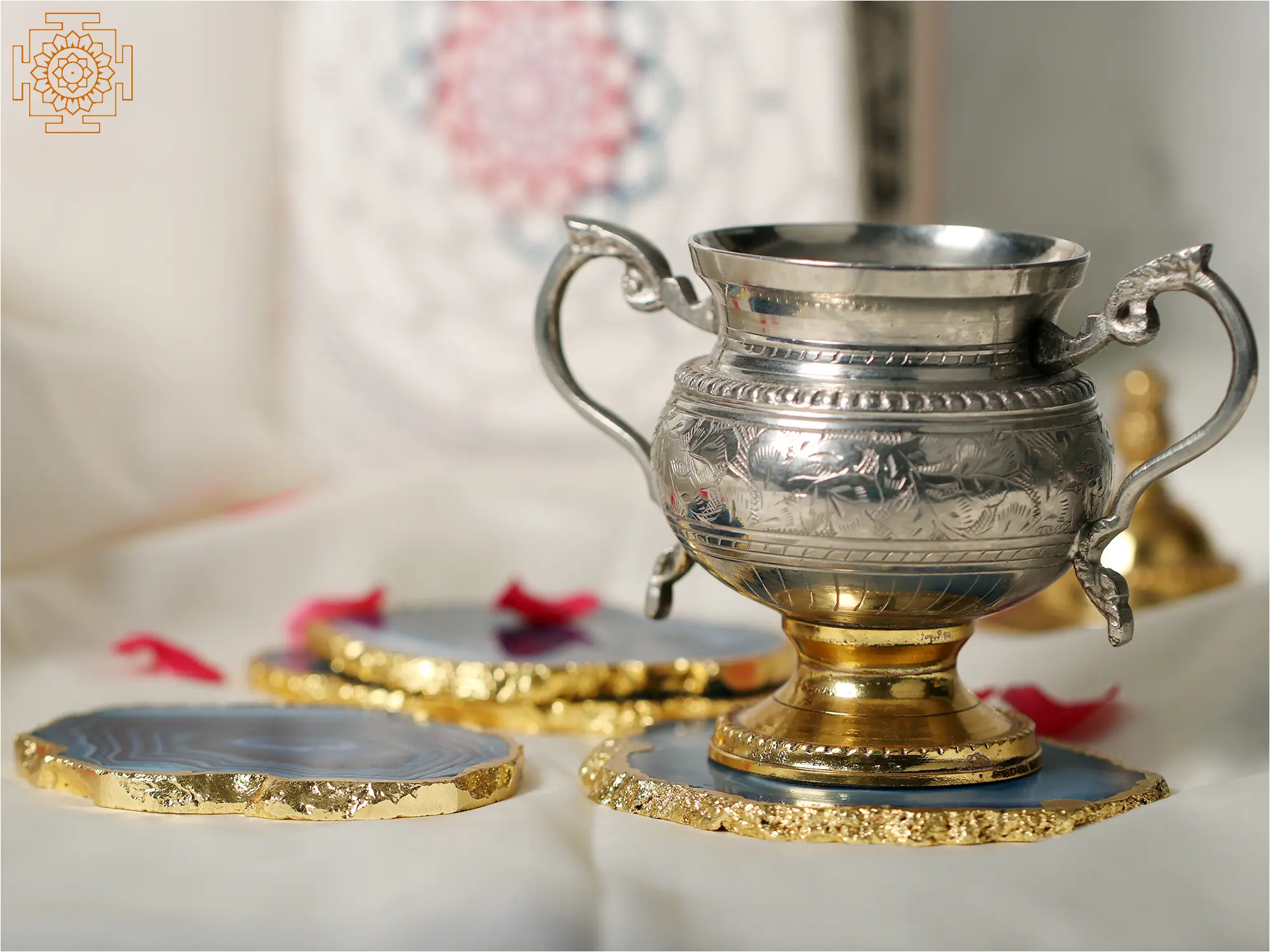 This verse from the Shanti Mantra repeatedly expresses prayers requesting harmony in all beings. Vaastu aims to create calm in people and their homes where they repose. It attempts to educate people about the good and bad consequences of elements, as well as how appropriately putting them may promote enjoyment. The Small Blue Agate Stone Crystal Coasters with Gold Edge (4 Piece Set) is a beautiful combination of beauty and vitality. Blue agate denotes tranquillity, communication, and emotional equilibrium in Vaastu principles. These coasters exemplify these characteristics, providing both aesthetic appeal and metaphysical importance. Blue agate is said to convey calming vibrations that encourage harmony and quiet dialogues in Vaastu. The stunning gold-edged design enhances the natural patterns of the stone.