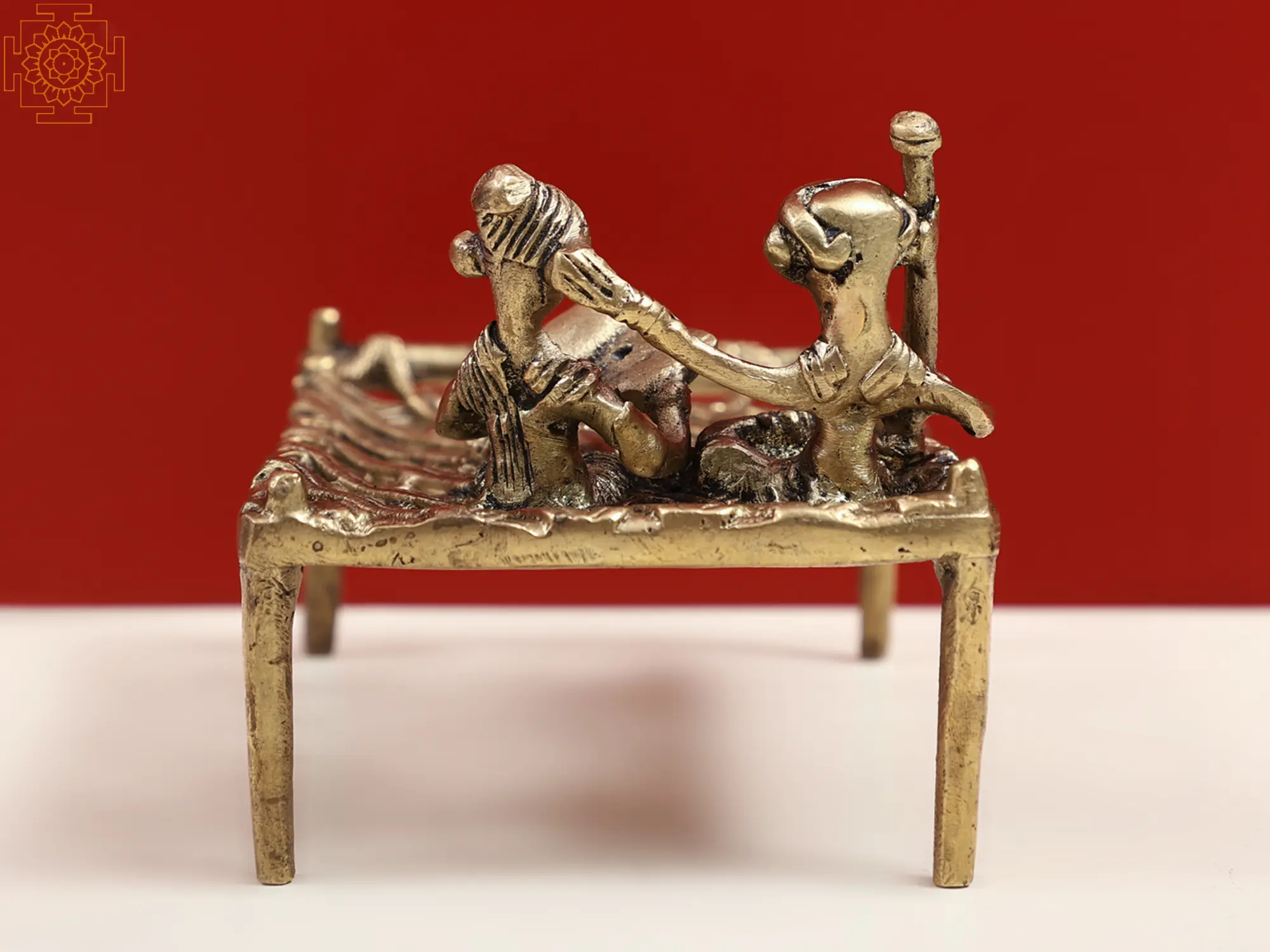 A simple moment from the everyday life of rural regions is transformed into an artistic element in this small brass artwork, depicting a teacher sitting with their student on a Charpai (a woven bed used in rural India). Even in its small size, the brass piece manages to capture details that infuse the figures with a sense of animation. With a stick in his hand, the teacher holds the ear of the student, who can be identified as a female due to her Juda (hairdo), to reprimand her, as she opens her book. A relatable event from the life of an average Indian student- being disciplined by the teacher, makes this a piece filled with humor, which is expressed in the tone of the famous tribal artworks of Dhokra.