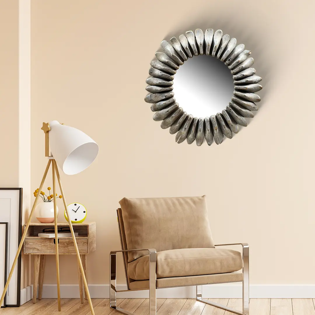 Elevate your home decor with this striking and artistic mirror. More than just a reflective surface, this piece is a conversation starter, showcasing a captivating design that blends vintage charm with natural beauty. The outer frame is artfully constructed from a multitude of weathered wooden shoe forms, each one possessing its own unique character and history. The smooth, curved surfaces of these shoe lasts have been carefully arranged to create a stunning circular mosaic, evoking a sense of organic flow and intricate craftsmanship. The natural gray patina of the wood lends an authentic, aged feel, suggesting that these forms have been repurposed from a bygone era, adding a layer of intriguing narrative to your space.
