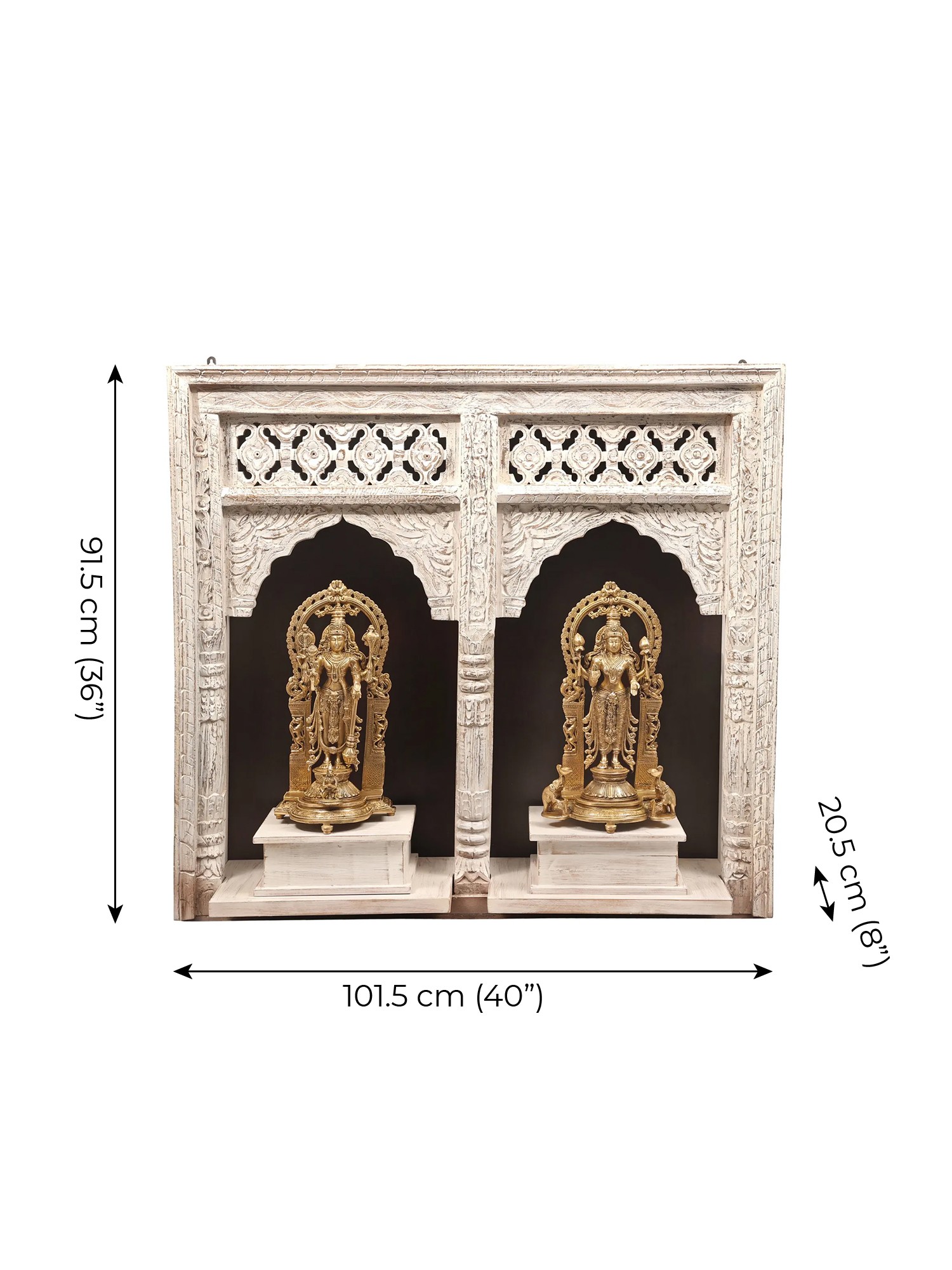 In this beautiful wooden temple we have for you, God Vishnu and Goddess Lakshmi are depicted standing side-by-side. The temple has separate pedestals, with a central supporting pillar, for Vishnu and Lakshmi. The temple comes with wall-hanging screws and is structured like an actual temple, complete with beautiful carving upon its walls and the exquisite statues of the divine couple housed within. Vishnu is represented holding the divine conch, panchajanya and sudarshana chakra in his rear hands.