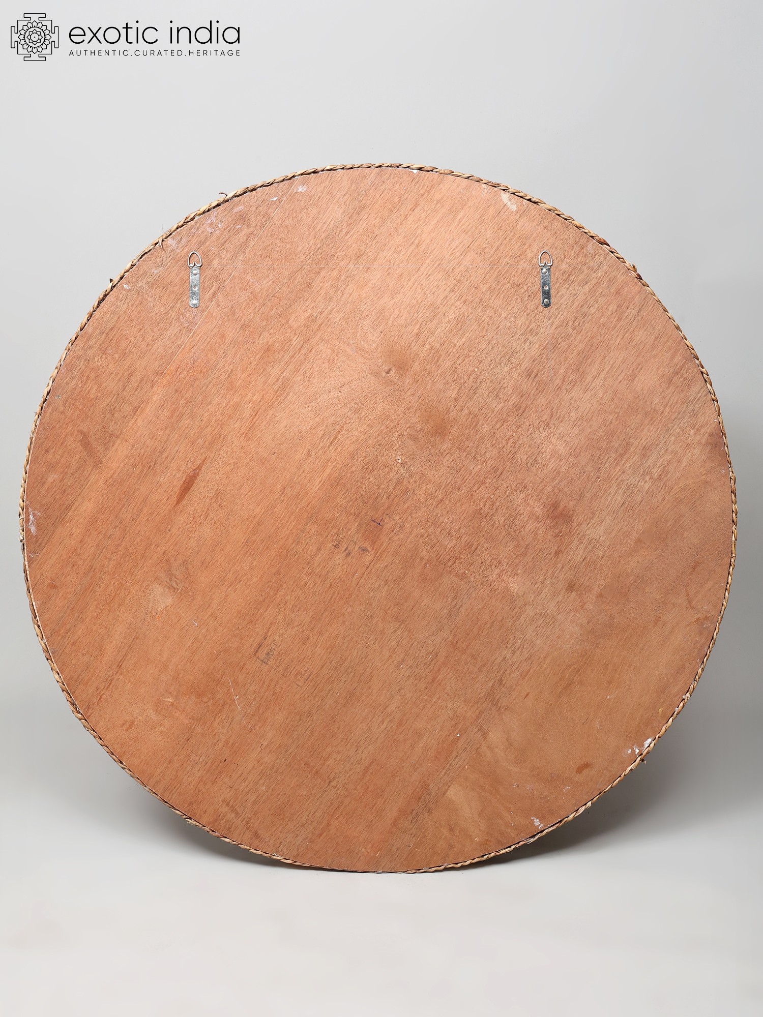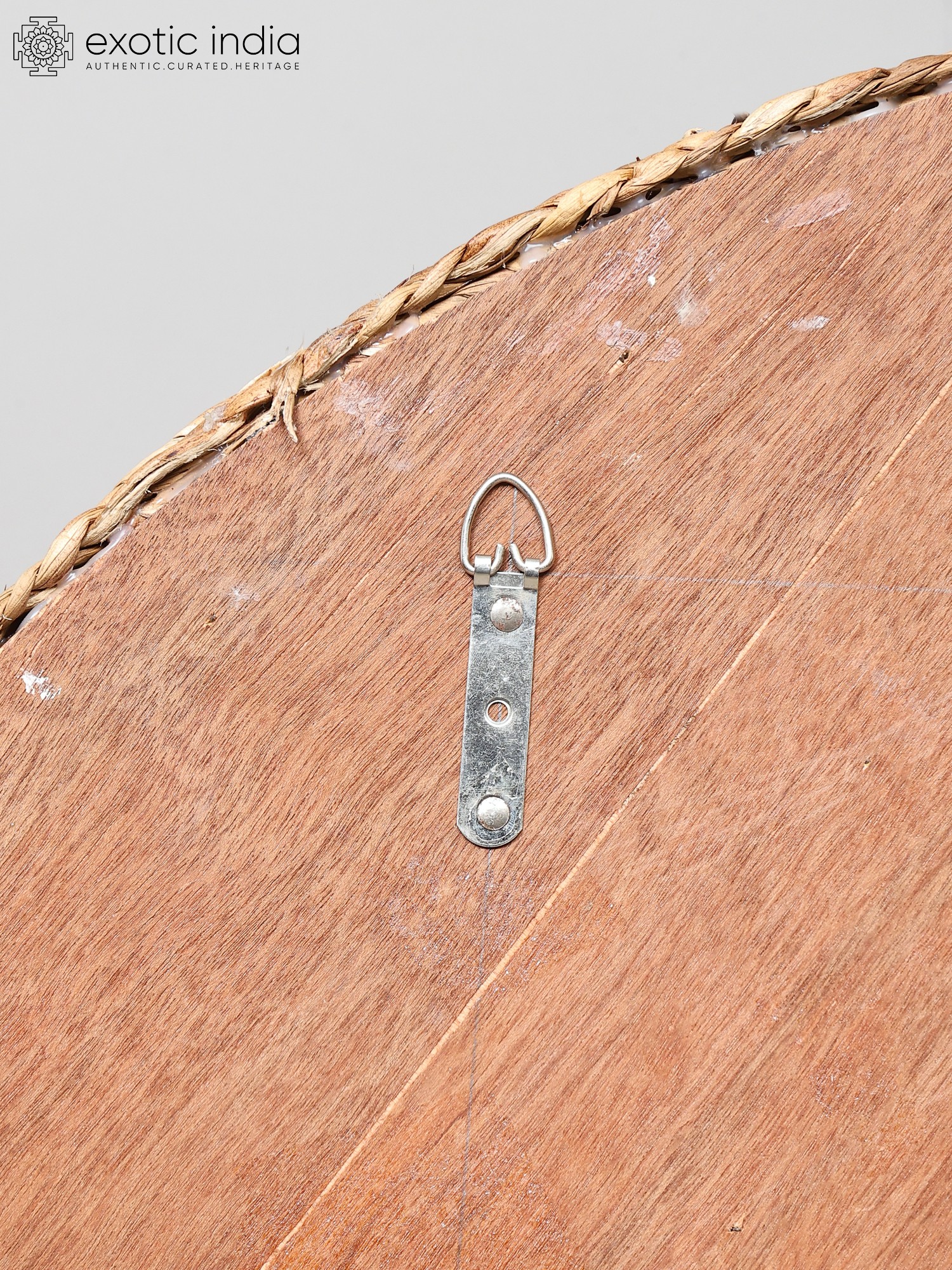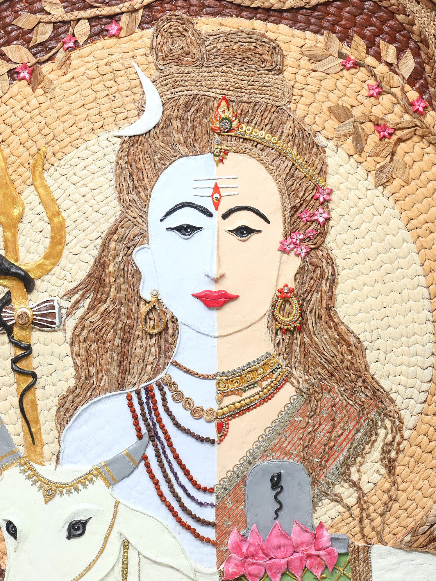 This exquisite circular wall decor piece captures the profound spiritual concept of Ardhanarishvara, a powerful composite deity formed from the union of Lord Shiva and Goddess Parvati. Representing the synthesis of masculine and feminine energies, this artwork is a testament to the harmonious balance that governs the universe. The skilled artisans have meticulously crafted this piece using natural jute and wood, infusing it with an earthy charm and a rich, textured aesthetic. The central image showcases the divine Ardhanarishvara, with Shiva's iconic third eye and serpentine adornments on one side, juxtaposed with Parvati's graceful features and traditional jewelry on the other. Their faces are rendered with delicate artistry, their expressions conveying both immense power and serene compassion. The intricate detailing in their attire, adorned with beads and woven patterns, speaks volumes of the craftsmanship involved.