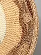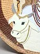 Flanking the divine couple is Nandi, Lord Shiva's devoted vahana, depicted in pristine white. Nandi's serene presence underscores the devotion and divine patronage embodied in this artwork. Adorning Nandi is a beautifully crafted saddle, intricately woven and embellished, further enhancing the visual appeal. To the side, Lord Shiva's potent Trishul, the trident, stands tall, a symbol of his dominion over the past, present, and future, as well as his power to destroy evil. The coiled serpent, Vasuki, wrapping around the Trishul, adds another layer of divine symbolism, representing cosmic energy and protection. Delicate floral accents and woven tree motifs further embellish the composition, adding a touch of natural beauty and ethereal grace. The entire composition is framed by a thick, braided border of jute, providing a rustic yet elegant finish. The circular format itself symbolizes completeness, eternity, and the cyclical nature of existence. The interplay of different textures and shades of jute creates a dynamic visual experience, drawing the viewer into the rich narrative of this sacred representation. This piece is more than just a decorative item; it is an artistic invocation of divine unity and cosmic harmony, designed to bring a sense of peace, balance, and spiritual resonance to any space it adorns.