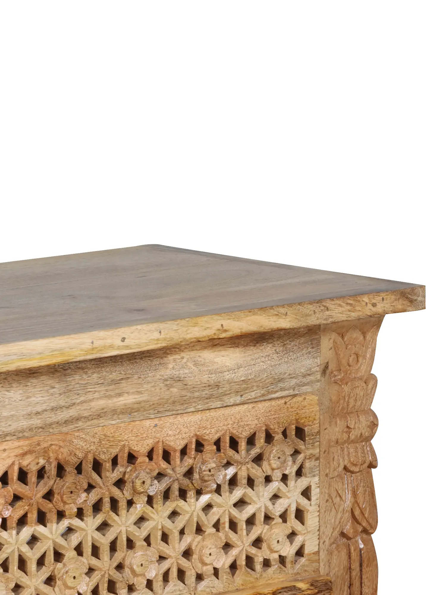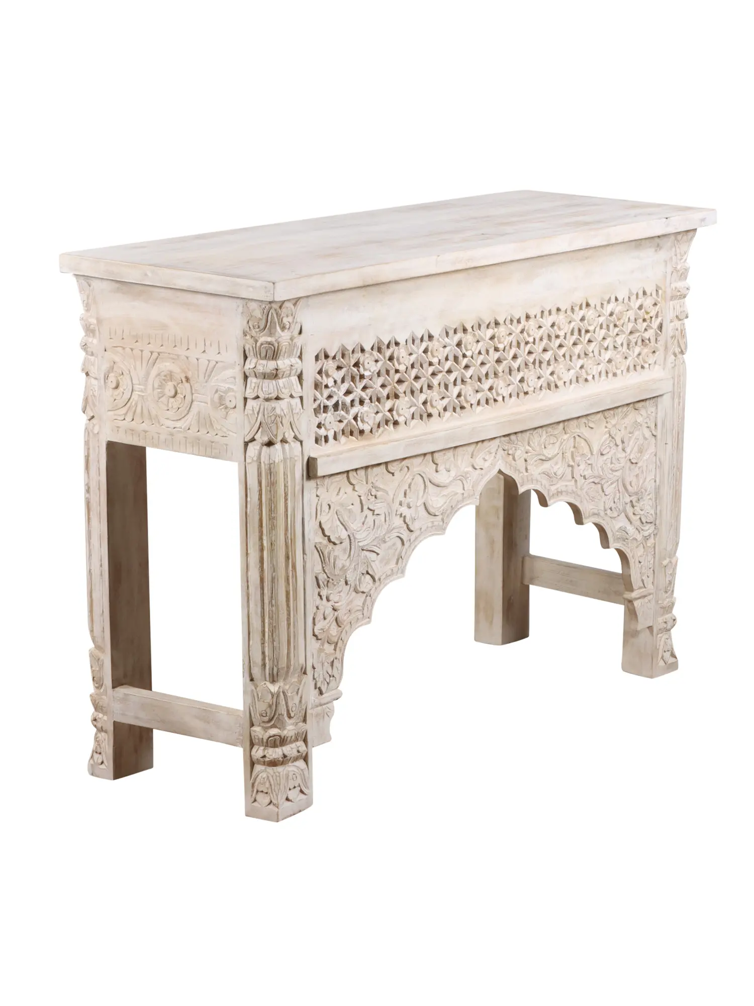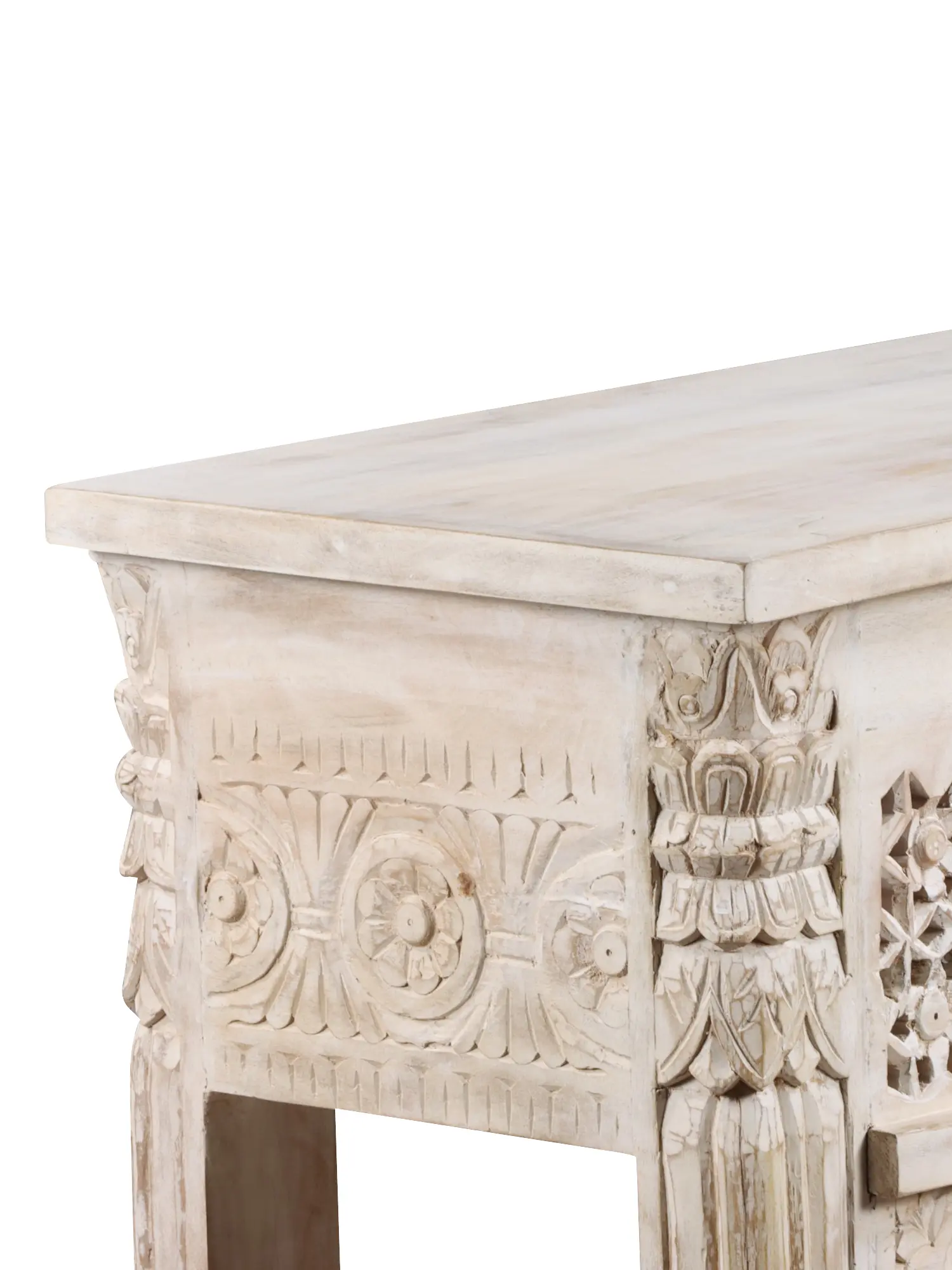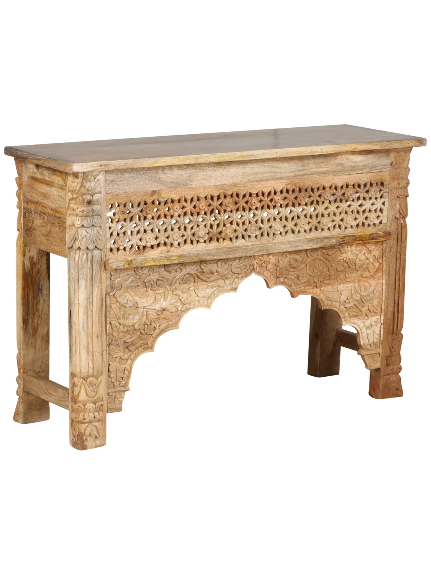 To evoke the aura of antiquity, the piece is given a distressed look, enhancing its appeal as a cherished heirloom. With its timeless design and functional versatility, the Mango Wood Carved Large Console Table seamlessly blends the beauty of the past with the practicality of the present, offering a captivating focal point for any room and a nod to the rich cultural heritage of Rajasthan.