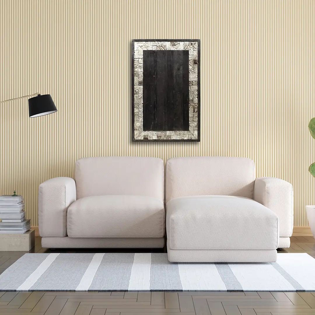 The frame of this exceptional wall art is where its true artistry shines. Hand-carved wooden blocks form a dynamic mosaic, each piece showcasing unique, raised patterns. These intricate designs, reminiscent of stylized leaves and flowing natural motifs, are brought to life through the varied textures and subtle variations in the wood. The aged, off-white finish lends an air of timeless elegance, suggesting a piece with a rich history and a journey through time. This detailed carving is not just decorative; it’s a tactile experience, inviting a closer look and appreciation for the skill involved. ––––––––––––––––––––