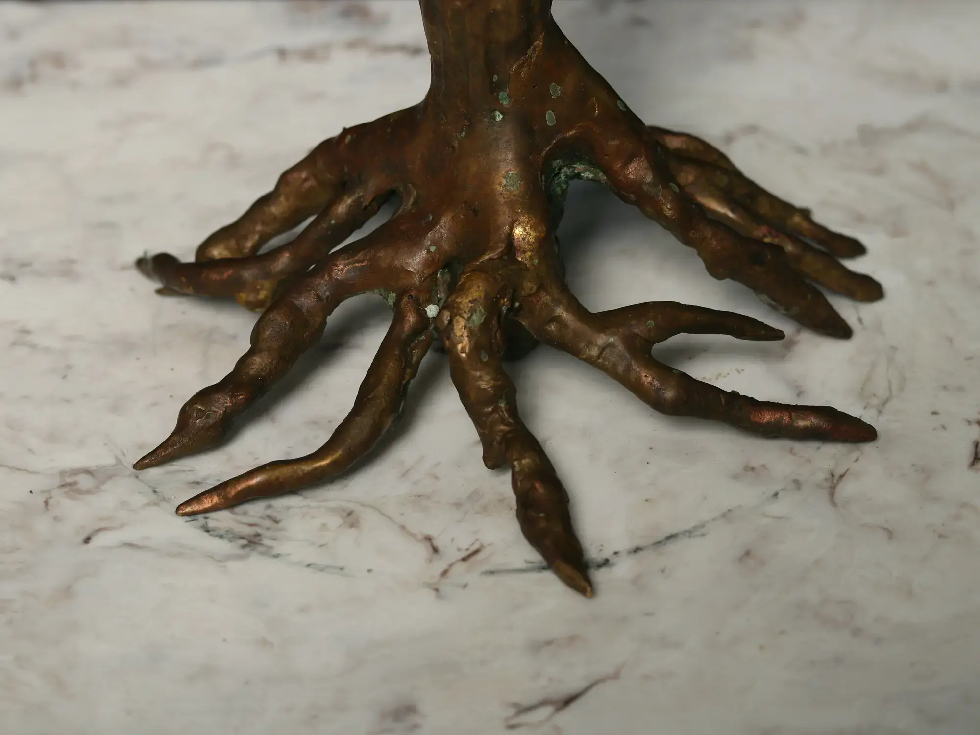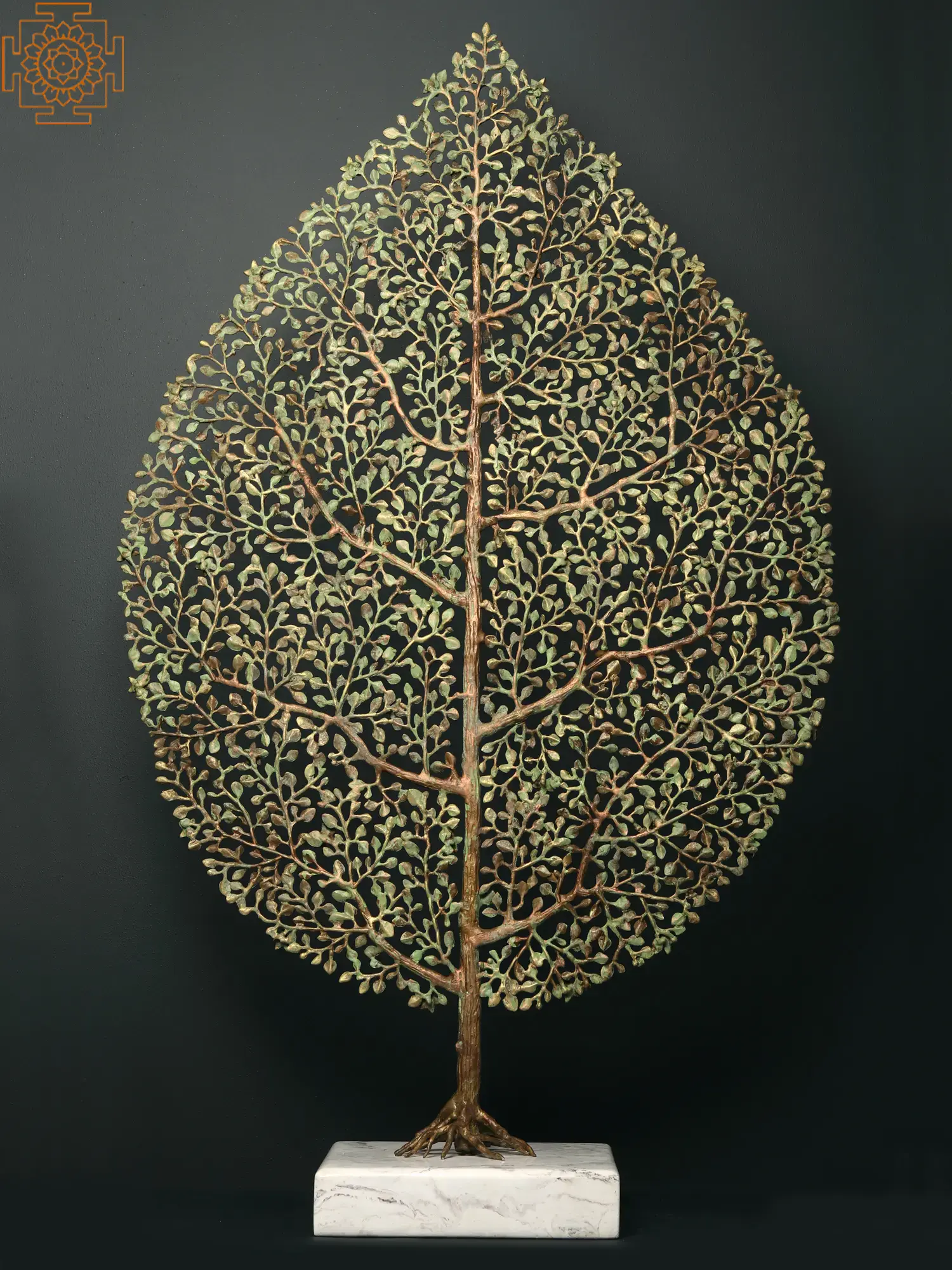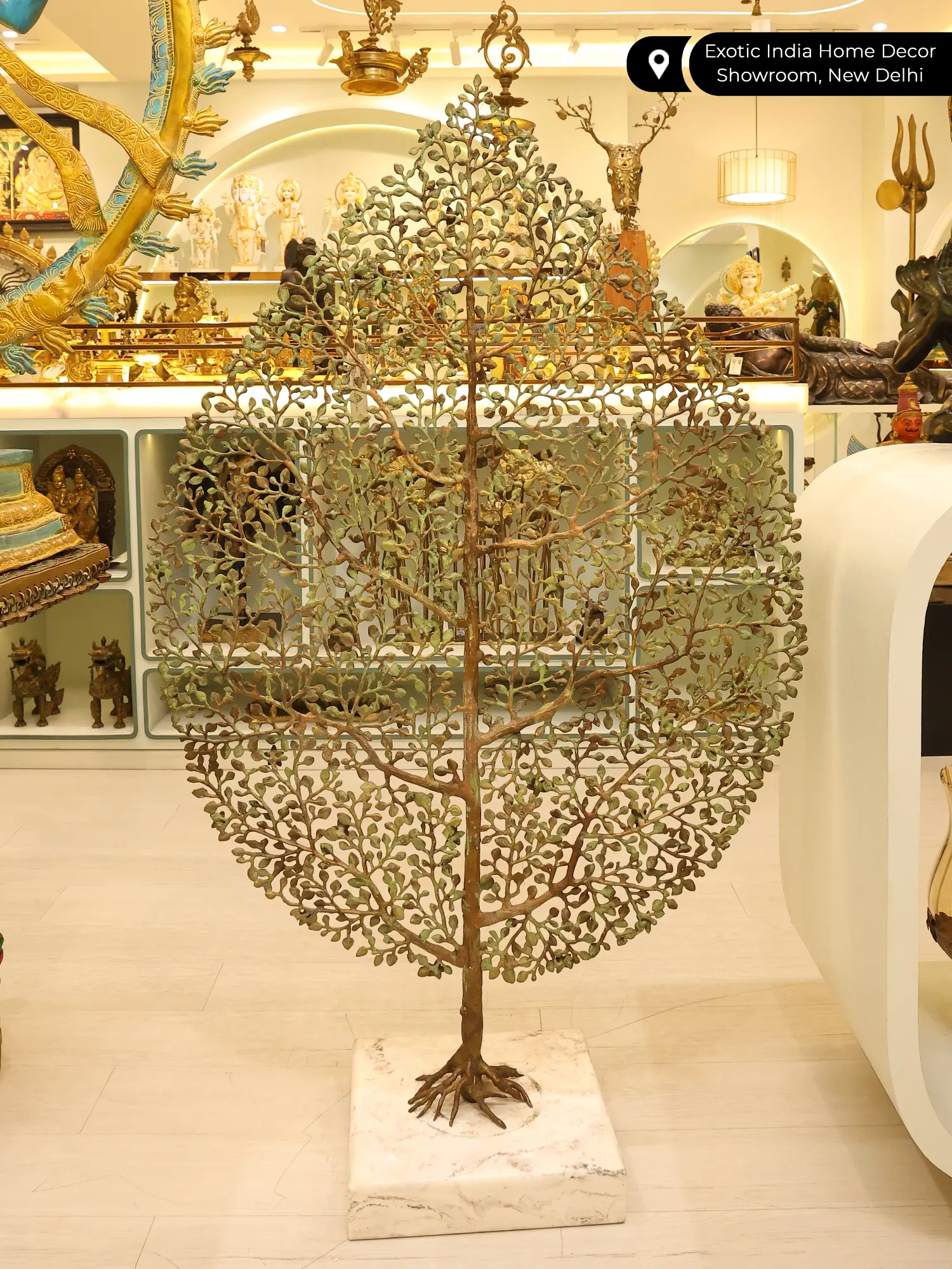 This leaf-shaped tree, a tribute to the enthralling story of Sasoka who became Asoka or Ashoka, is a lovely piece of home décor. This is a brass tree decorated with flowers. Ashoka blossoms are crimson and are linked with Kamdeva. Aside from the mythical implications, the tree is also coated with a blue patina color to give it an old appearance. The tree is intended to stand on a white marble pedestal to give some modern aspects. Keeping this tree in your house will offer positive energy and marital joy, as well as eliminate Shok or sorrow.