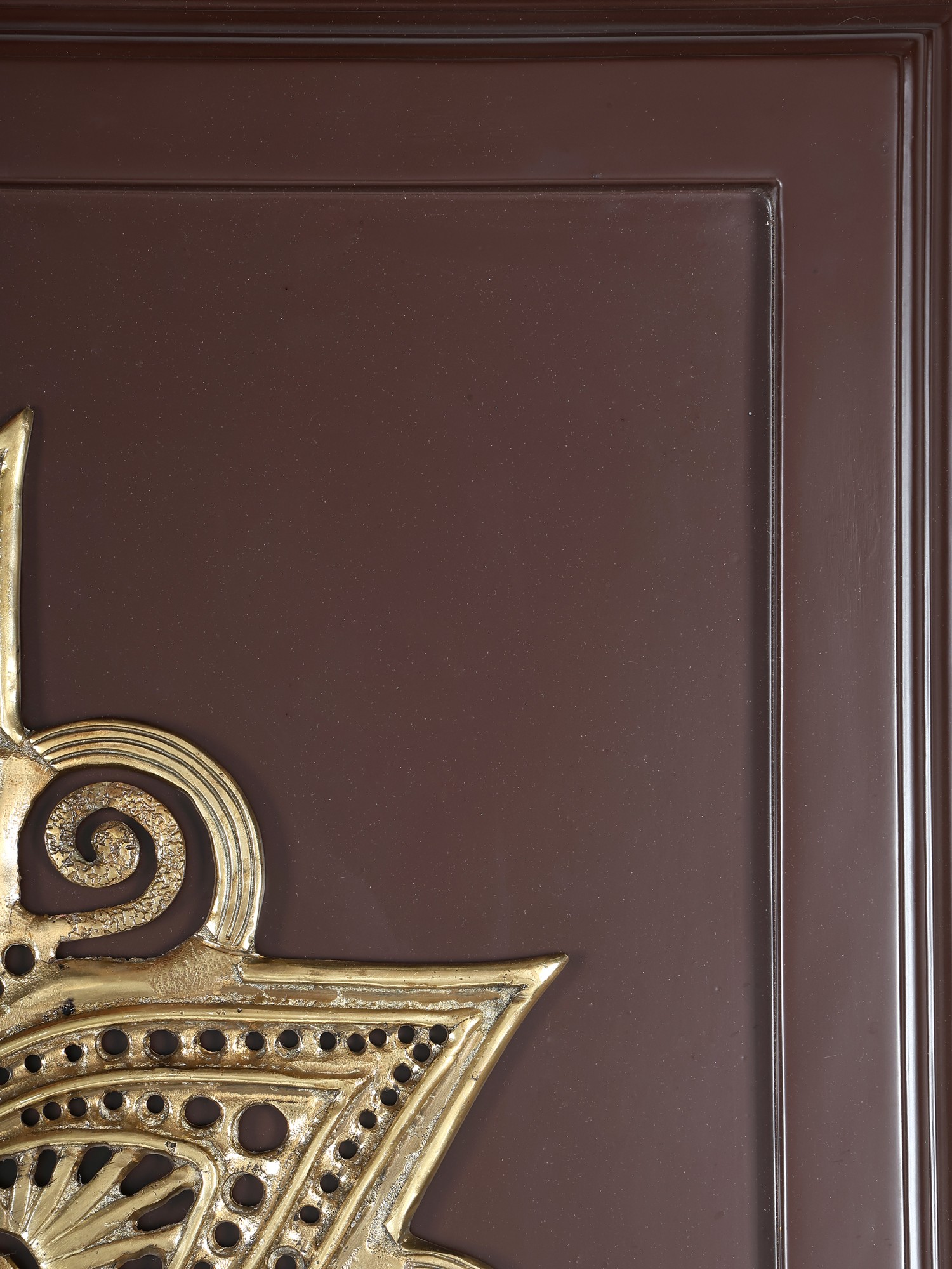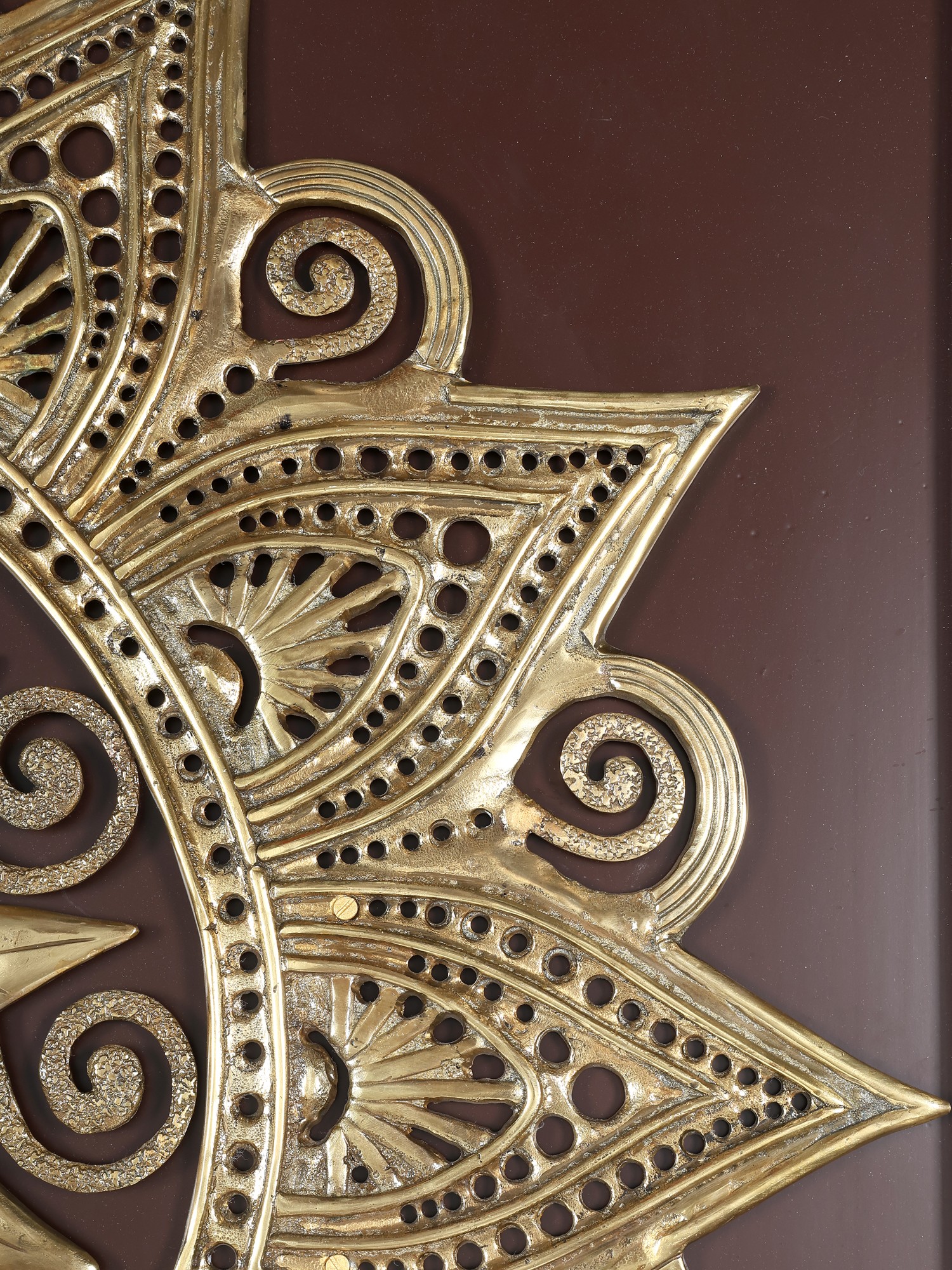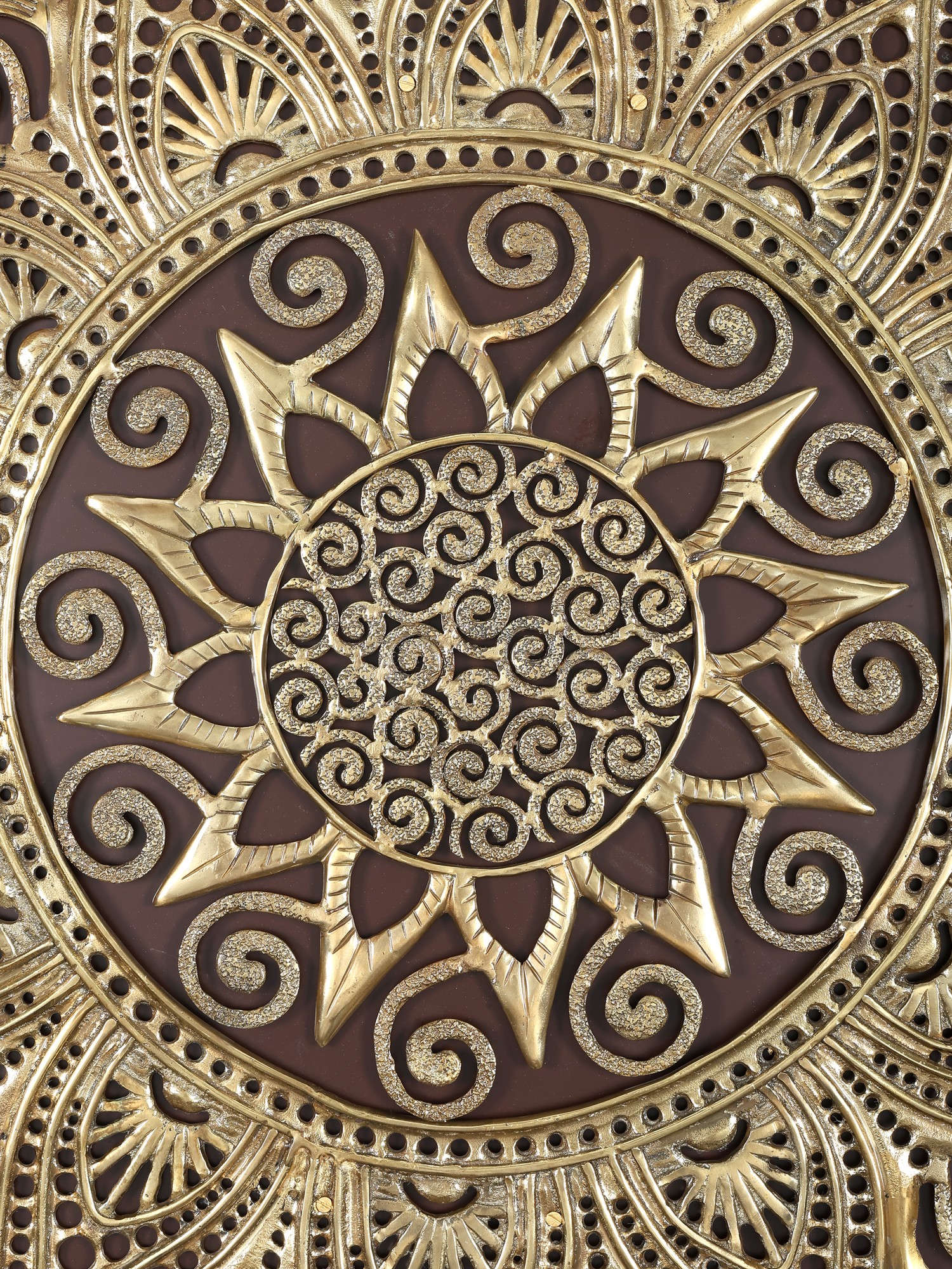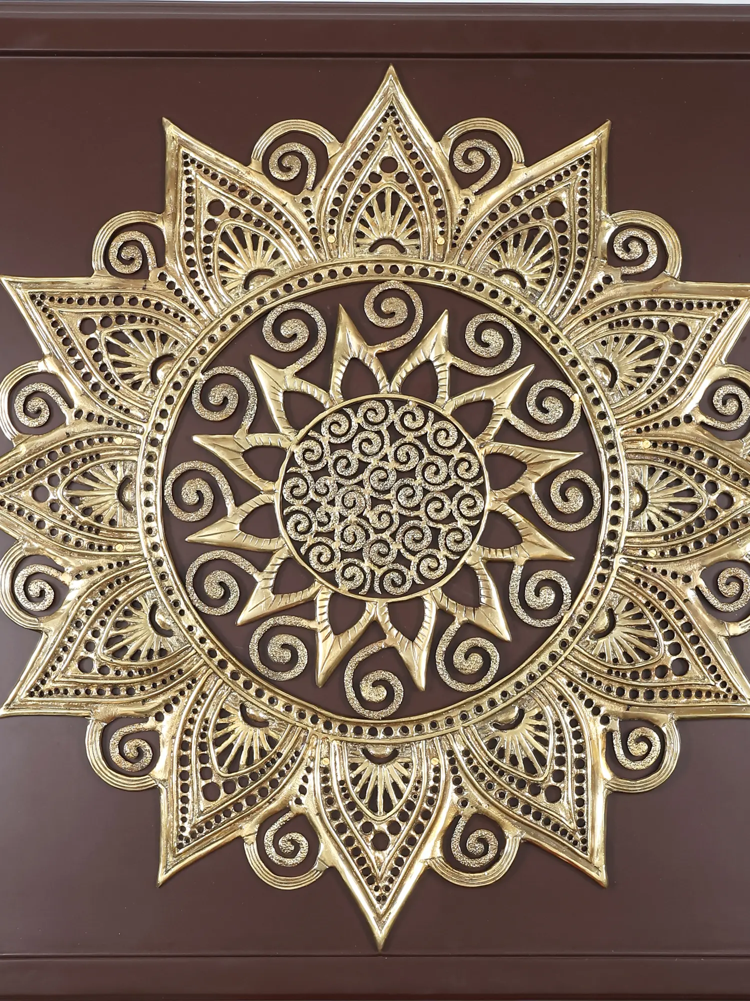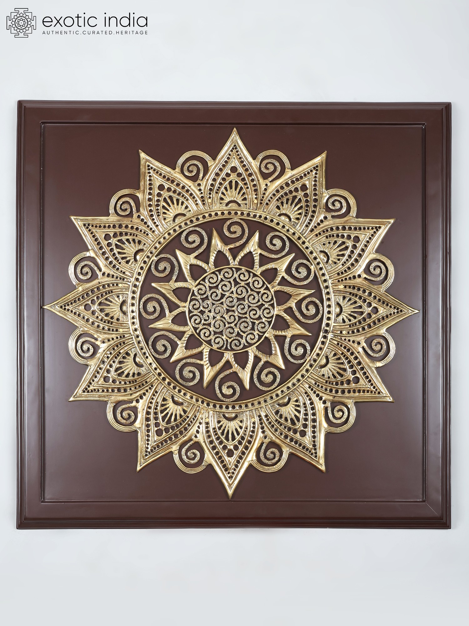 Transform your living space with this captivating wall decor, a stunning blend of traditional artistry and contemporary design. This piece commands attention with its impressive size and intricate details, making it a focal point that enhances any room. The marriage of rich, dark wood with the shimmering elegance of brass creates a visual harmony that complements a variety of interior styles, from bohemian chic to modern minimalist. The striking mandala design, meticulously crafted in brass, is a testament to the artistry behind this unique piece. Each curve and flourish is carefully rendered, resulting in a captivating display of symmetry and balance. The brass material catches and reflects light, adding warmth and dimension to the artwork. The contrast between the metallic sheen of the brass and the deep tone of the wooden frame enhances the mandala's beauty, drawing the eye and sparking conversation.