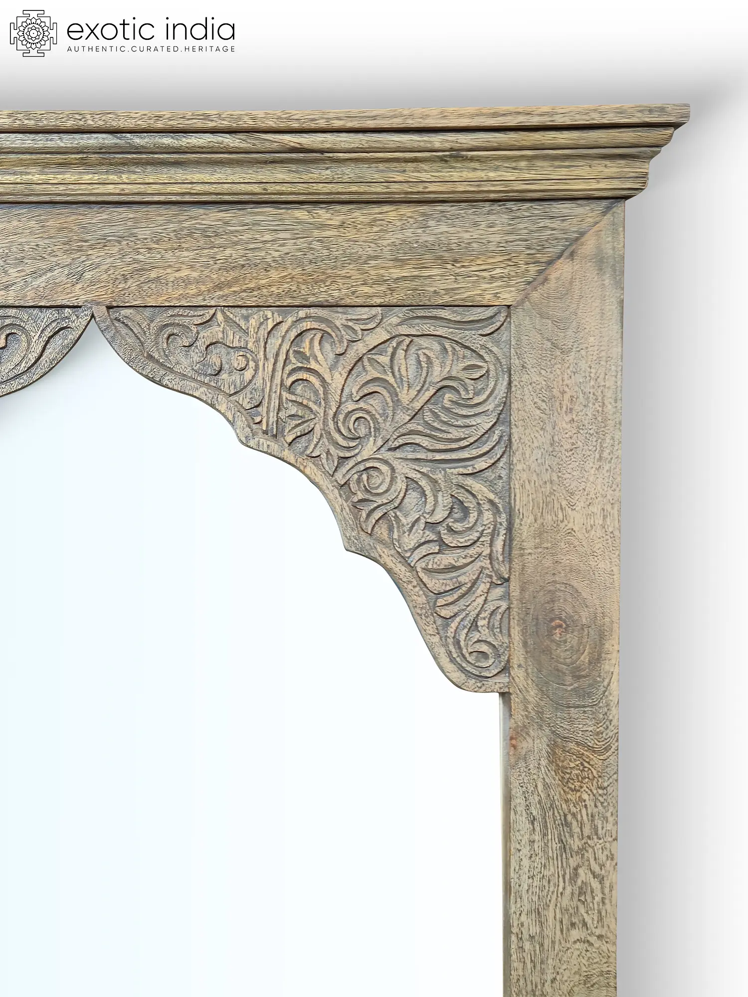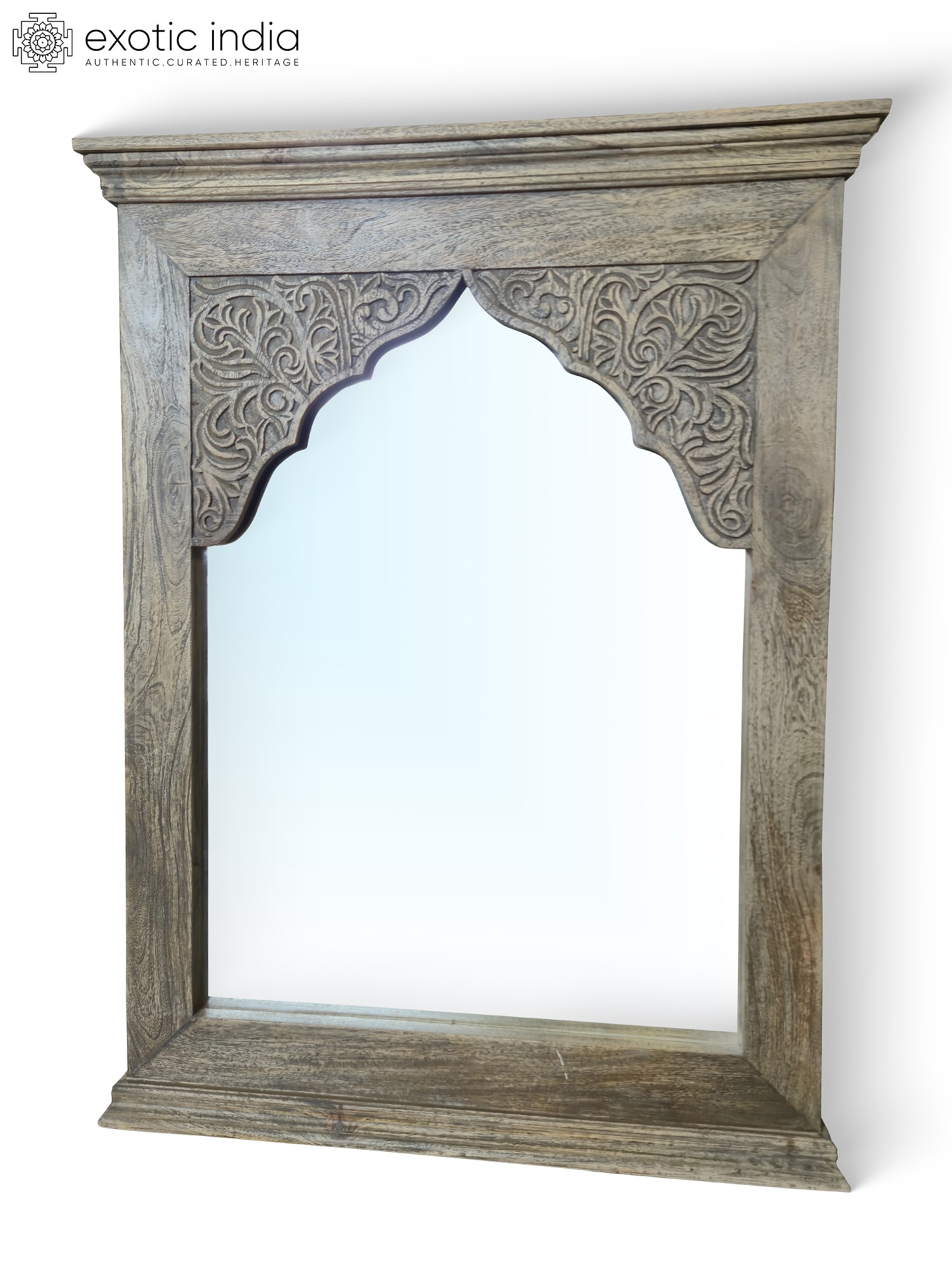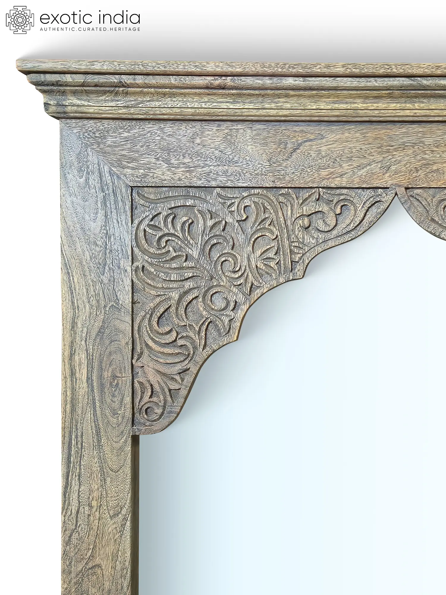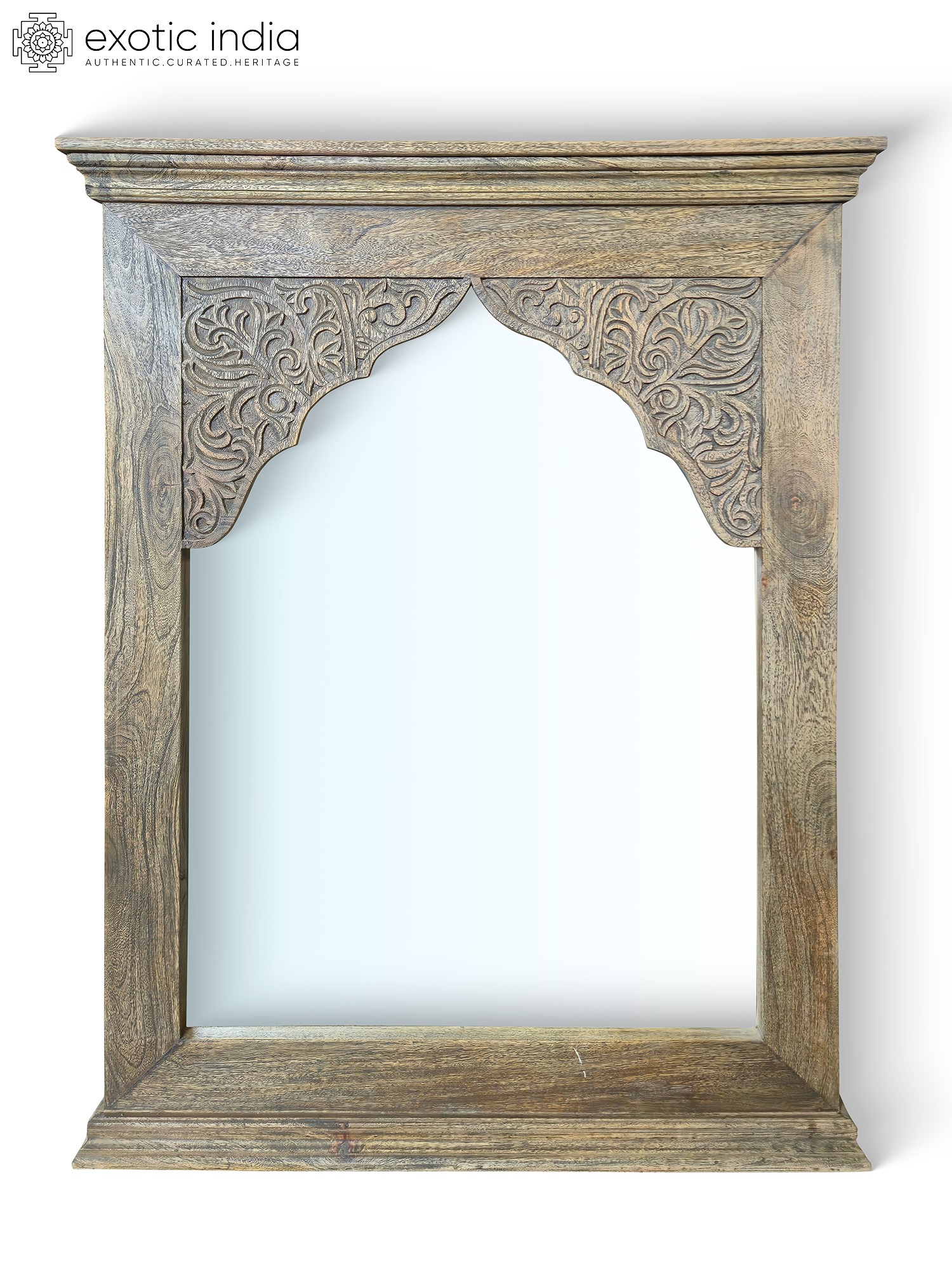Infuse your living space with the timeless charm and artisanal craftsmanship of this exquisite wooden mirror frame. Each detail speaks of a bygone era, meticulously hand-carved to bring a touch of antique elegance into your modern home. The rich texture of the mango wood provides a warm, natural foundation, while the intricate carvings on the upper arch add a captivating focal point that draws the eye and sparks conversation. This is more than just a mirror; it's a statement piece, a conversation starter, and a vessel for your personal style. ––––––––––––––––––