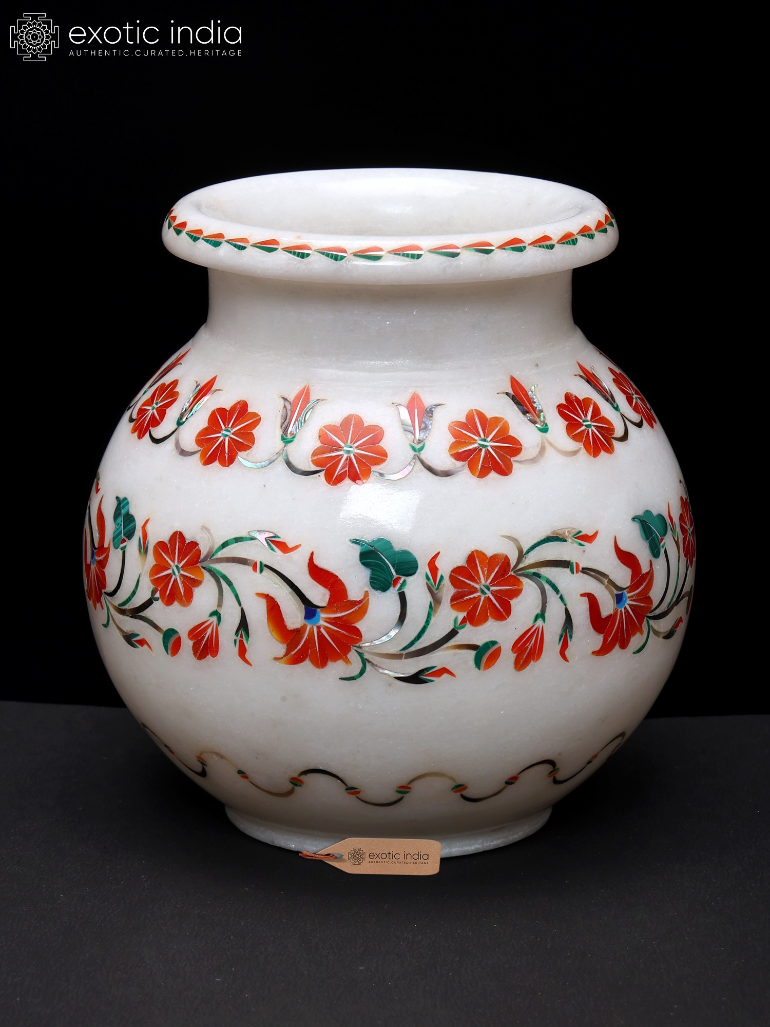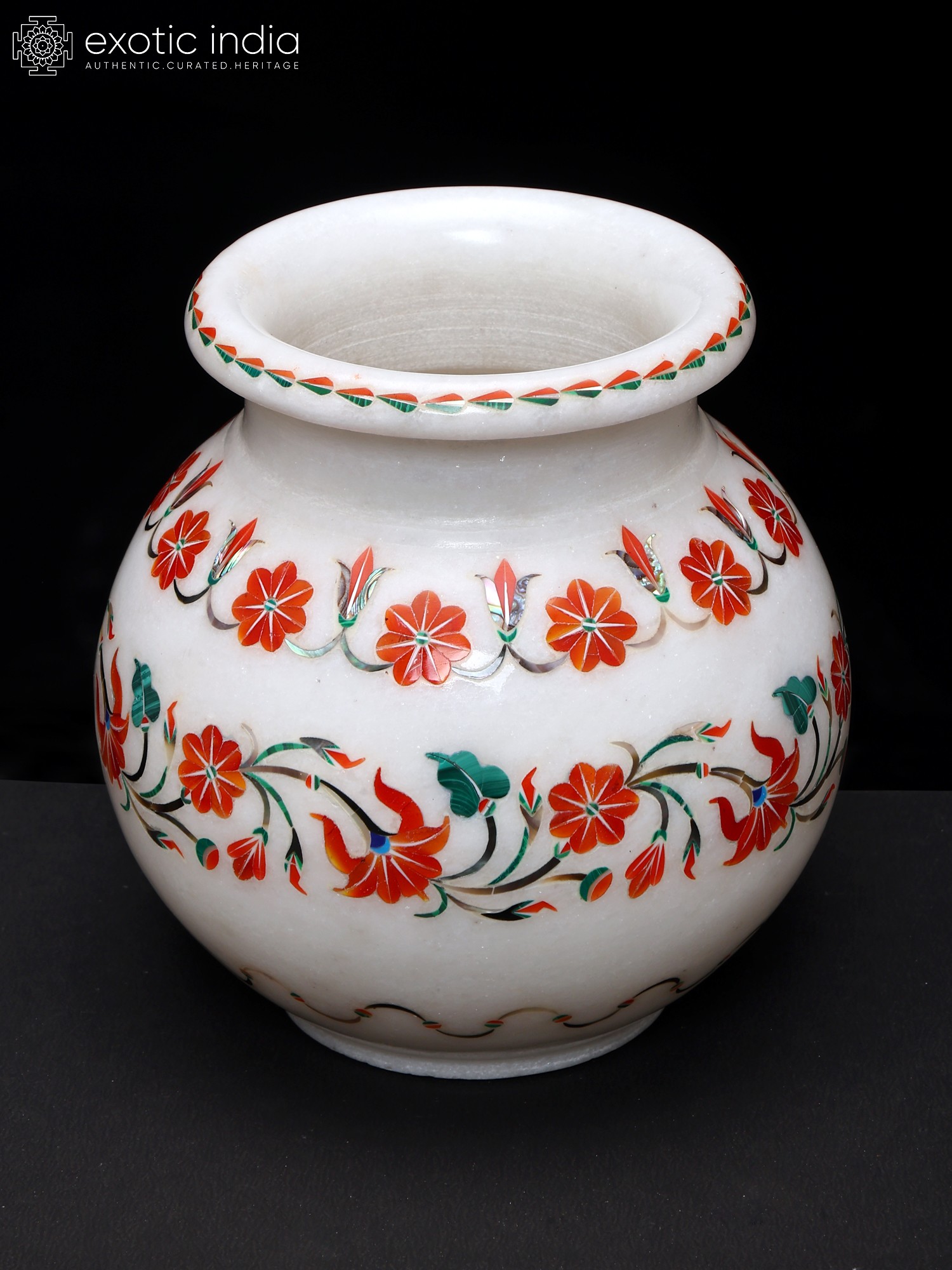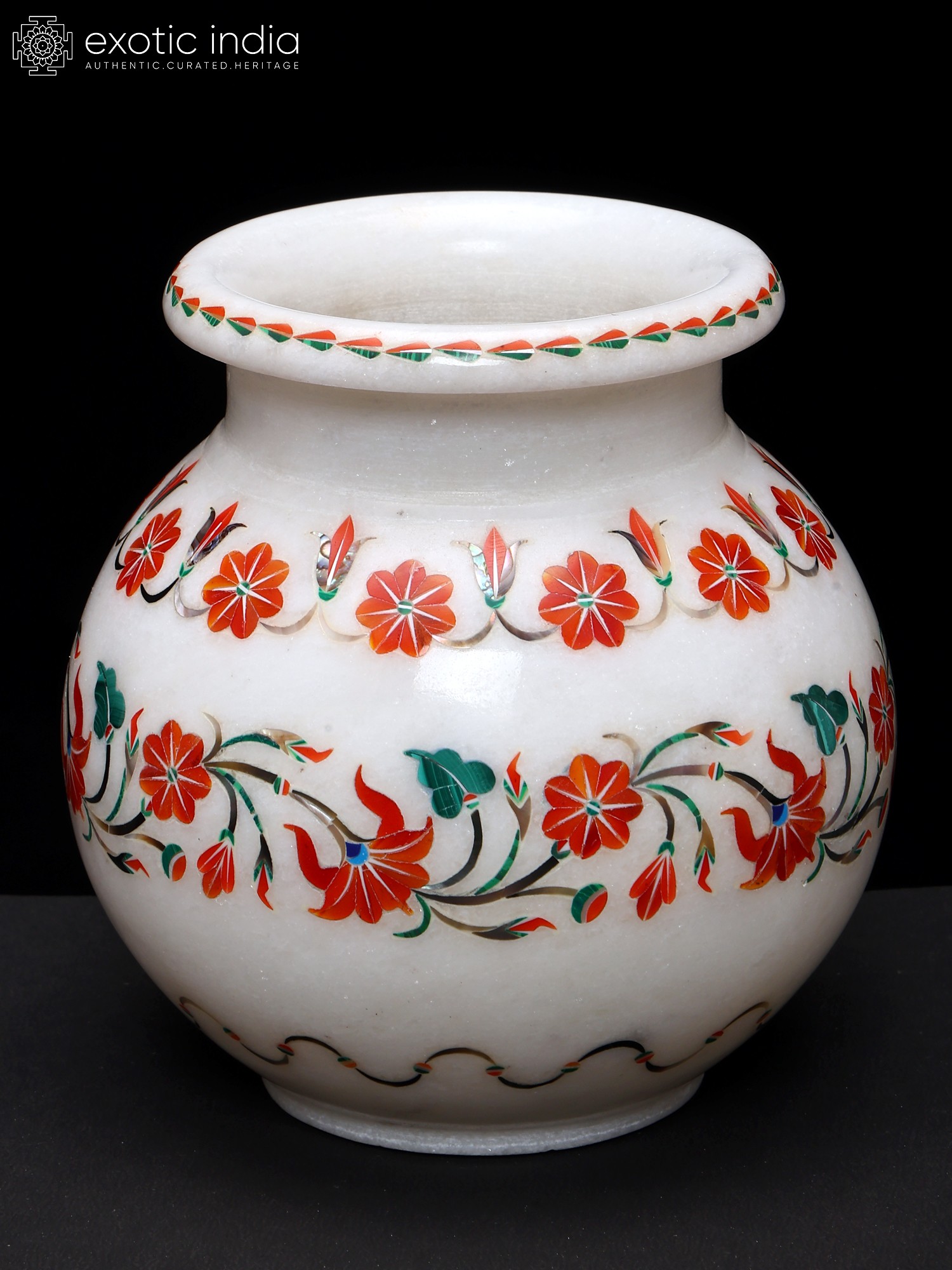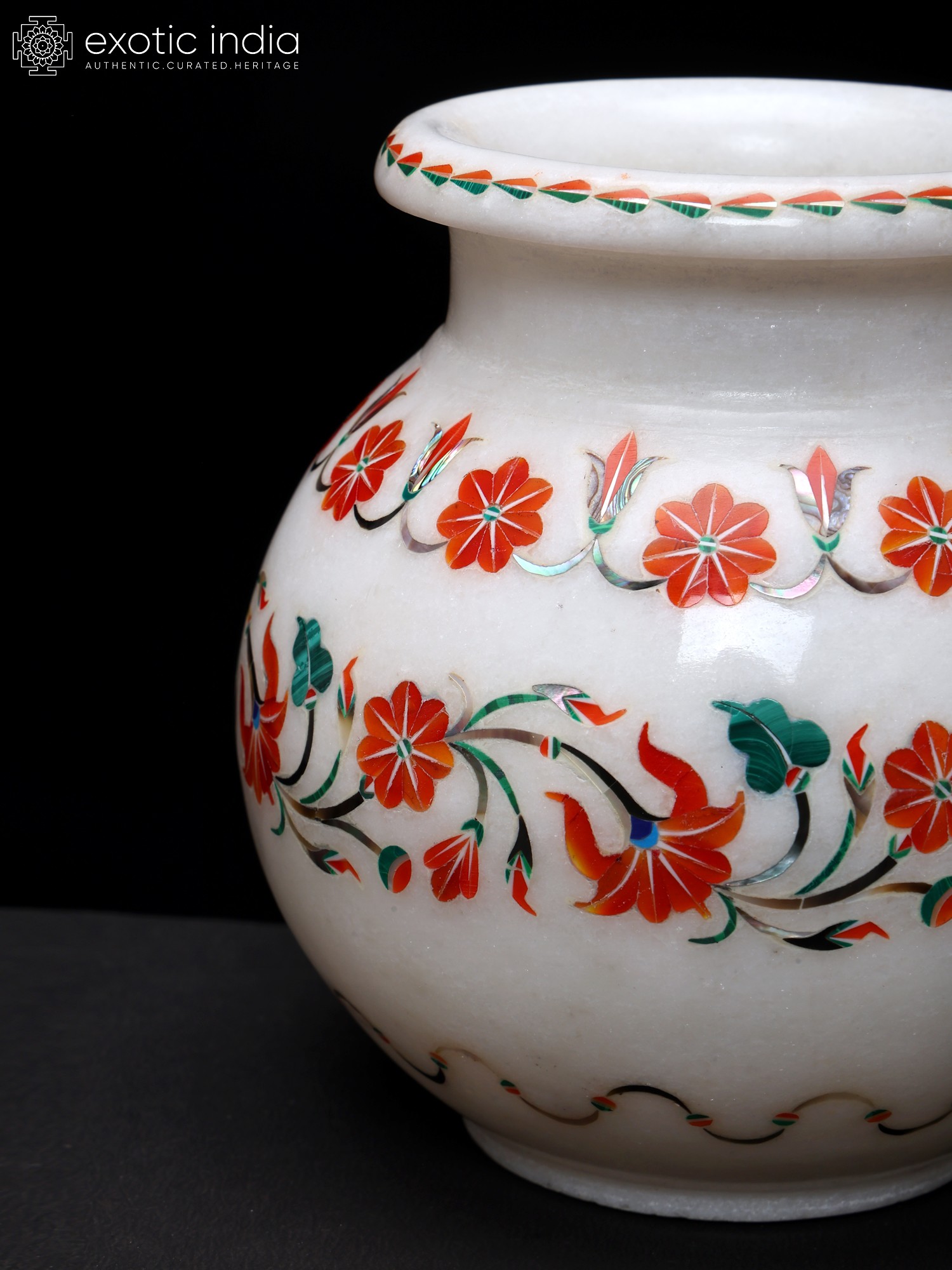 White Marble with Carnelian and Malachite Semi Precious Stone Inlay