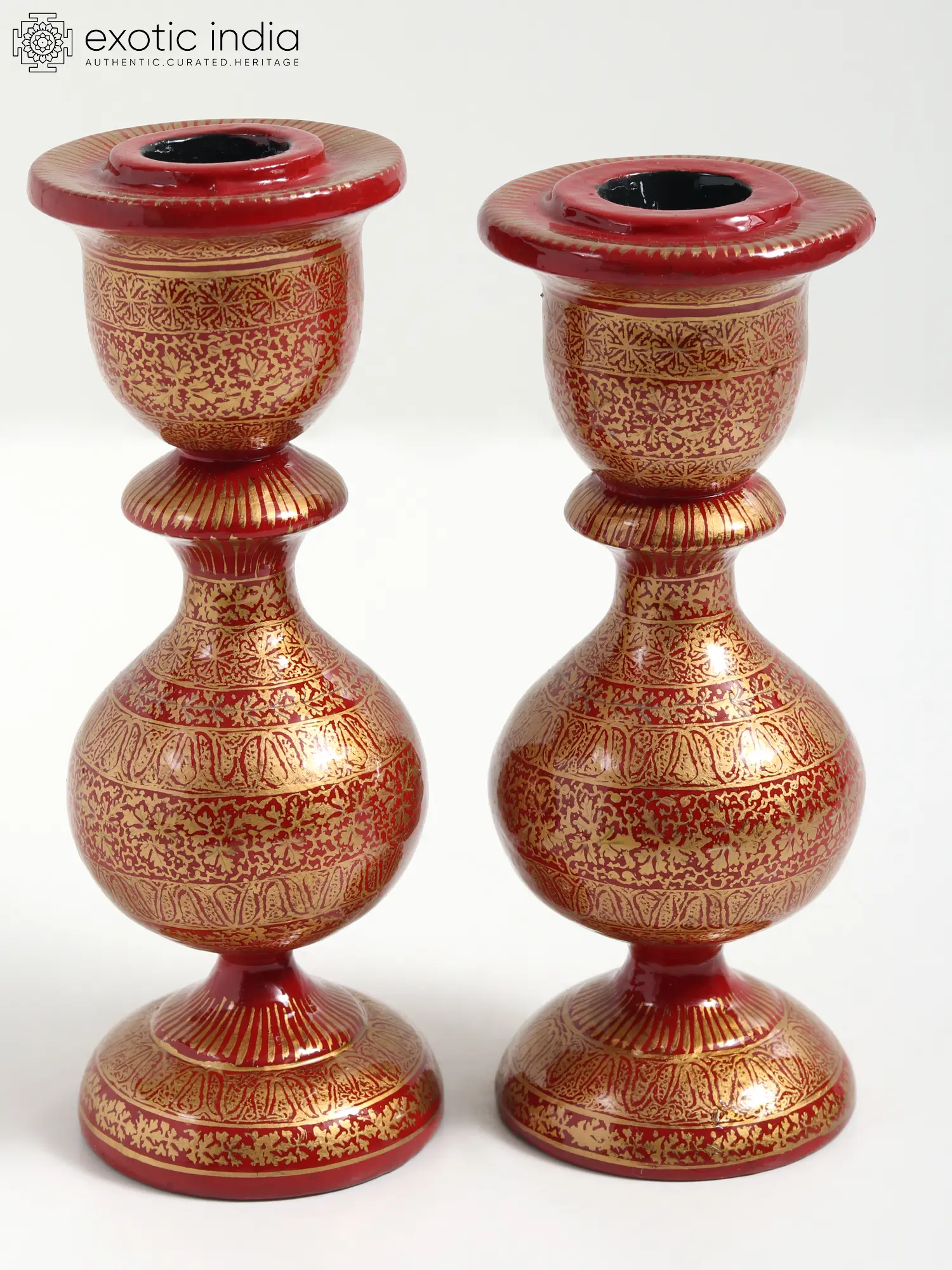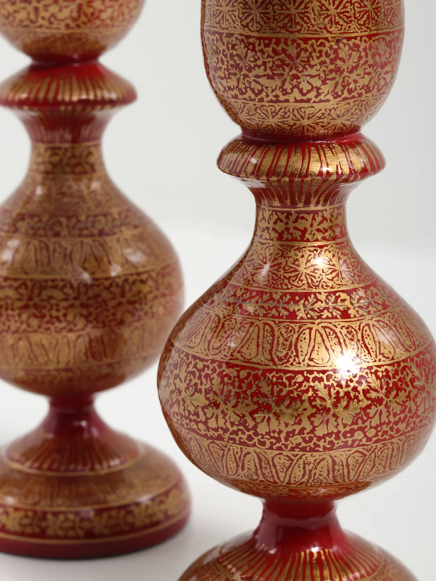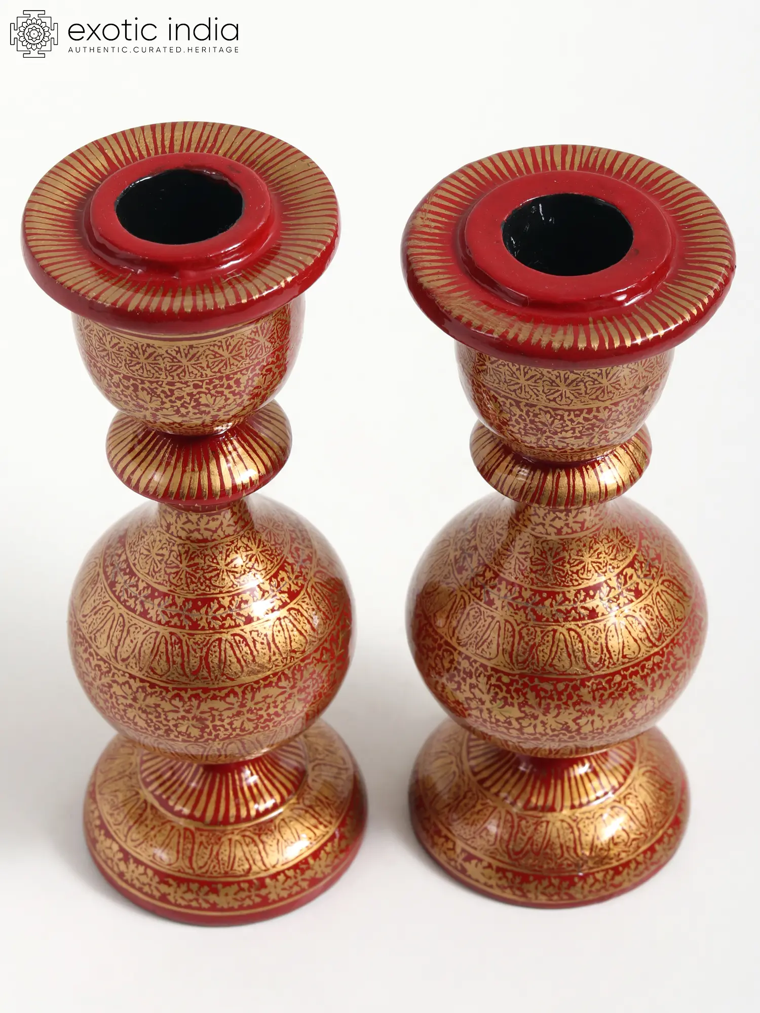 This Pair of Hand-Painted Papier Mache Candle Holders from Kashmir exudes regal charm with their vibrant red color and fine gold-colored decorations. Each holder is meticulously crafted, showcasing the rich tradition of Kashmiri papier mache artistry.