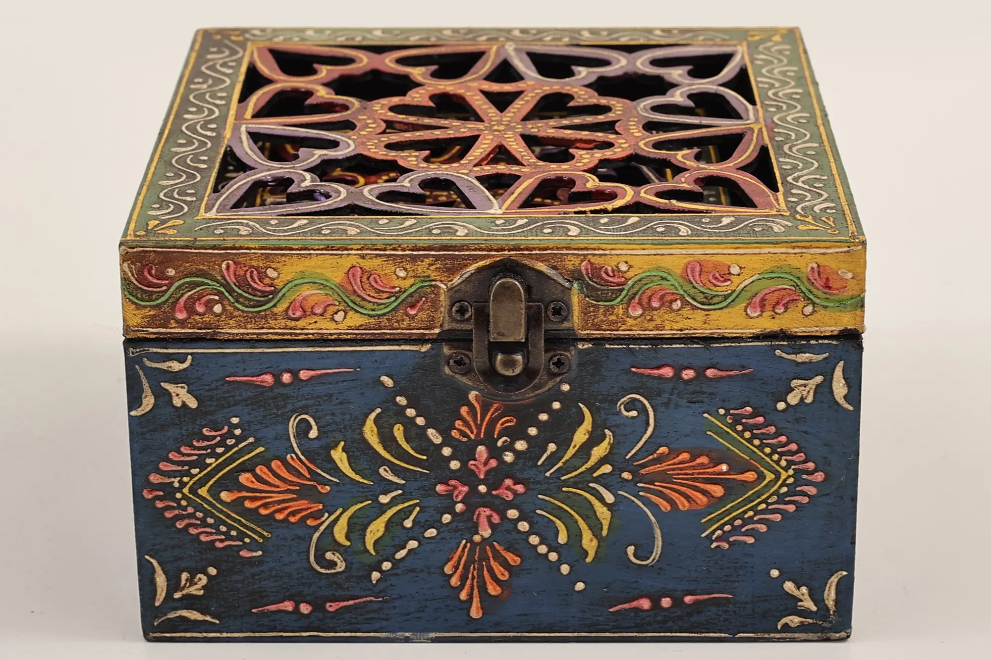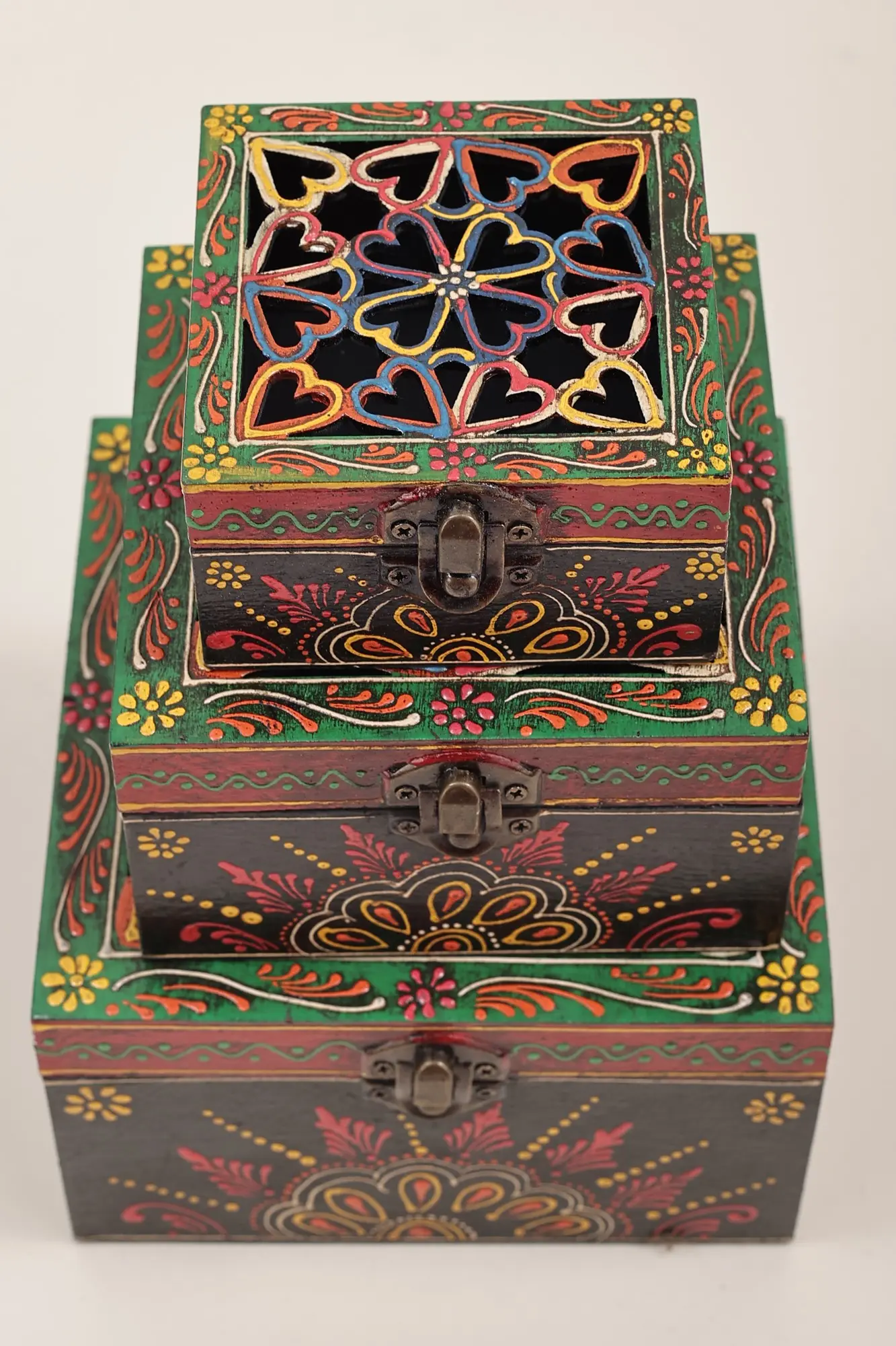 This Set of 3 Hand Painted Lattice Decorated Boxes, is where artistry meets functionality. Each box boasts a top adorned in the timeless lattice or Jaal style, adding a touch of traditional charm to your space. The vividly painted surfaces in bright hues create an eye-catching appeal. Embracing the Jodhpur style, the boxes feature meticulous dots and lines in white, enhancing their visual allure. These versatile containers seamlessly blend form and function, offering not only storage but also serving as exquisite decorative pieces. Elevate your decor with this set, a testament to the fusion of cultural aesthetics and practical design.